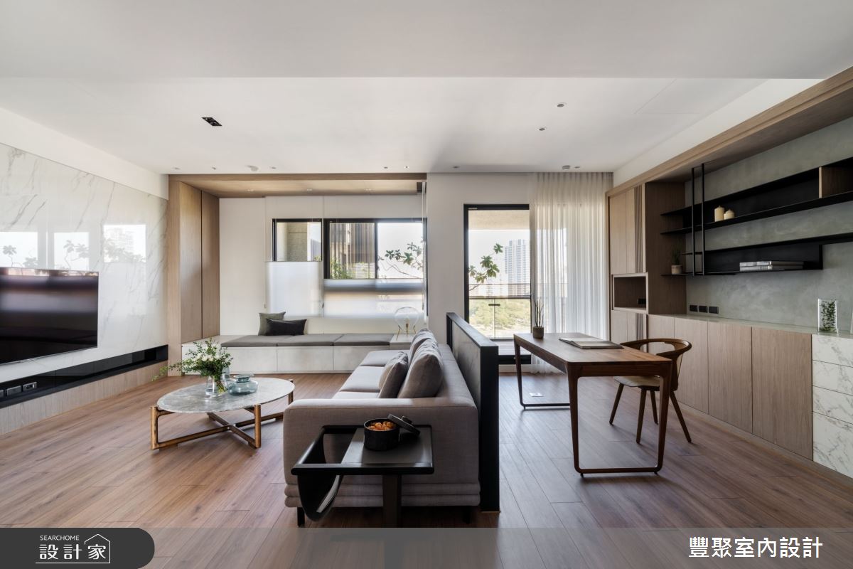 本案為豐聚室內設計的43坪現代風新成屋(5年以下)設計作品,格局為單層三房的居住空間。居住成員包含2位大人、1位小孩。全室建材的搭配,應用壁紙、鐵件、鋼刷木皮、系統板材、石材,展現溫馨的居家氛圍。
