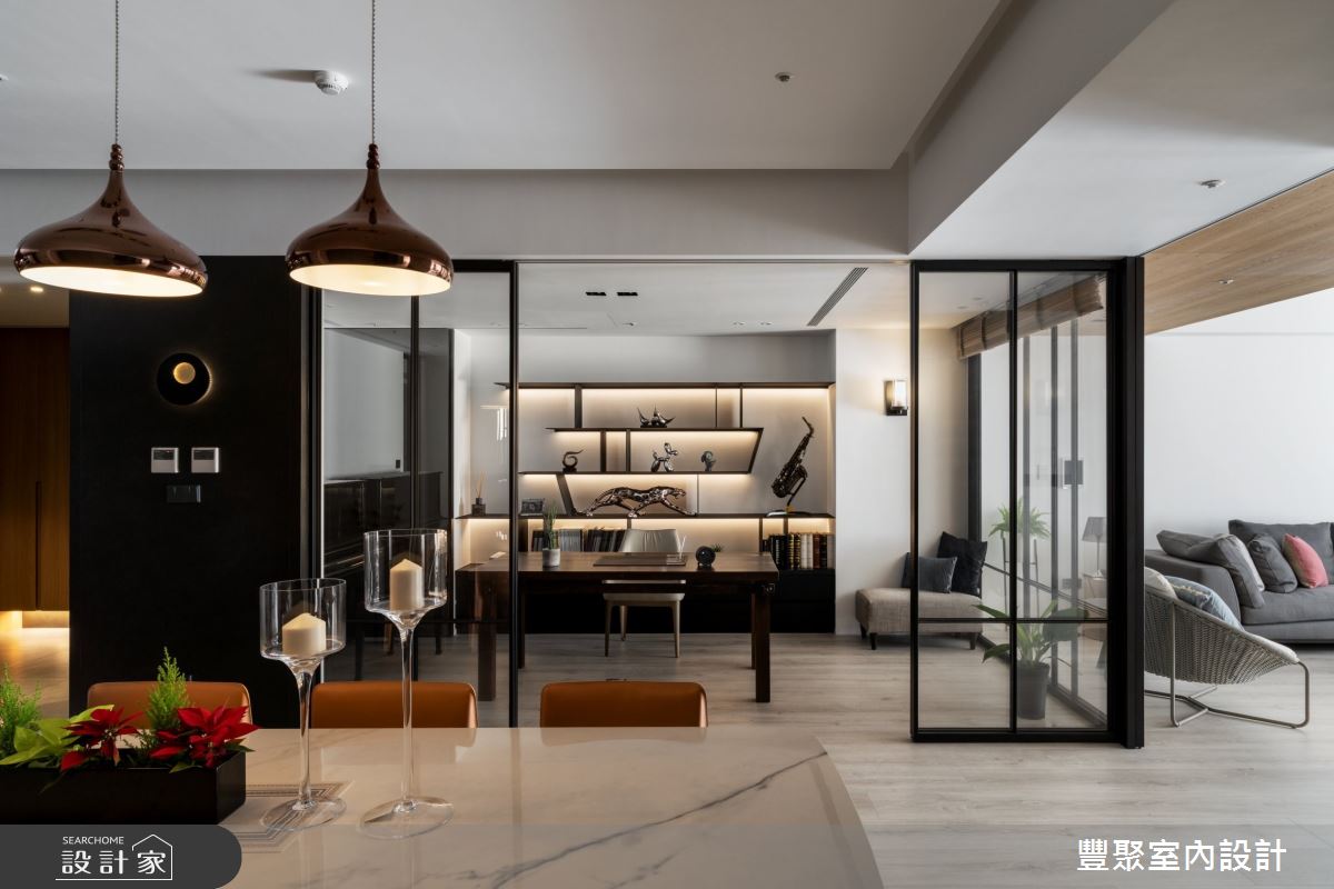 38 坪現代風居家,設計師考量到家有幼孩,在空間內擘劃安全、好活動的動線機能,並維持公共領域的開放性,讓全家人可隨時保有互動,打造出最適合屋主一家的空間景致,快跟著小編一起來看看吧! 格局上,將原本的三房變為兩房,把電視牆後方的房間改為書房,並瓦解側邊的實牆,運用鐵件、玻璃打造穿透感隔間,不只使居家空間感放大,也讓光線可引導至餐廳、延續到廚房,形成生活中的明亮感;同時在廚房增設中島,劃出迴字型動線,就連玄關、餐廳之間也留有空隙,讓每個區域都保有互動關係,而餐桌則採用訂製家具,並增設實用電器櫃、增添收納機能;色彩規劃上,以低彩度為基底,使用義大利進口特殊漆創造手作肌理,與電視主牆大理石的自然紋理相呼應,再援引窗外的日光,使用簡潔俐落的線條做勾勒,形塑出明亮通透的生活景況。 小編的最愛 透過透明隔間的界定,讓餐廳、書房二者可保有高互動,讓大人可一邊料理或用餐、一邊照看到孩童在書房的活動情況!