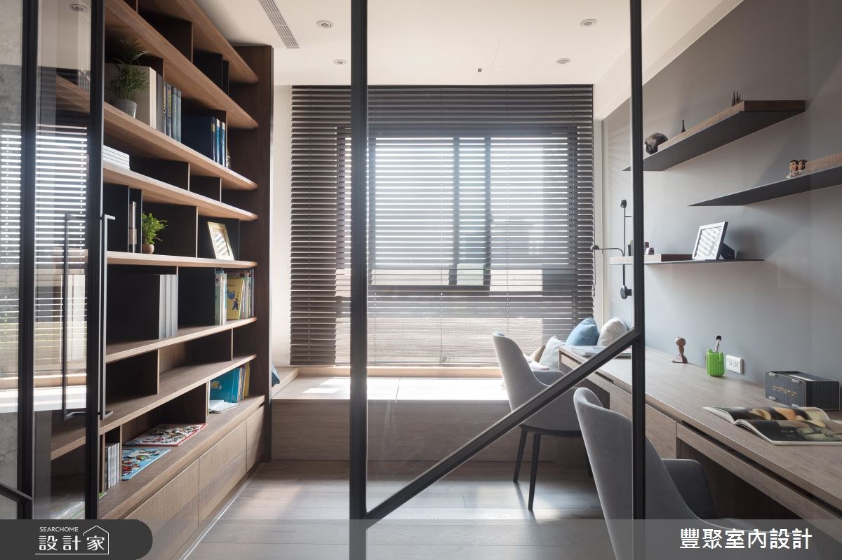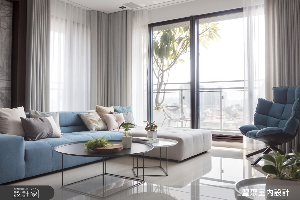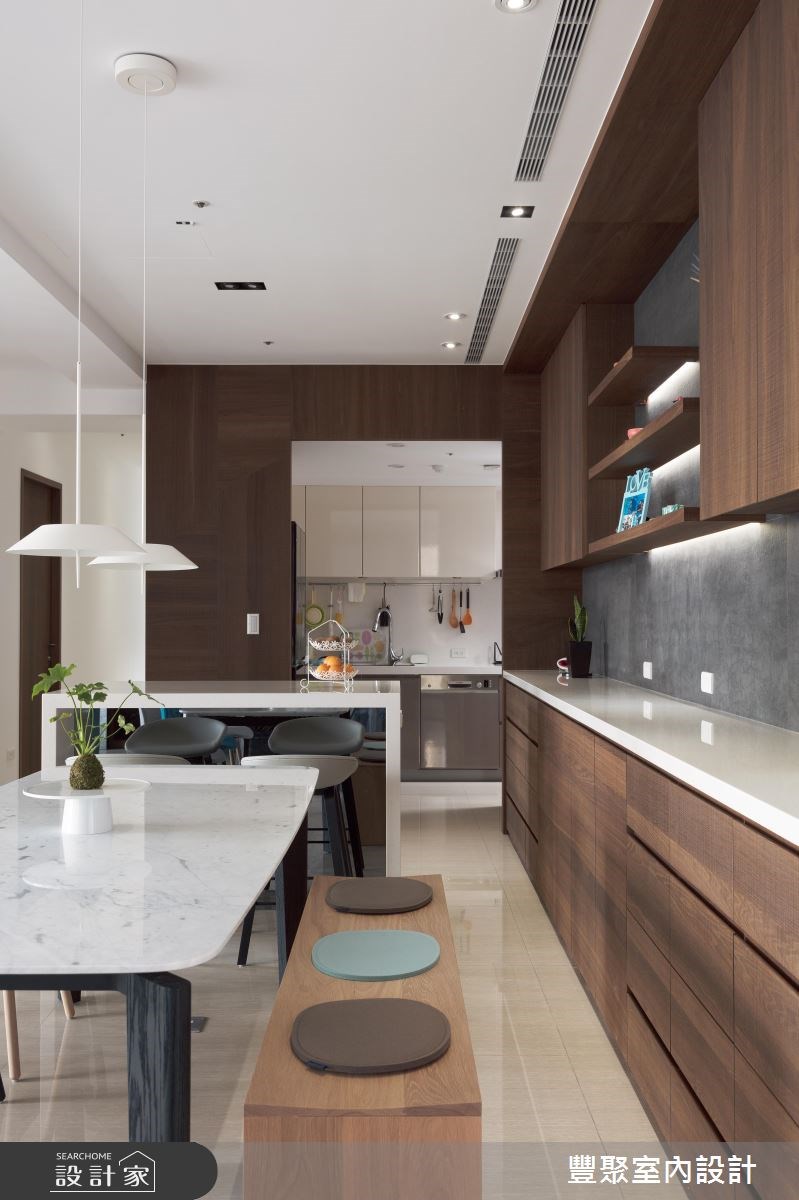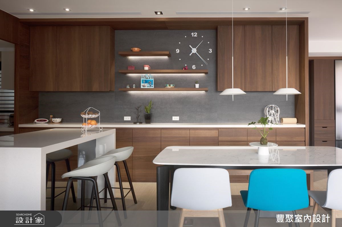 以淡雅的色系為基底,L型的絕佳採光面,醞釀一抹現代簡約的迷人風尚,沁藍成為空間裡最獨特的神采,畫龍點睛,且調和出舒壓、放鬆的家居氣息;沉穩大地色系則保留在餐桌領域,自然的原始質感與配色,替用餐氛圍增添溫暖情懷。 冬日暖陽從陽台引進室內,伴隨戶外的城市風光與綠意植栽,替家居生活挹注清新、自然的生命力,乘坐沙發上,愜意眺望遠方風景,心胸也隨之開闊。灰色、漸層紋路的石英石舖陳出電視牆造型,立面延伸至天花板,更添非凡器度;沙發後方的造型牆成為公領域的核心基準,兩側以石英石打造,中央利用層板搭建展示空間,以十字型交織立面造型,再搭配嵌燈設計,創造出新穎的視覺亮點,同時界定出客、餐廳領域;電視牆的側邊以玻璃、鐵件打造格屏,延伸至後方的書房,木作飾底的空間裡,藉由輕水模主體牆與木作層板搭建的書櫃,調和出自然樸實的閱讀環境,同時滿足屋主大量的書籍和收藏品的擺設需求,臨窗臥榻區更兼具休憩與閱讀姿態的轉換。 小編的最愛 餐廚區植入深咖啡色系原木質感,注入溫潤、沉穩的氣息,與白色調的桌面、中島與平台形成強烈對比;餐櫃上方結合展示層板與時鐘,營造出活潑、生動的空間樣貌。