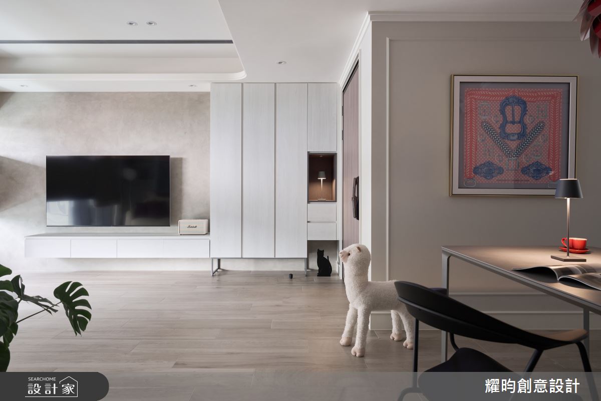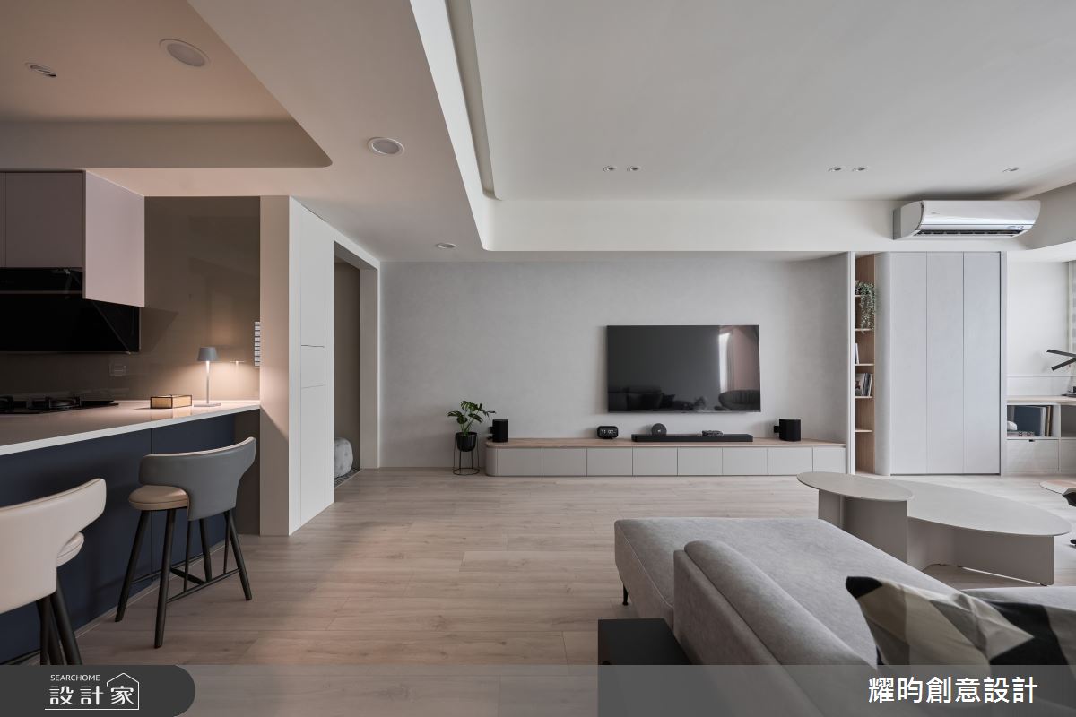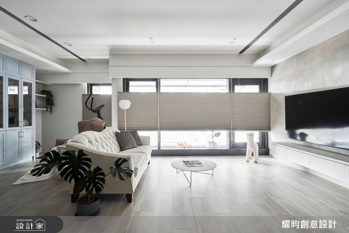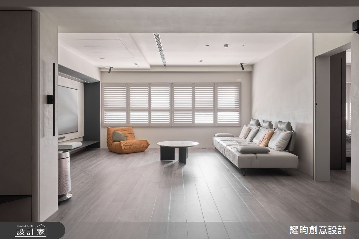 耀昀創意設計以乳膠漆、超耐磨木地板、烤玻、系統板材、磁磚、木百葉的搭配應用,呈現美式風居家氛圍,將此間36坪、四房、單層、新成屋(5年以下)打造成舒適愜意的家庭空間,完成2位大人、2位小孩全家人的夢想之居。