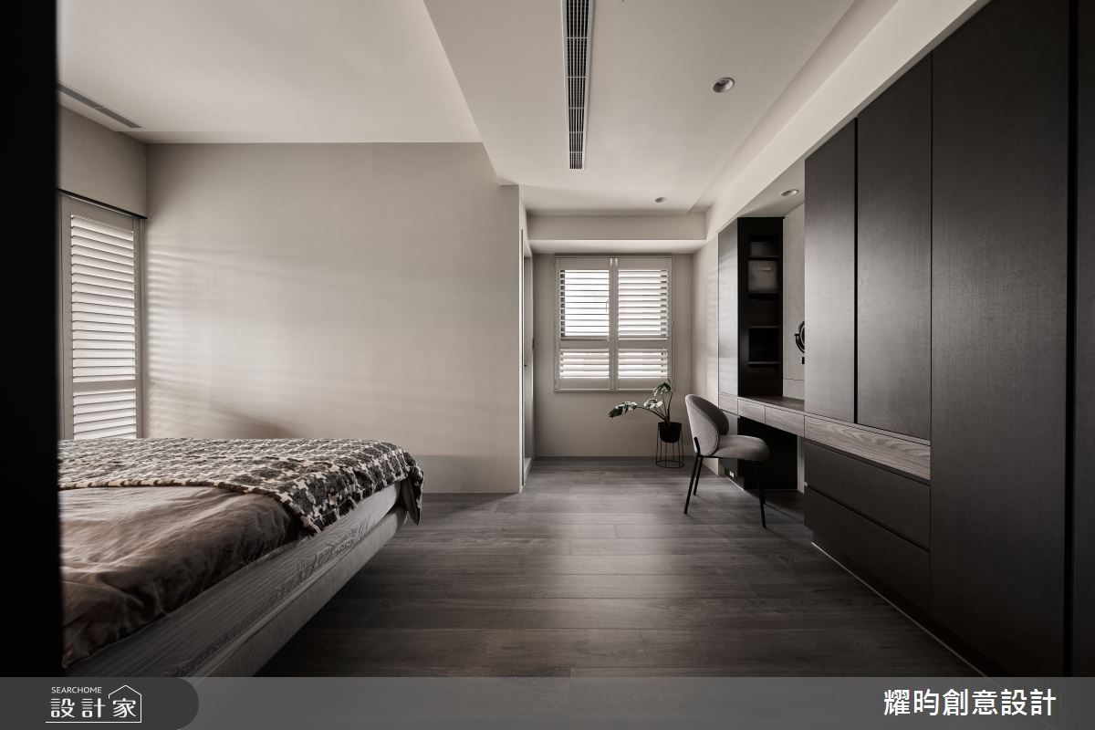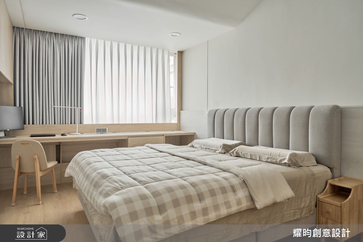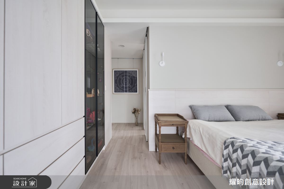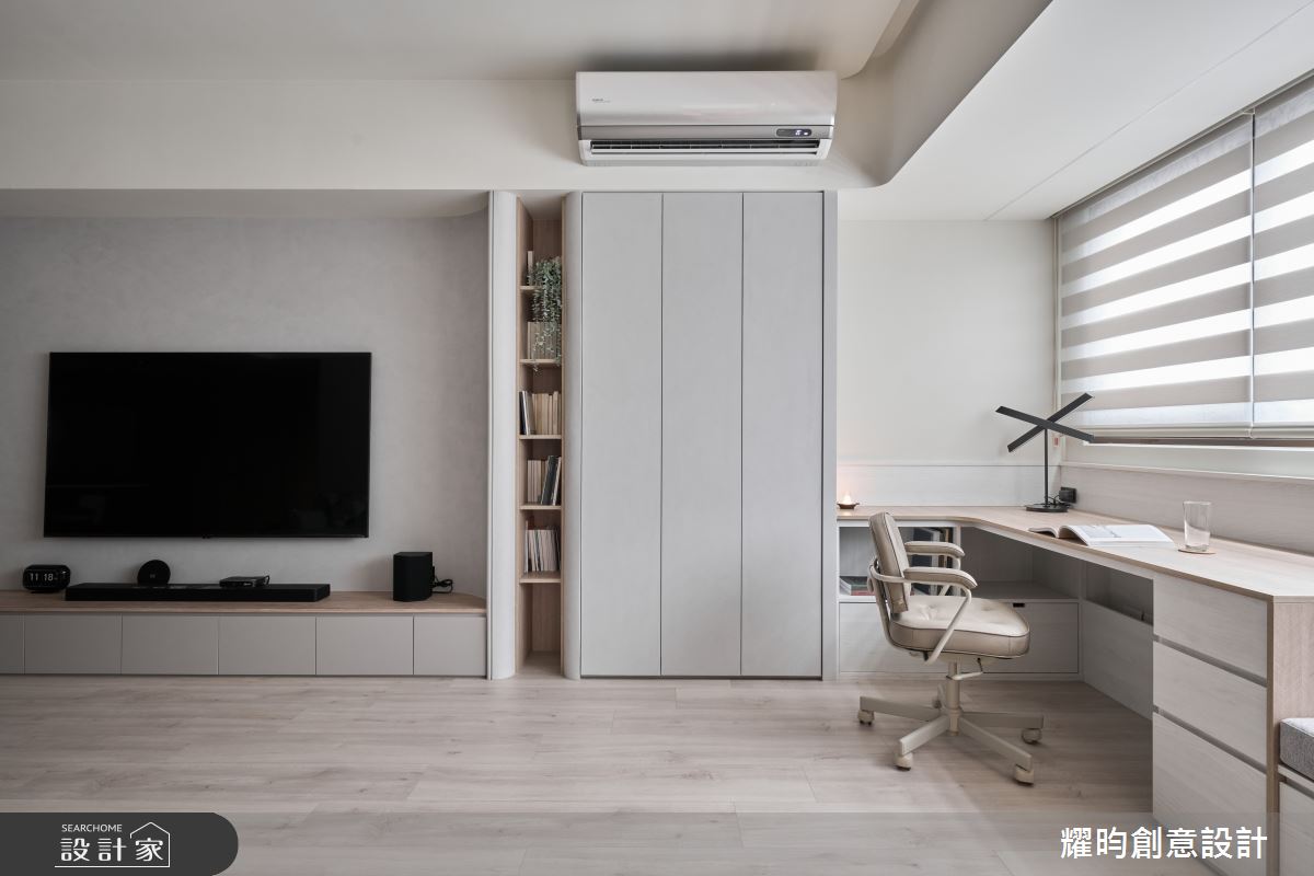 耀昀創意設計以乳膠漆、超耐磨木地板、烤玻、系統板材、磁磚、木百葉的搭配應用,呈現美式風居家氛圍,將此間36坪、四房、單層、新成屋(5年以下)打造成舒適愜意的家庭空間,完成2位大人、2位小孩全家人的夢想之居。