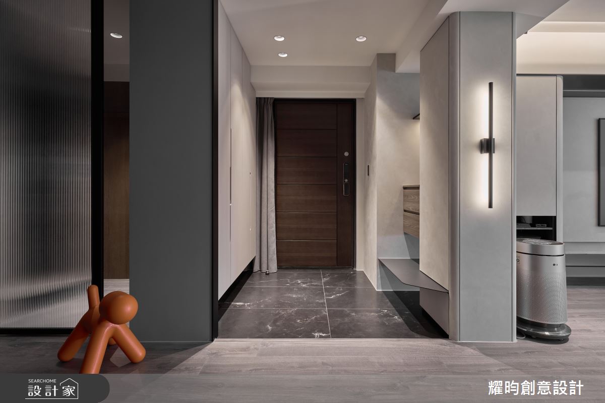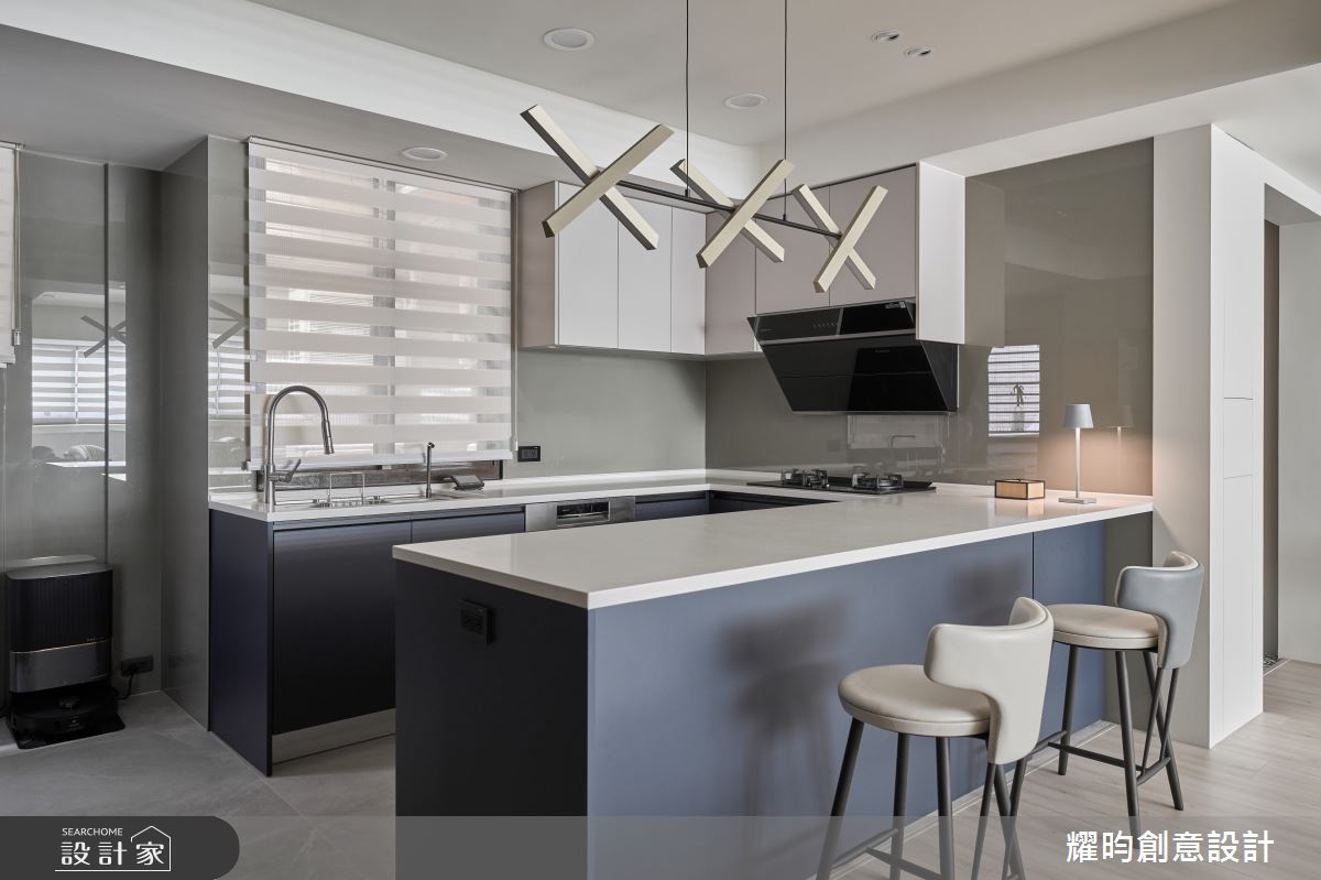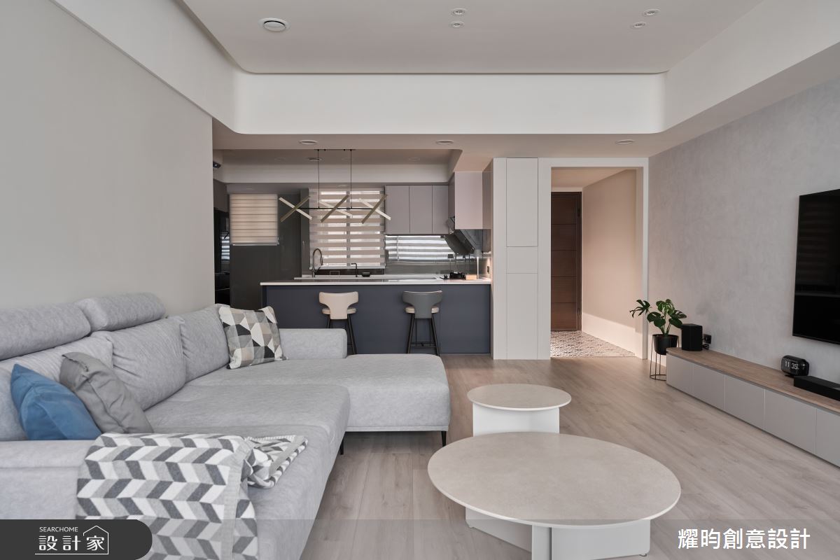 本案為耀昀創意設計的60坪現代風新古屋(10年以下)設計作品,格局為雙拼戶四房的居住空間。居住成員包含2位大人、2位小孩。全室建材的搭配,應用乳膠漆、花磚、超耐磨木地板、鐵件、灰鏡、烤玻、系統板材、磁磚、木百葉、軌道燈,展現溫馨的居家氛圍。