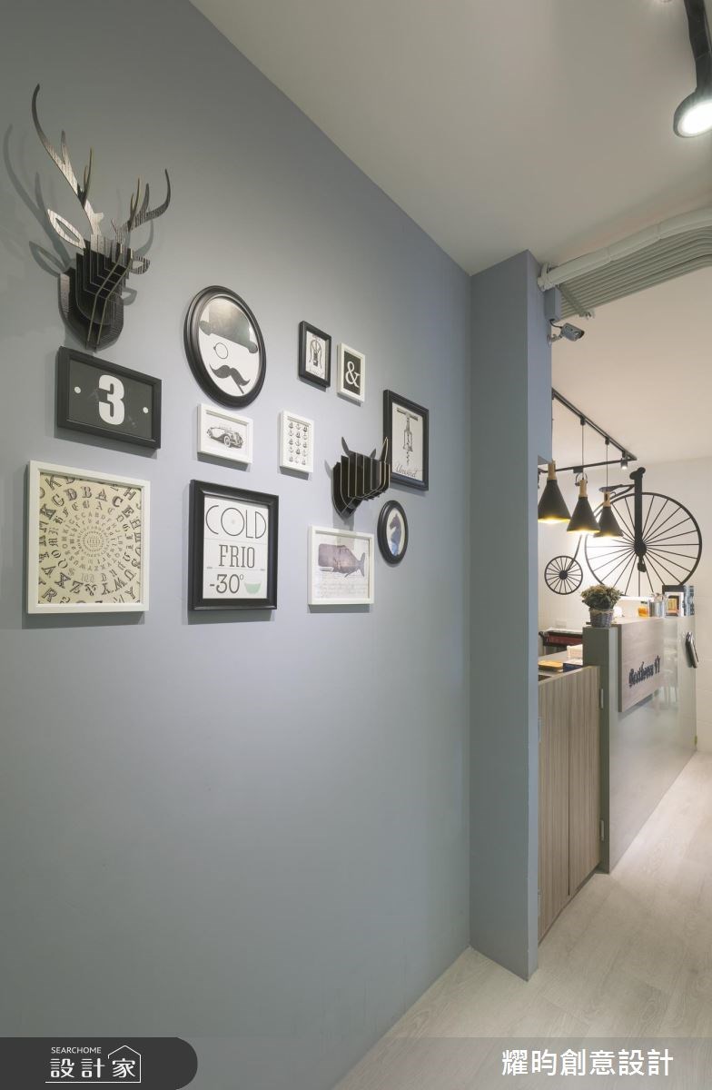耀昀創意設計以乳膠漆、PVC地板、鐵件、烤玻的搭配應用,呈現北歐風的風格氣息,將此間52坪老屋(31~40年)優雅詮釋成舒適愜意的商業空間。