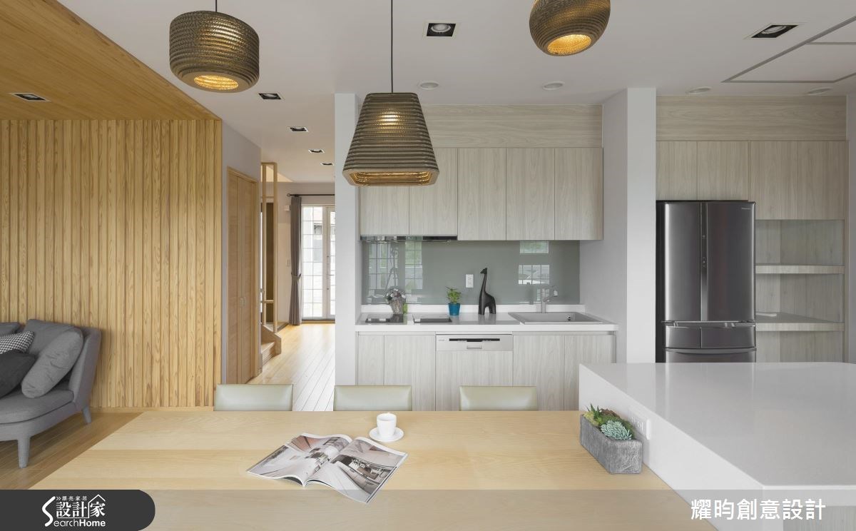 由耀昀創意設計精心規劃的70坪五房住宅空間,家庭成員一共有2位大人、3位小孩。因應屋主需求,設計師運用北歐風作為主軸,搭配乳膠漆、鐵道磚、花磚、磁性漆/磁性黑板漆、超耐磨木地板、木紋磚、鐵件、灰鏡、烤玻、木作貼皮、系統板材、磁磚、木百葉、線板、噴漆,打造全家人的夢想家居。