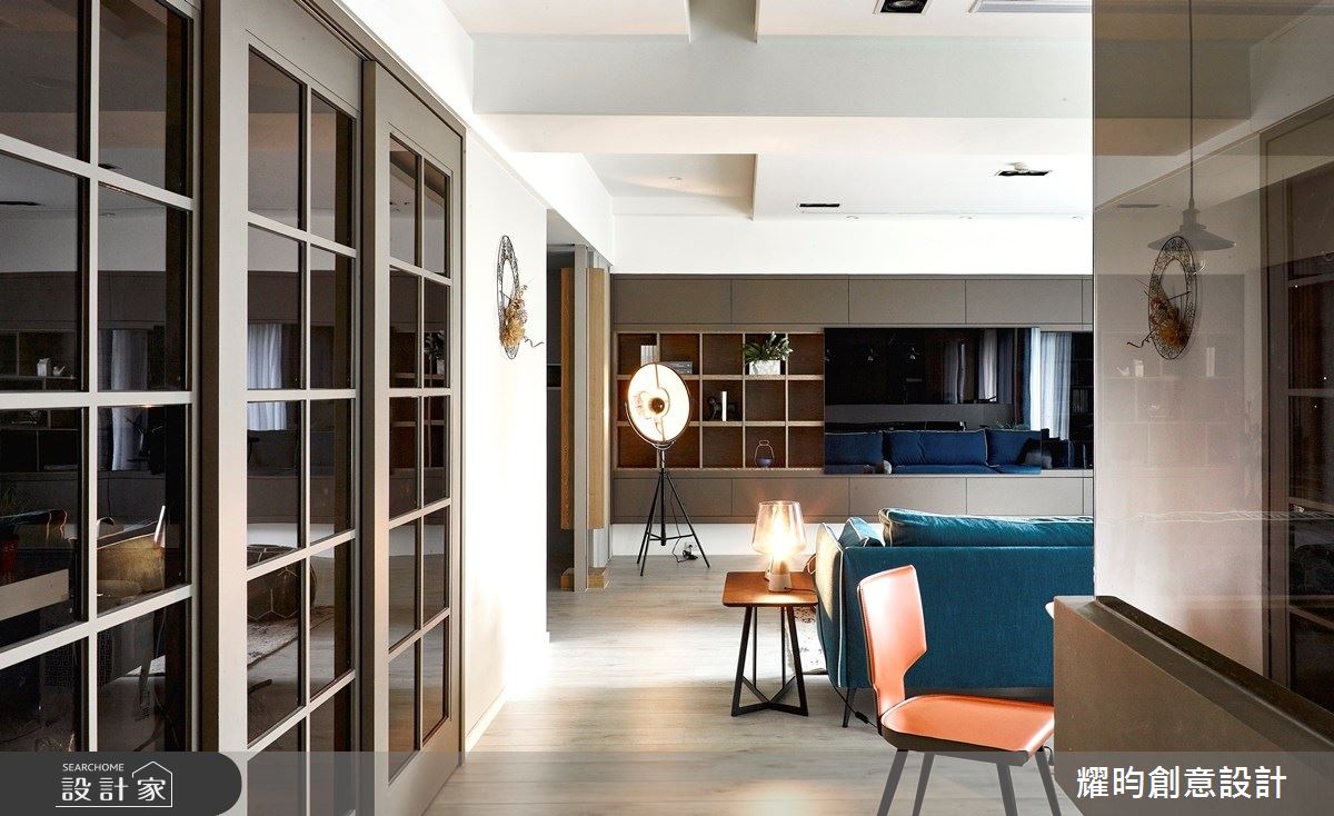 本案為耀昀創意設計的60坪現代風新古屋(10年以下)設計作品,格局為雙拼戶四房的居住空間。居住成員包含2位大人、2位小孩。全室建材的搭配,應用乳膠漆、花磚、超耐磨木地板、鐵件、灰鏡、烤玻、系統板材、磁磚、木百葉、軌道燈,展現溫馨的居家氛圍。
