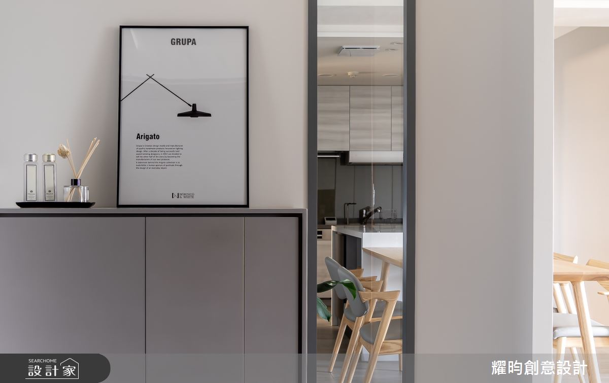 本案為耀昀創意設計的36坪北歐風新成屋(5年以下)設計作品,格局為單層四房的居住空間。居住成員包含2位大人、1位小孩。全室建材的搭配,應用乳膠漆、木紋磚、灰鏡、木作貼皮、烤漆、系統板材、磁磚、石材、噴漆,展現溫馨的居家氛圍。