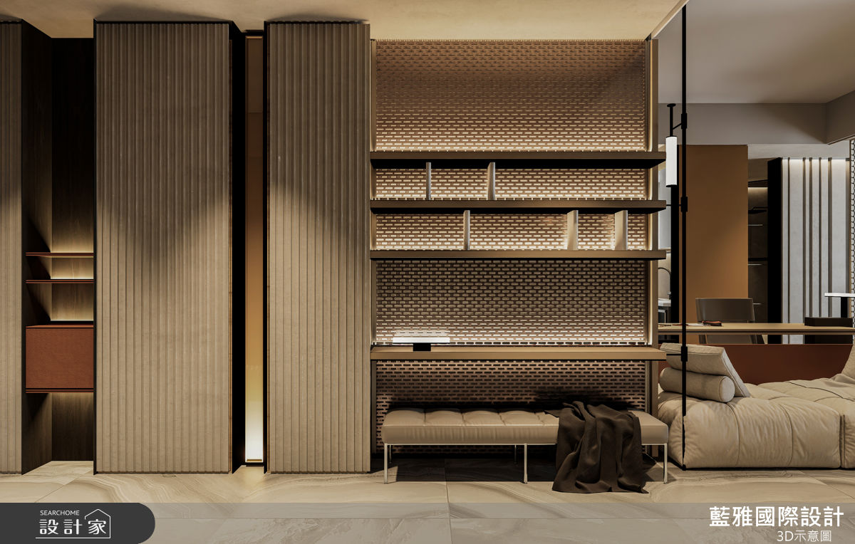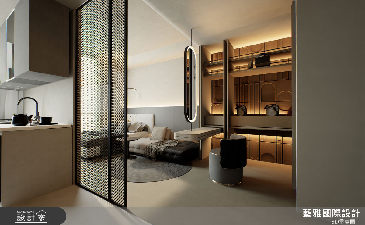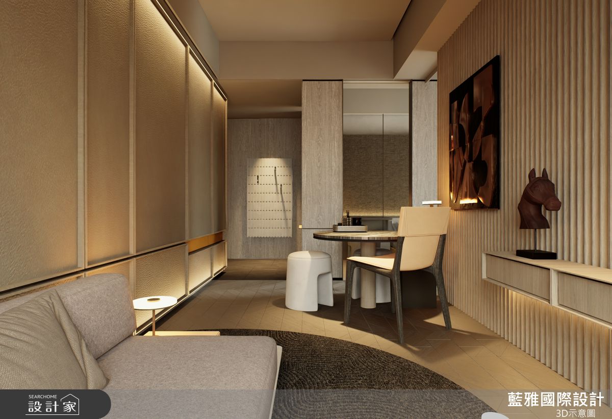 來自藍雅國際設計的16坪現代風住宅案,是一間單層預售屋的兩房格局,設計師藉由建材以木皮板、皮革飾面、金屬格網、鍍鈦金屬件、大板石紋地磚、霧面烤漆板、隱藏式光源系統的搭配應用,實現一家人的理想生活。