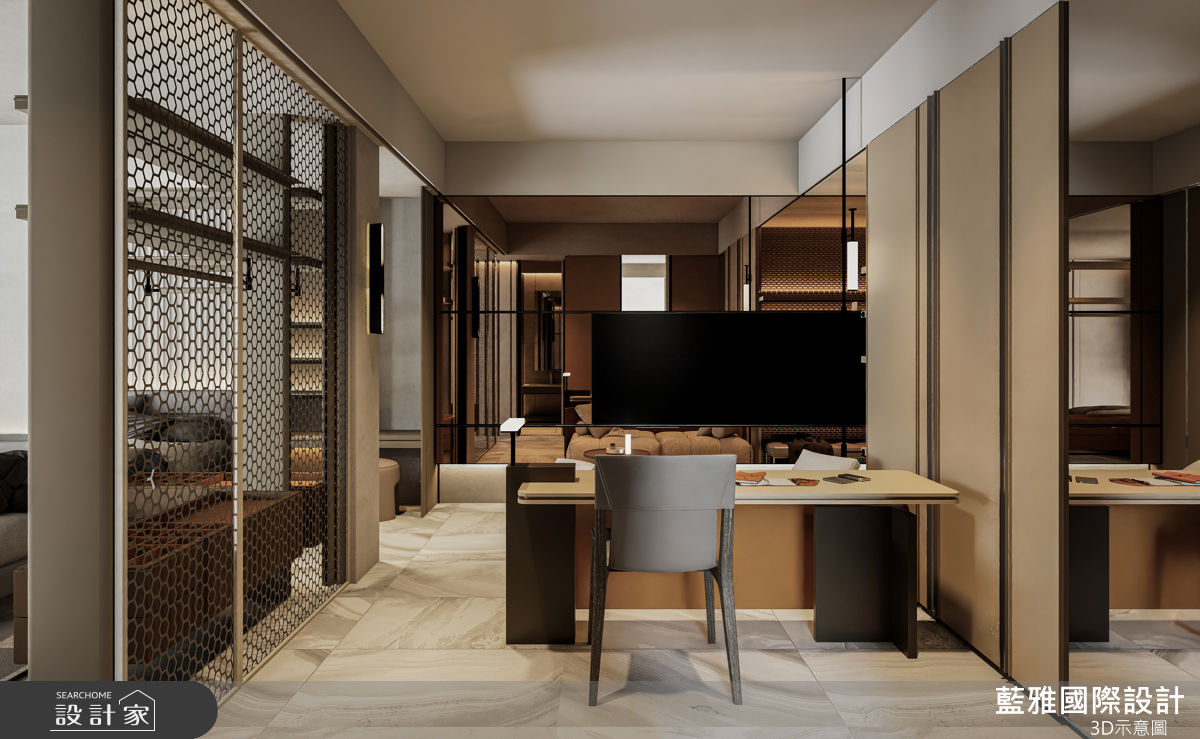 藍雅國際設計以金屬、皮革、石材、木皮、塗料、金屬飾條、蛇紋石、金屬網、繃皮、繃布的搭配應用,呈現現代風居家氛圍,將此間27坪、三房、單層、新成屋(5年以下)打造成舒適愜意的家庭空間,完成全家人的夢想之居。