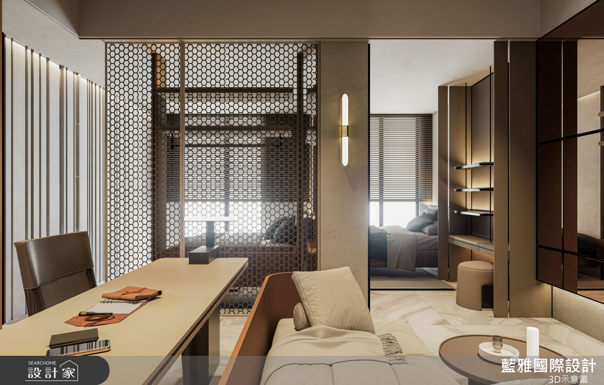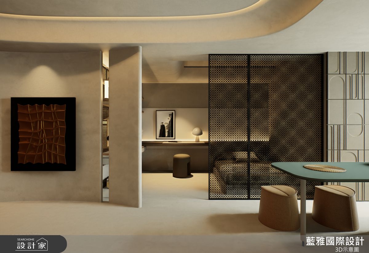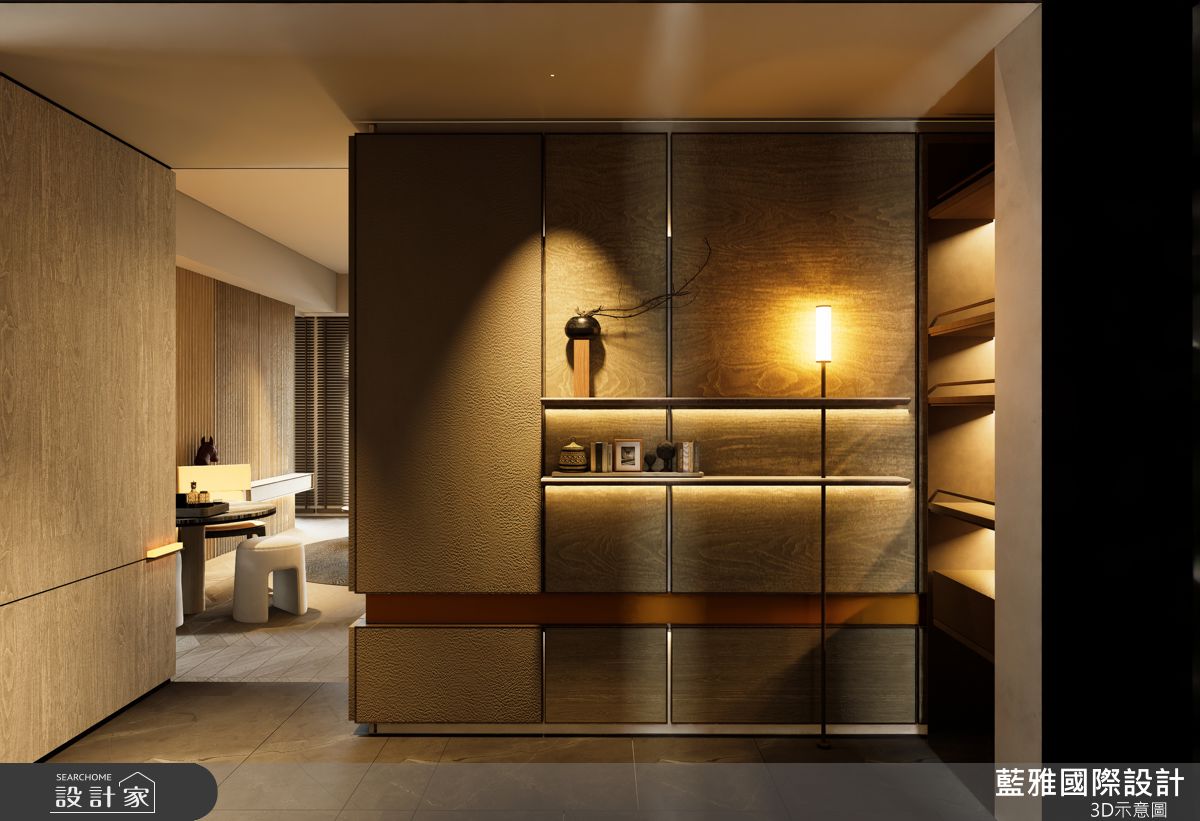 藍雅國際設計以木皮板、格網金屬屏風、雲墨石紋大板、皮革飾面、霧金金屬件、侘寂塗料、線性間接光、懸浮櫃體系統的搭配應用,呈現新中式風居家氛圍,將此間22.8坪、兩房、單層、預售屋打造成舒適愜意的家庭空間,完成全家人的夢想之居。