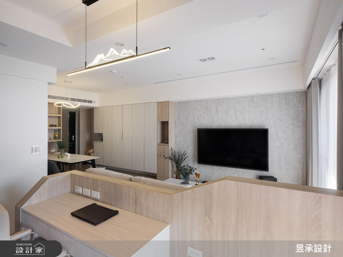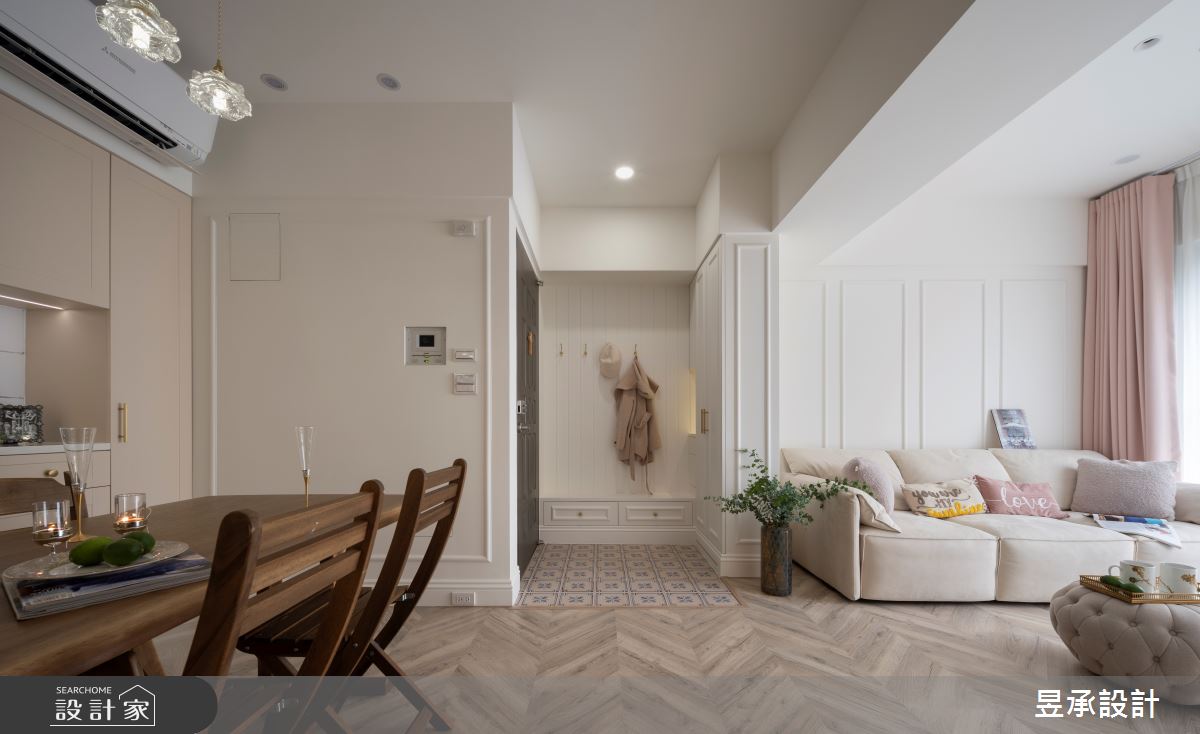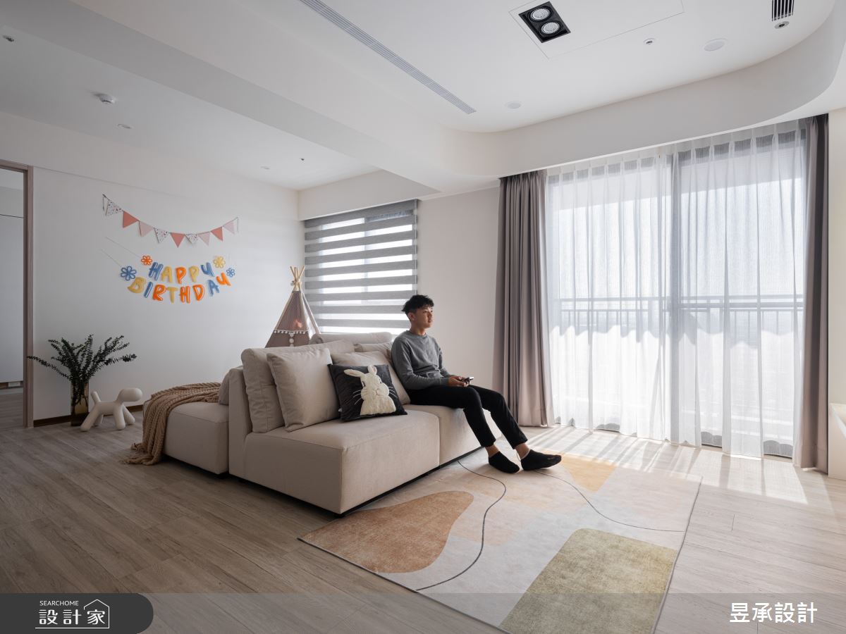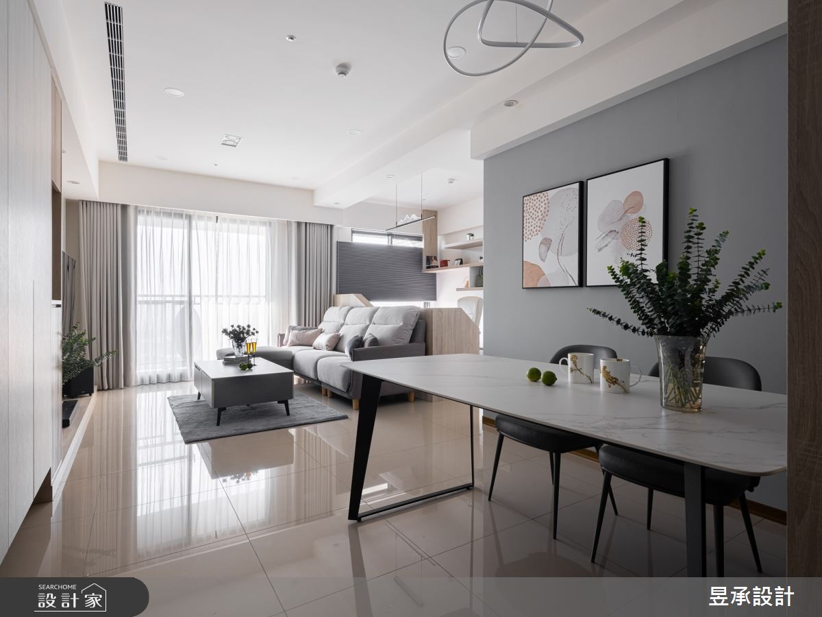 昱承室內裝修設計以乳膠漆、花磚、超耐磨木地板、木作貼皮、系統板材、鋁框拉門、小冰柱玻璃、造型曲板的搭配應用,呈現現代風居家氛圍,將此間19坪、三房、單層、新成屋(5年以下)打造成舒適愜意的家庭空間,完成2位大人、1位小孩全家人的夢想之居。