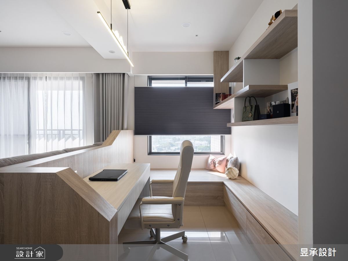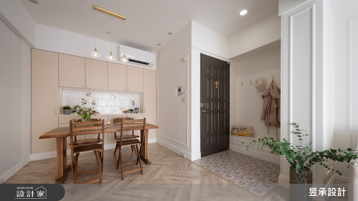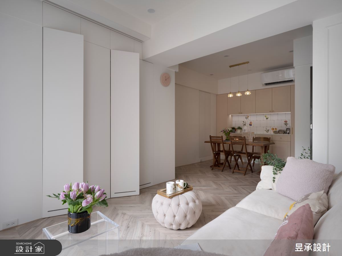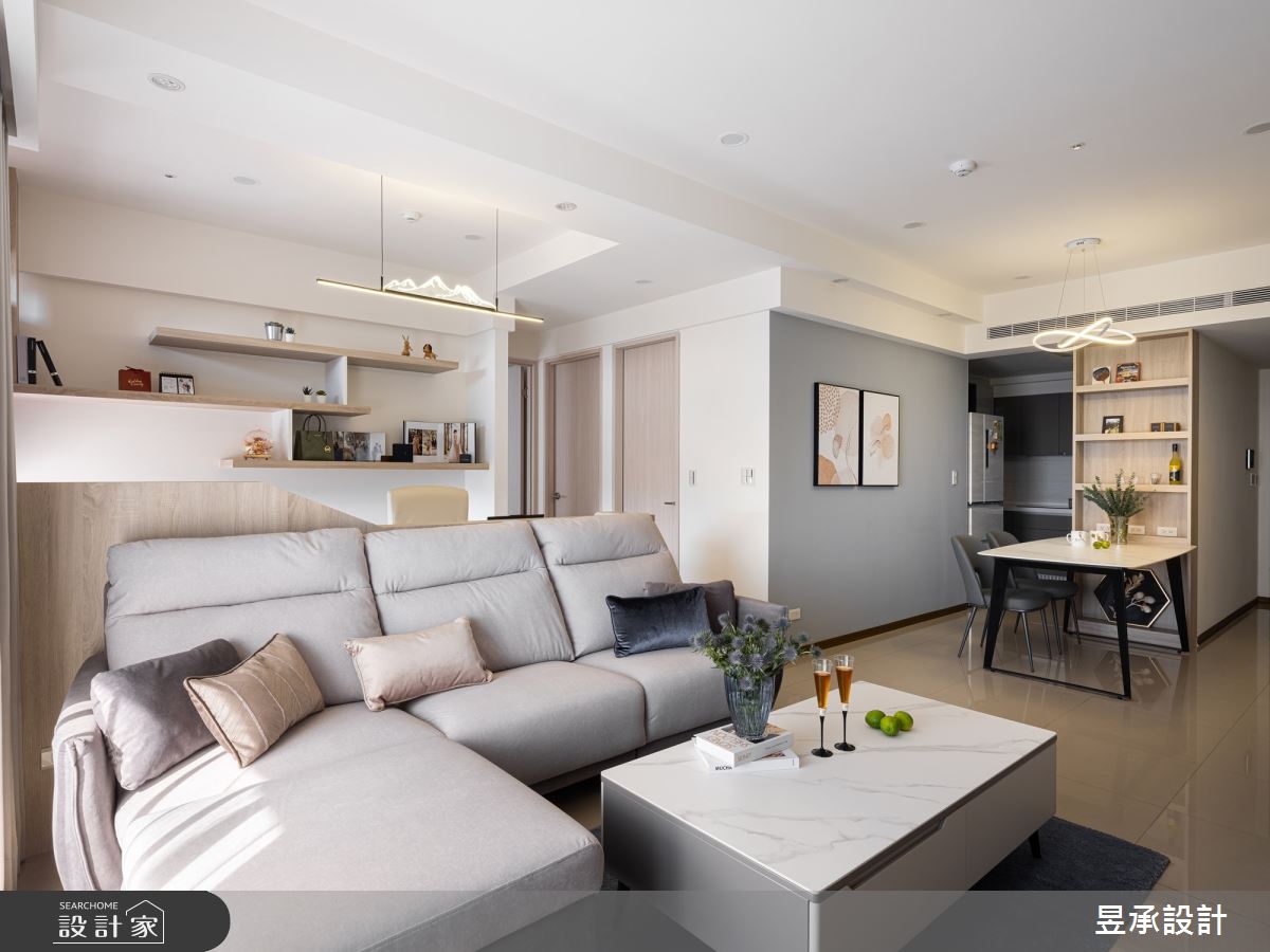 昱承室內裝修設計以乳膠漆、花磚、超耐磨木地板、木作貼皮、系統板材、鋁框拉門、小冰柱玻璃、造型曲板的搭配應用,呈現現代風居家氛圍,將此間19坪、三房、單層、新成屋(5年以下)打造成舒適愜意的家庭空間,完成2位大人、1位小孩全家人的夢想之居。