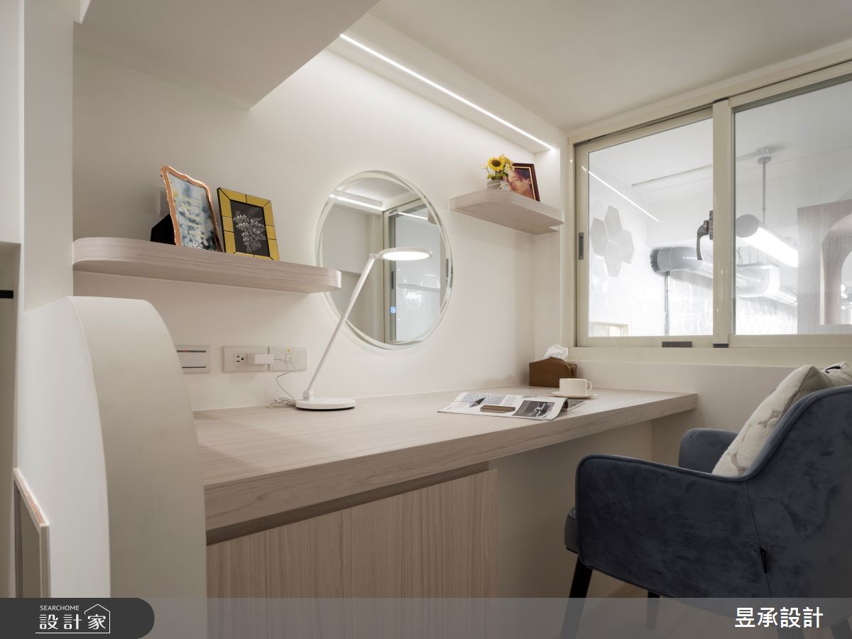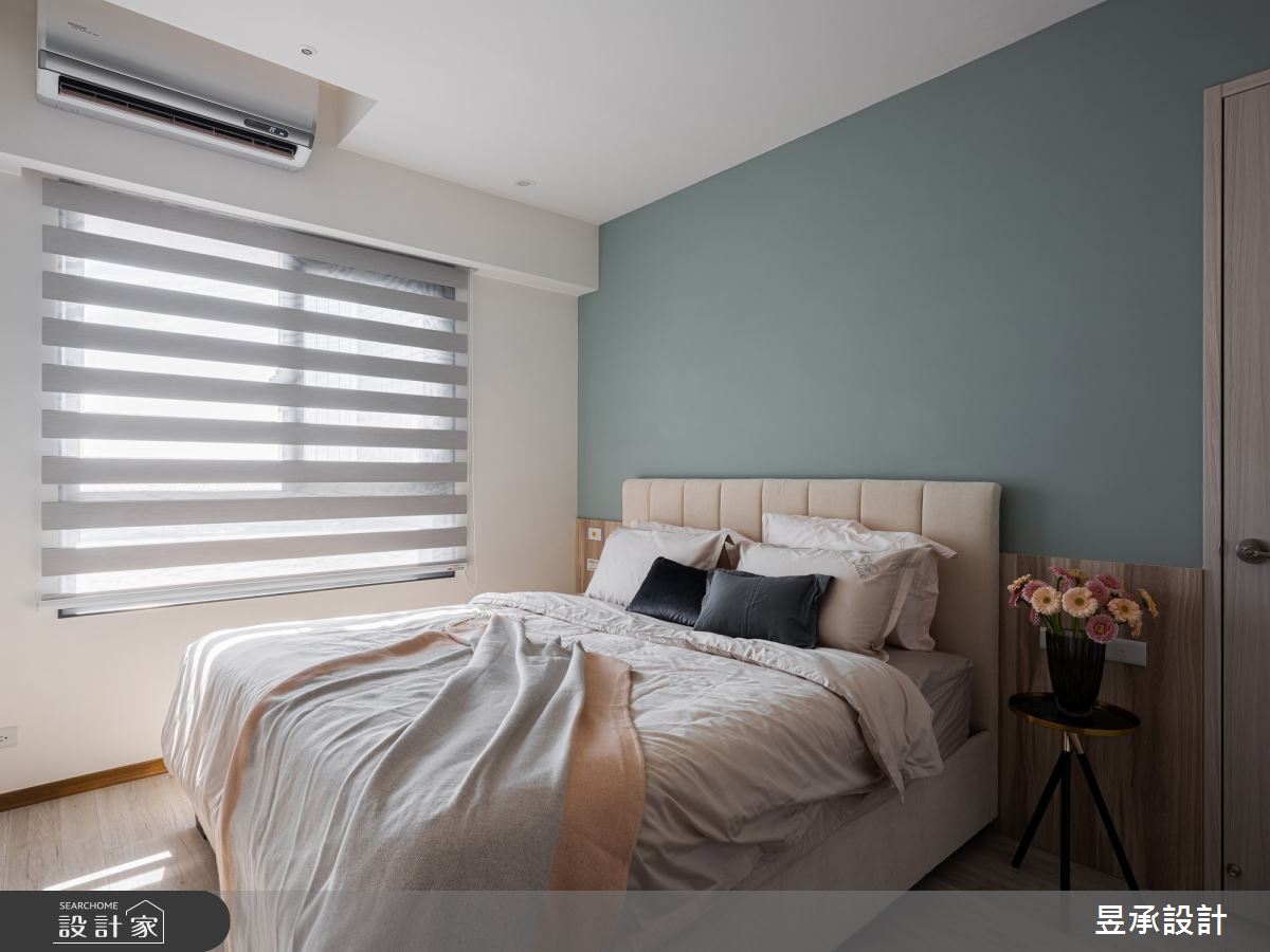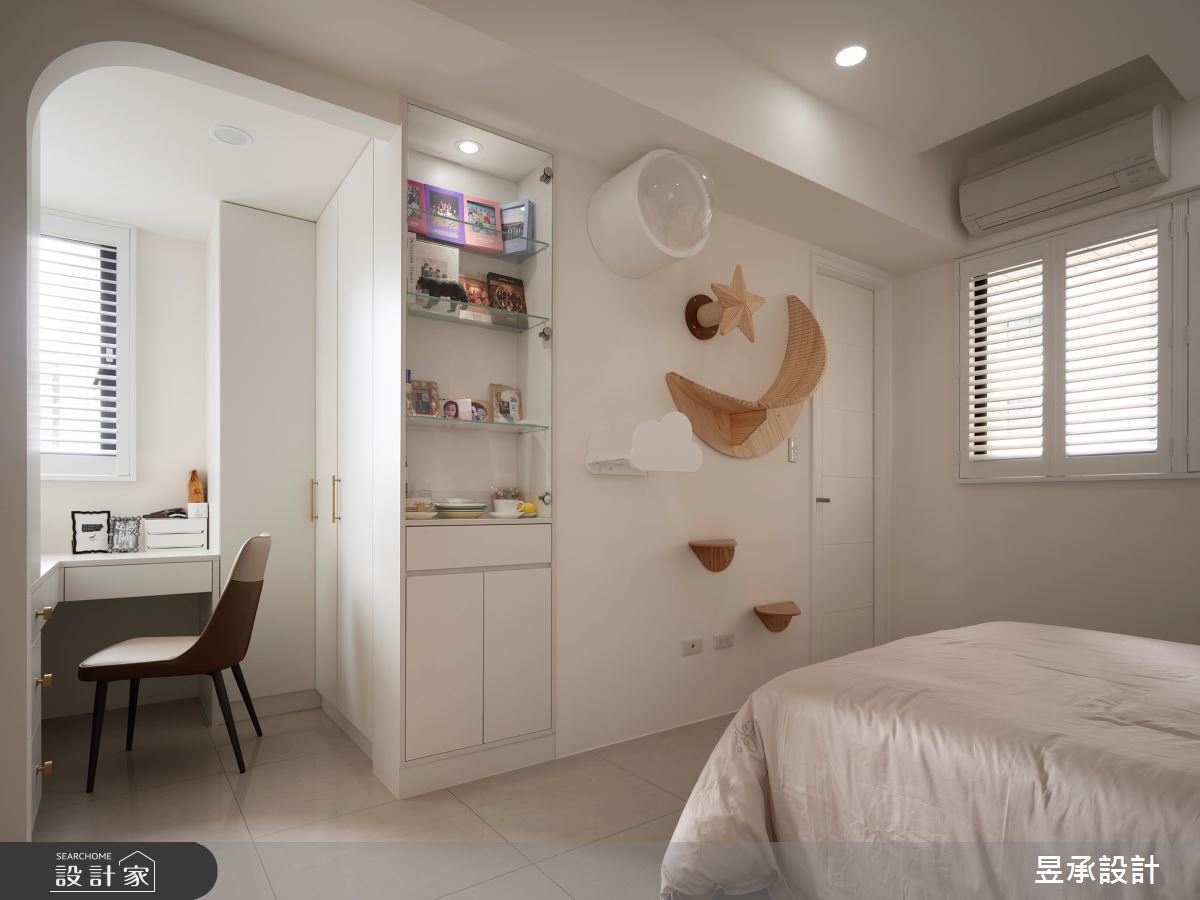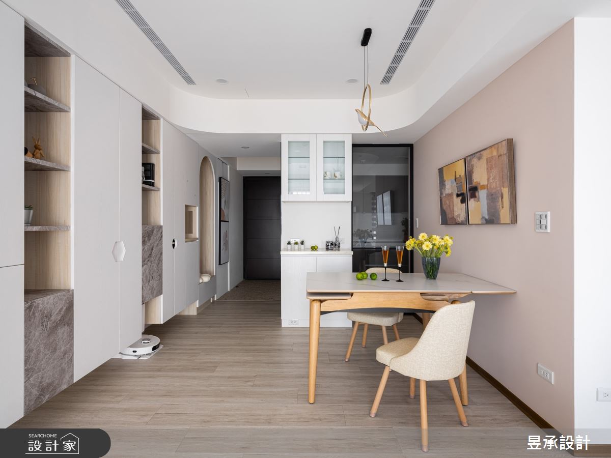 昱承室內裝修設計以乳膠漆、花磚、超耐磨木地板、木作貼皮、系統板材、鋁框拉門、小冰柱玻璃、造型曲板的搭配應用,呈現現代風居家氛圍,將此間19坪、三房、單層、新成屋(5年以下)打造成舒適愜意的家庭空間,完成2位大人、1位小孩全家人的夢想之居。