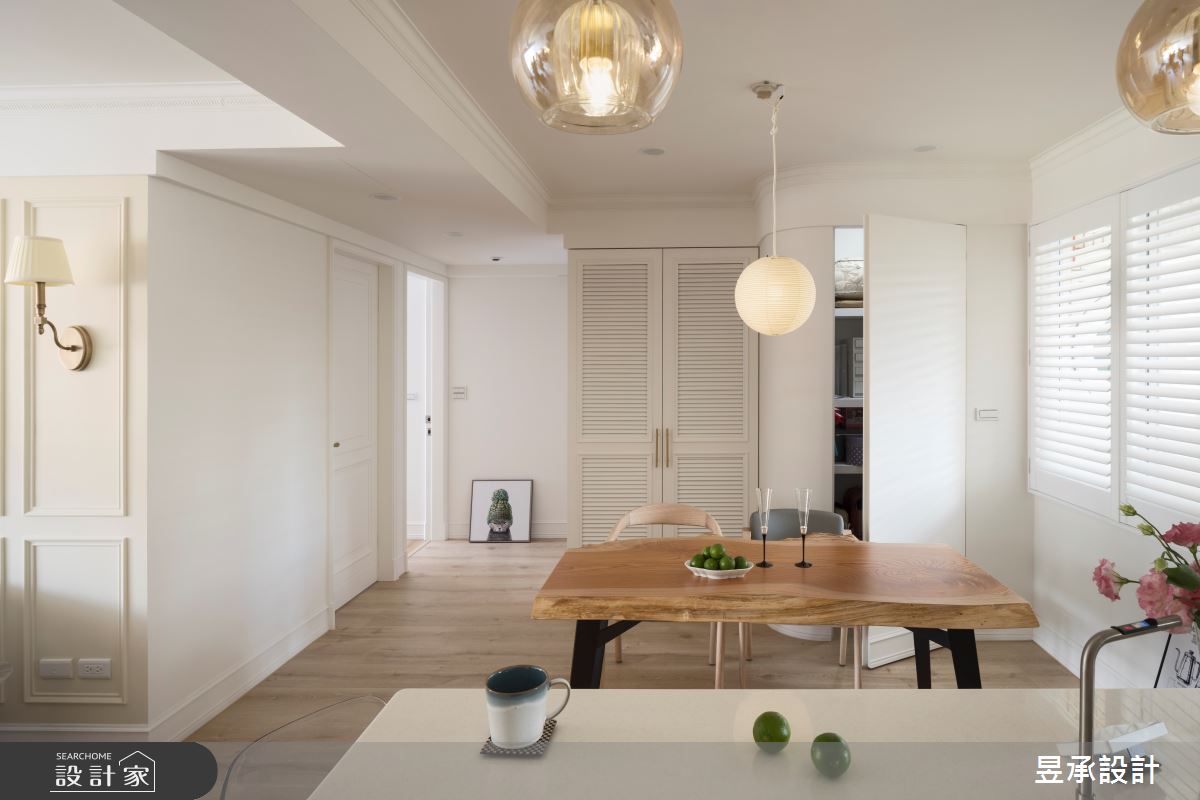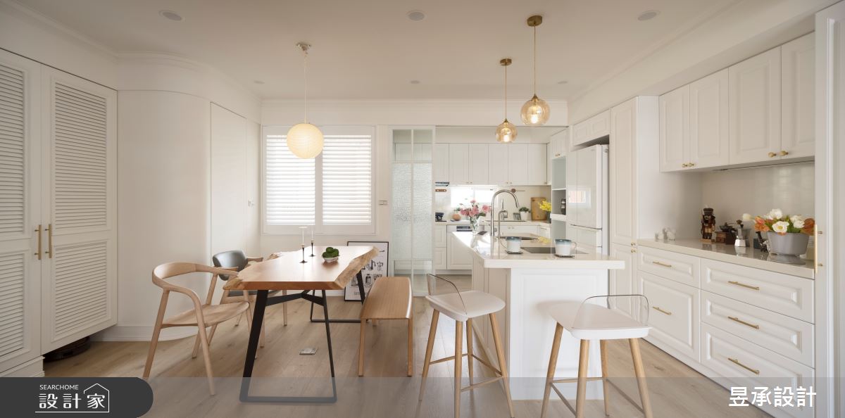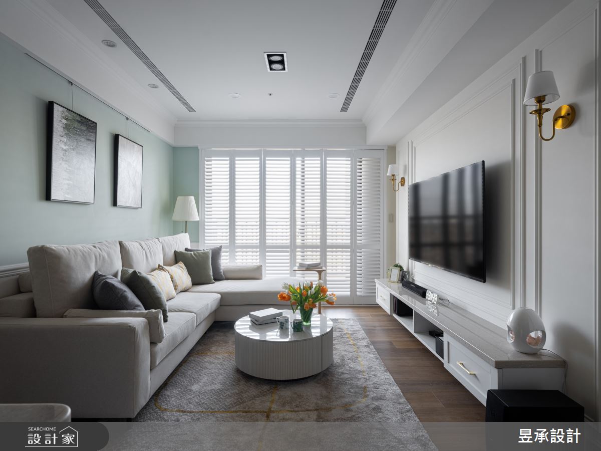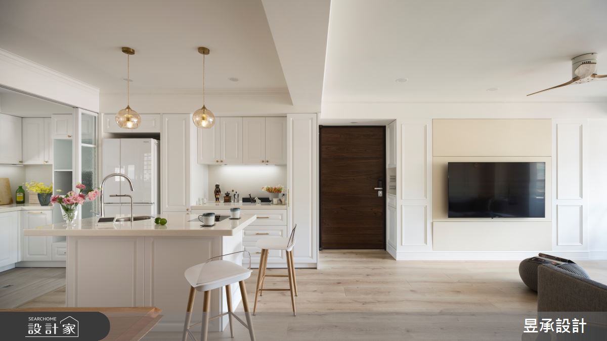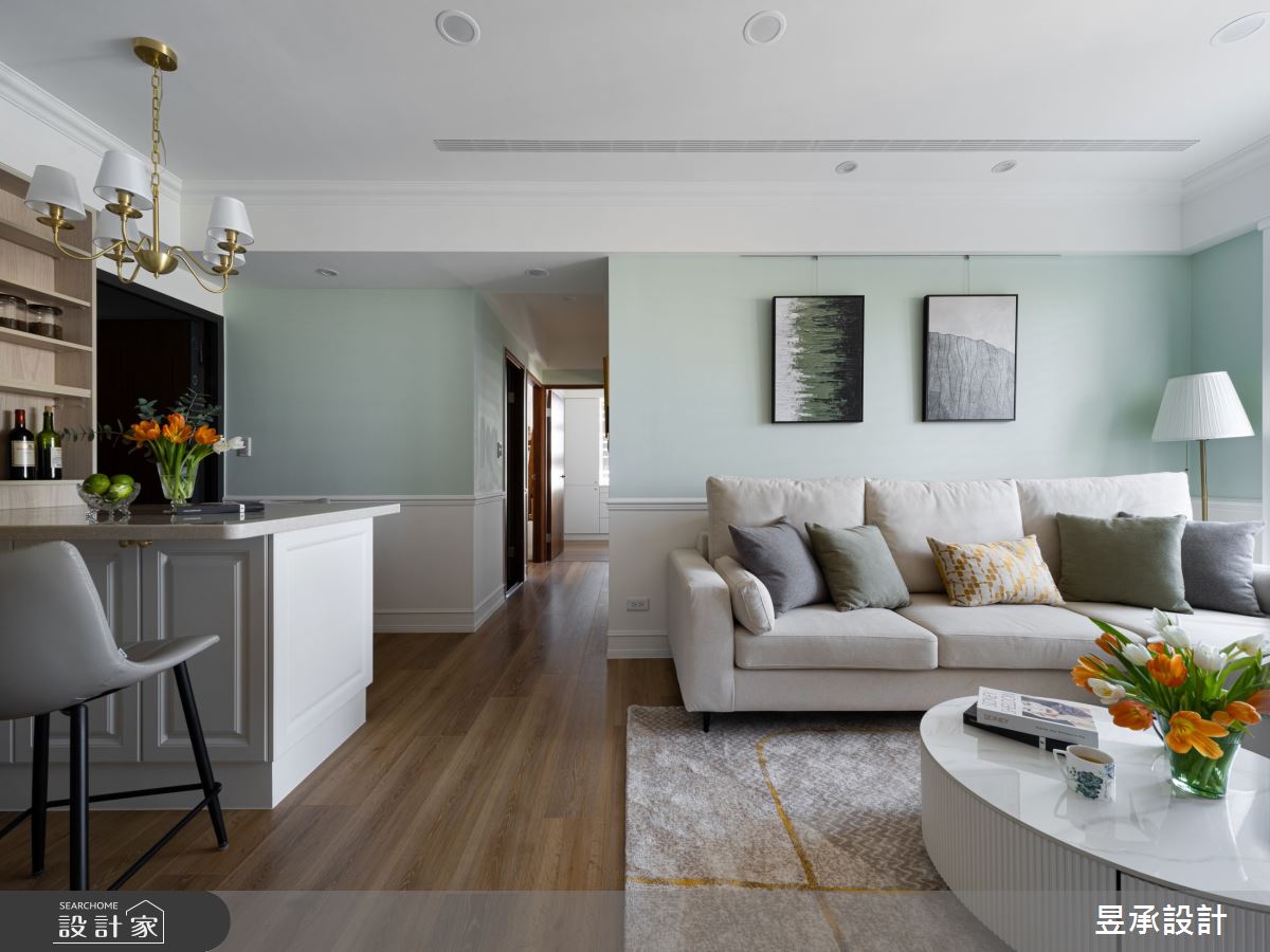 來自昱承室內裝修設計的24坪美式風住宅案,屋主一家人共有2位大人,是一間單層新成屋(5年以下)的三房格局,設計師藉由建材以乳膠漆、木作貼皮、系統板材、人造石、線板、噴漆、茶鏡的搭配應用,實現一家人的理想生活。