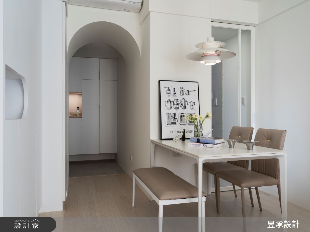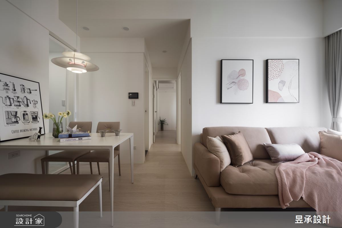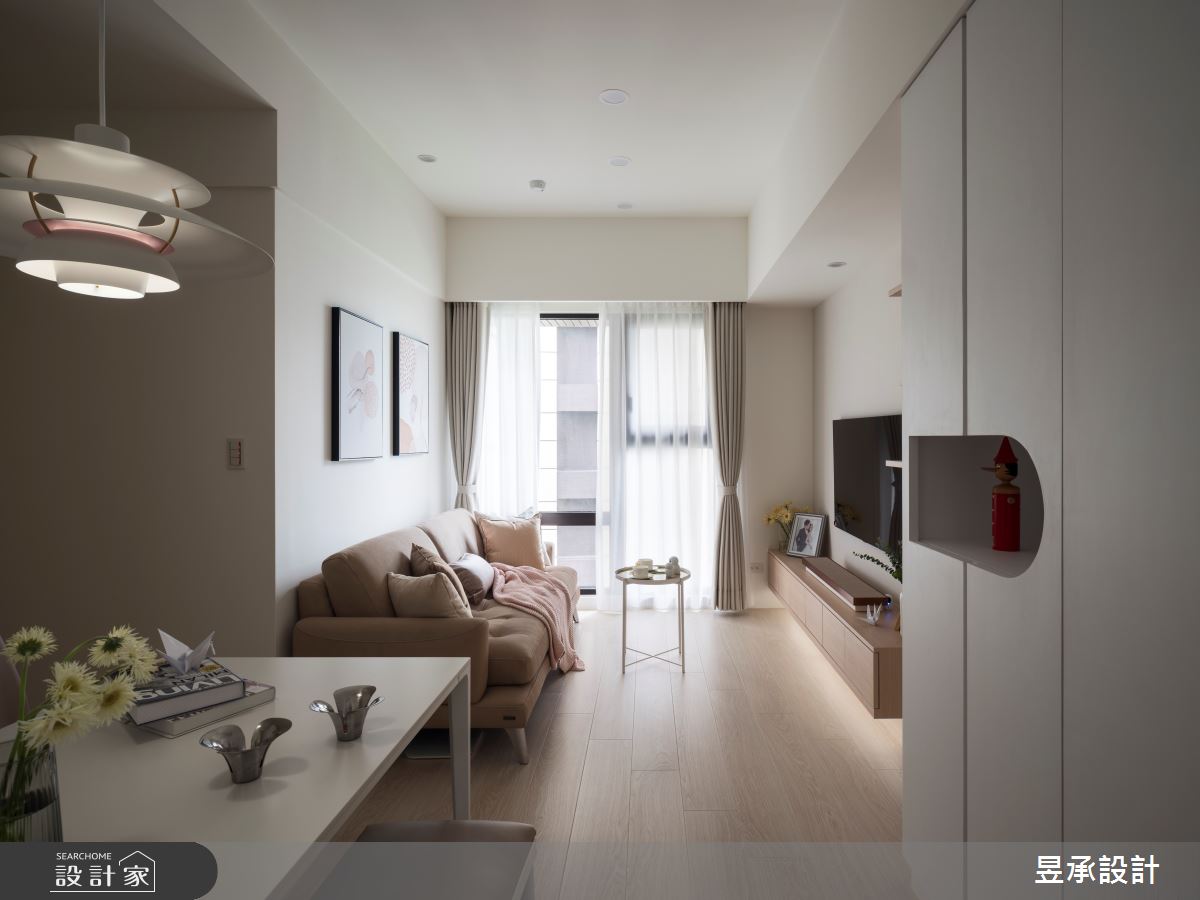 昱承室內裝修設計以乳膠漆、超耐磨木地板、烤玻、木作貼皮、系統板材、噴漆的搭配應用,呈現北歐風居家氛圍,將此間20坪、兩房、單層、預售屋打造成舒適愜意的家庭空間,完成2位大人全家人的夢想之居。
