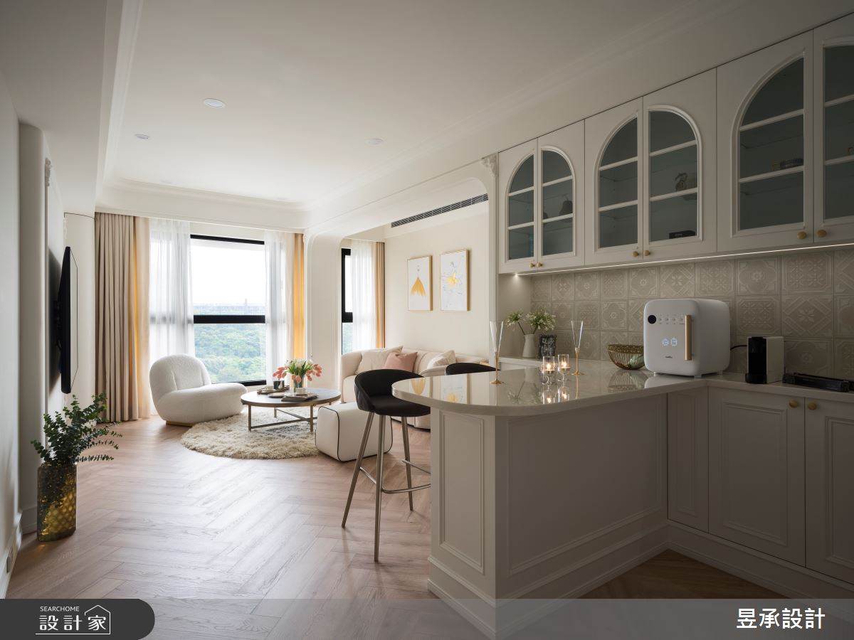昱承室內裝修設計以乳膠漆、花磚、超耐磨木地板、不鏽鋼、木作貼皮、系統板材、大理石、磁磚、木百葉、人造石、噴漆的搭配應用,呈現法式風居家氛圍,將此間24坪、兩房、單層、新成屋(5年以下)打造成舒適愜意的家庭空間,完成2位大人、1位小孩全家人的夢想之居。