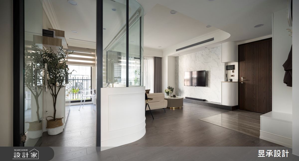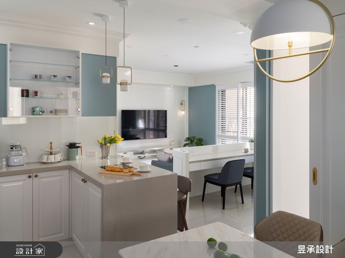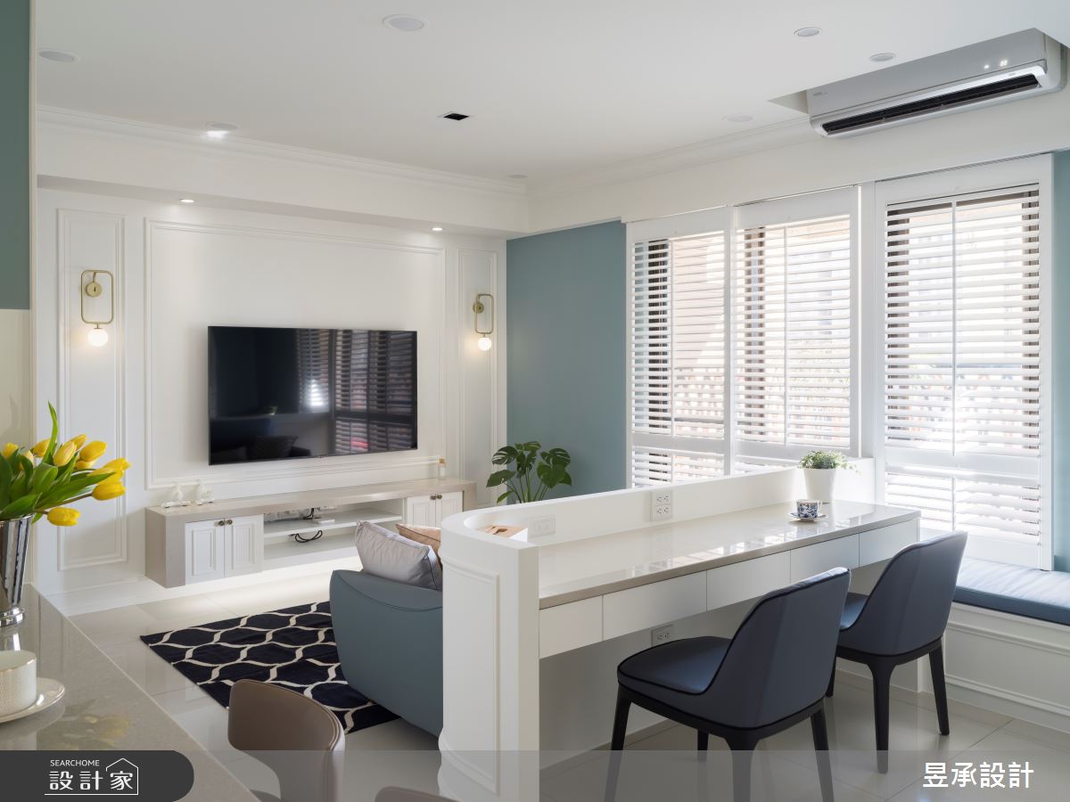 來自昱承室內裝修設計的22坪美式風住宅案,是一間單層新成屋(5年以下)的三房格局,設計師藉由建材以乳膠漆、超耐磨木地板、烤玻、系統板材、木百葉、人造石、繃布、線板、噴漆的搭配應用,實現一家人的理想生活。