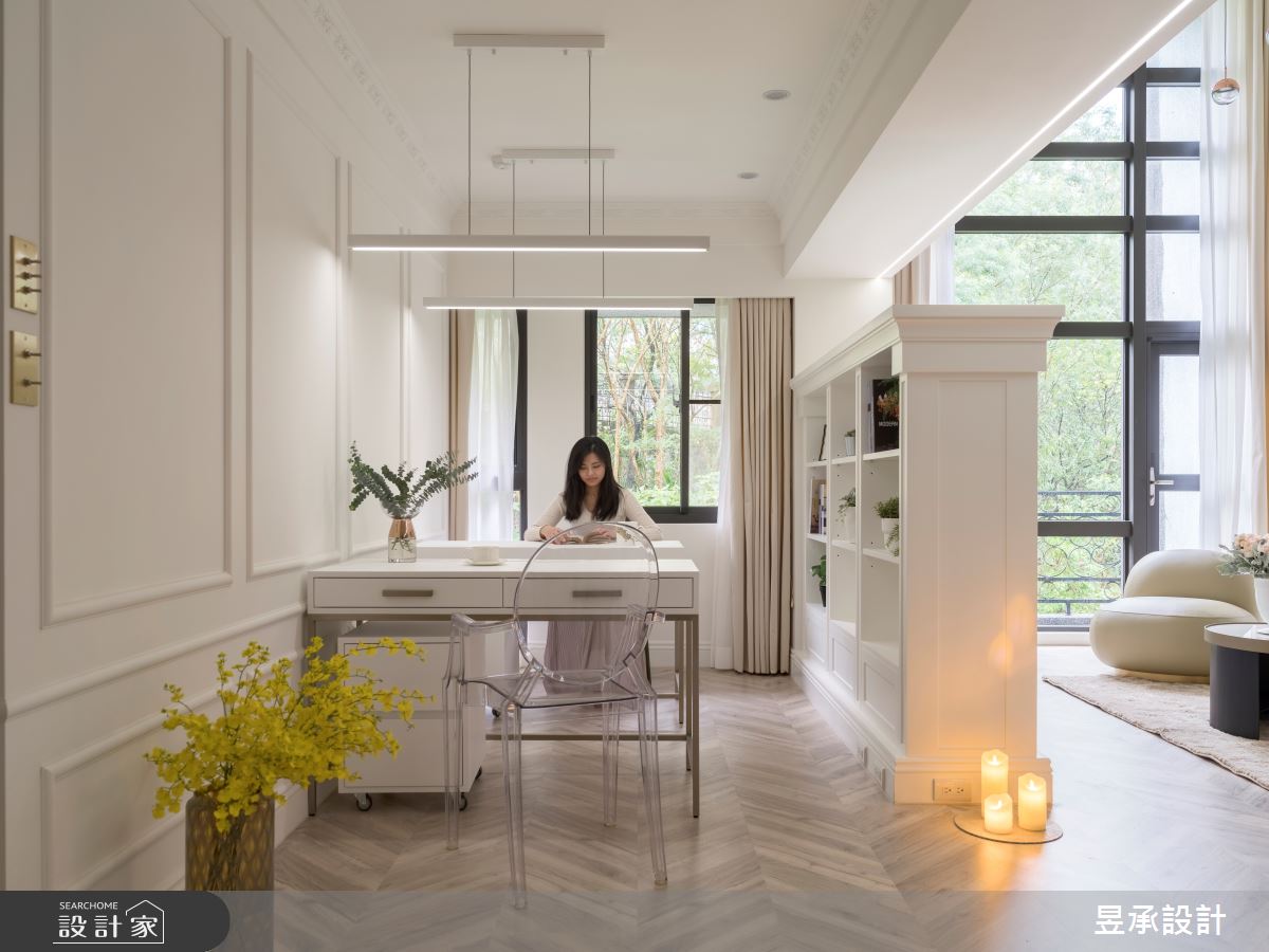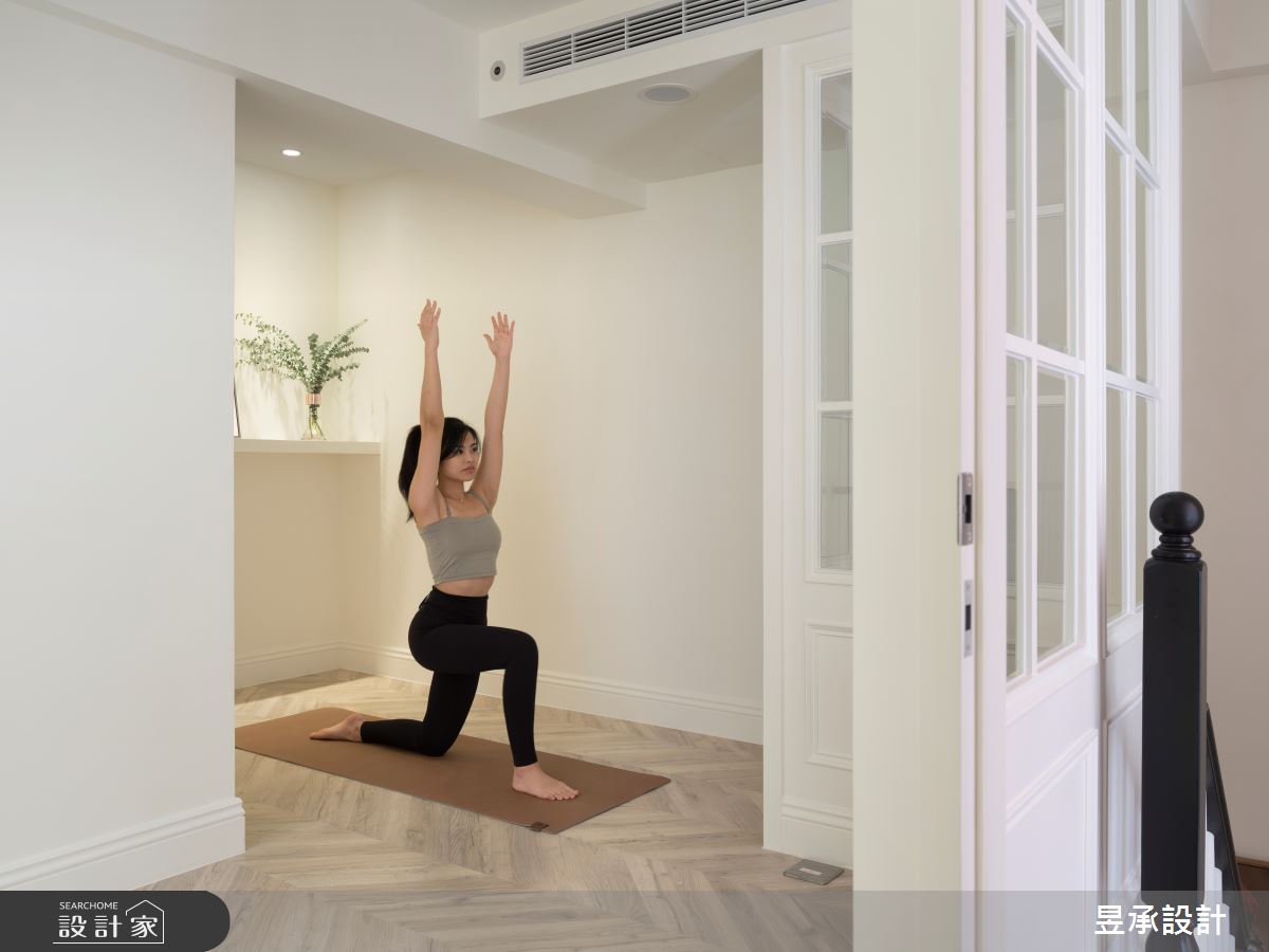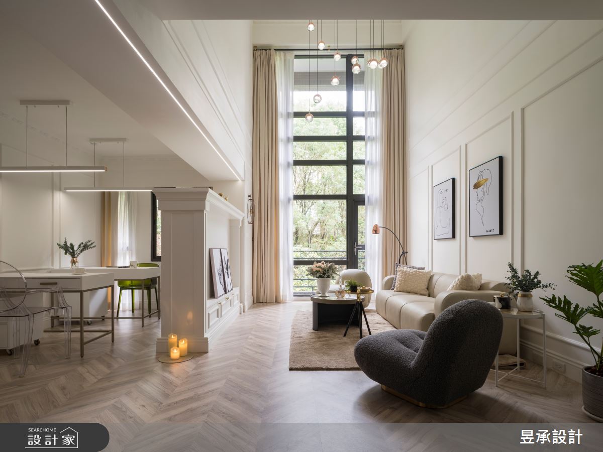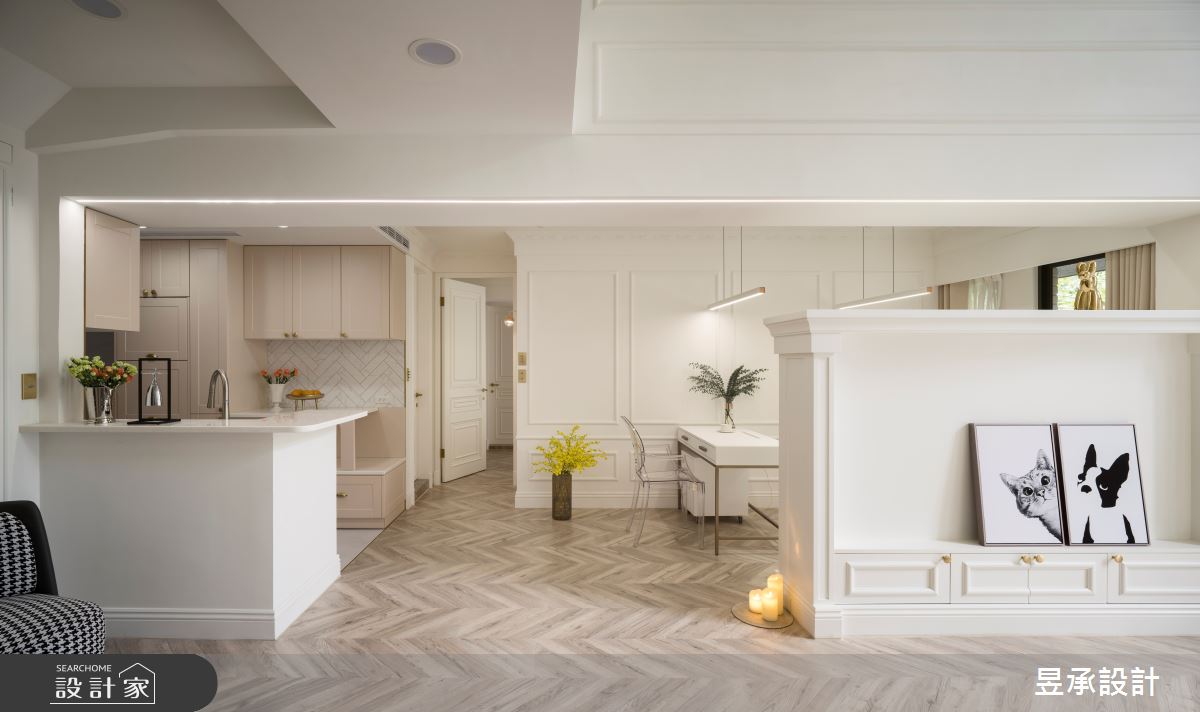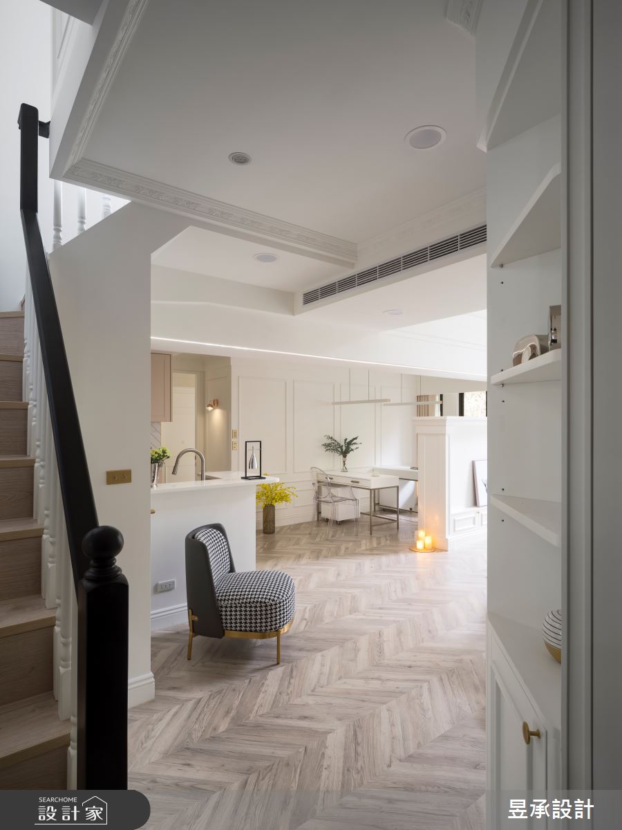 昱承室內裝修設計以鐵道磚、六角磚/蜂巢磚、壁紙、超耐磨木地板、木紋磚、鐵件、鍍鈦金屬、木作貼皮、烤漆、系統板材、大理石、磁磚、人造石、線板、噴漆、魚骨超耐磨木地板的搭配應用,呈現法式風居家氛圍,將此間48坪、五房、複層、新成屋(5年以下)打造成舒適愜意的家庭空間,完成2位大人全家人的夢想之居。
