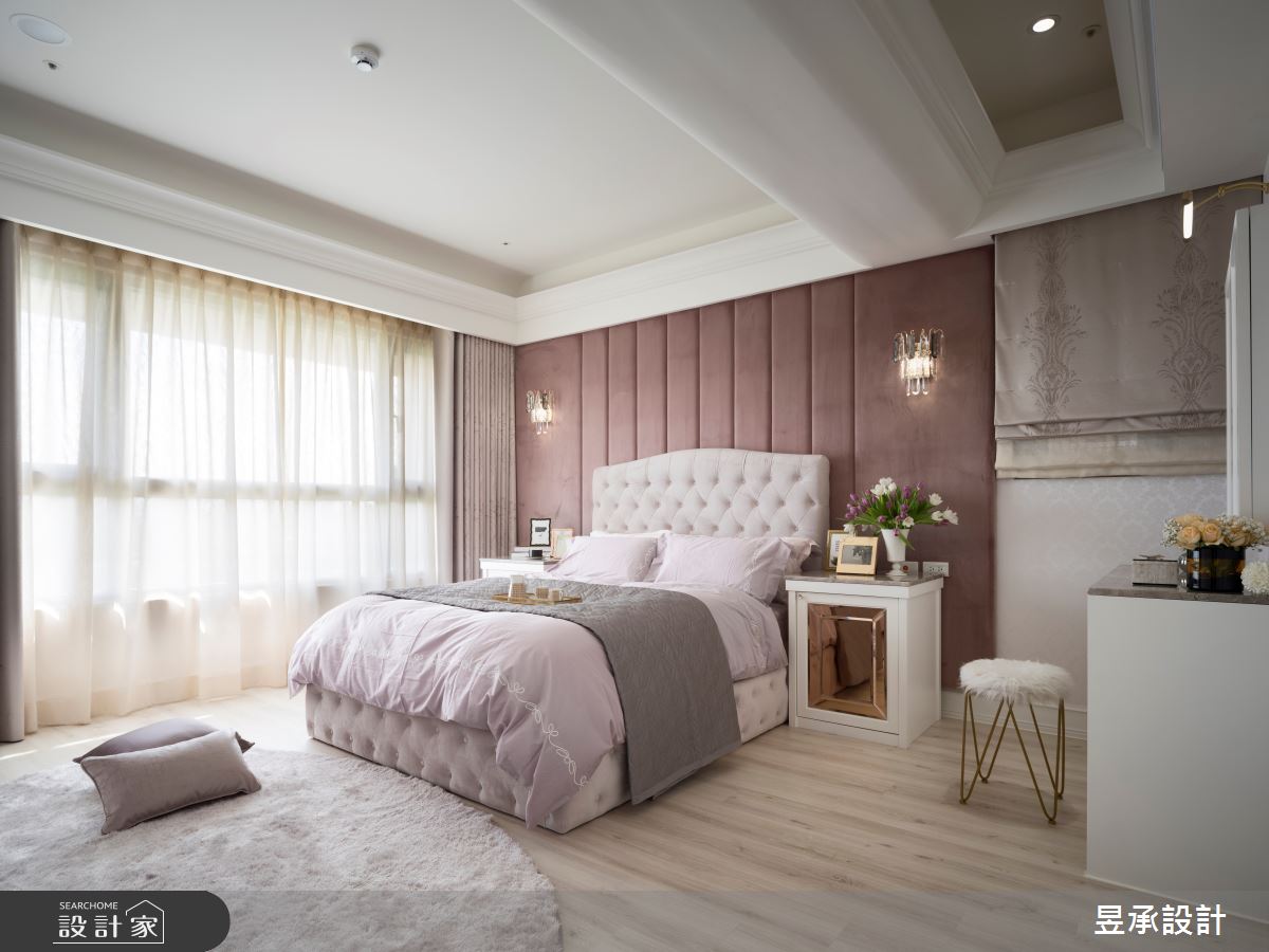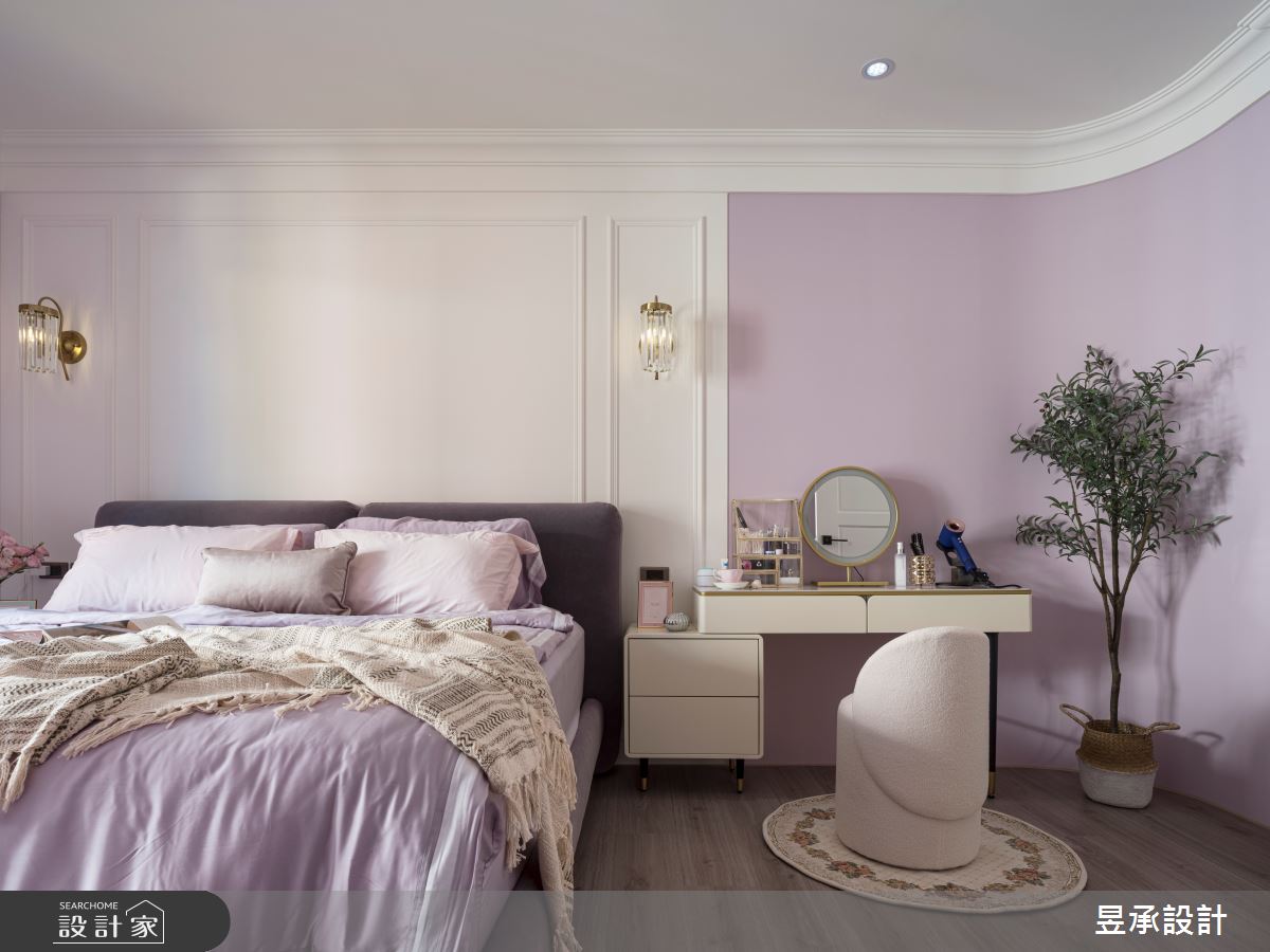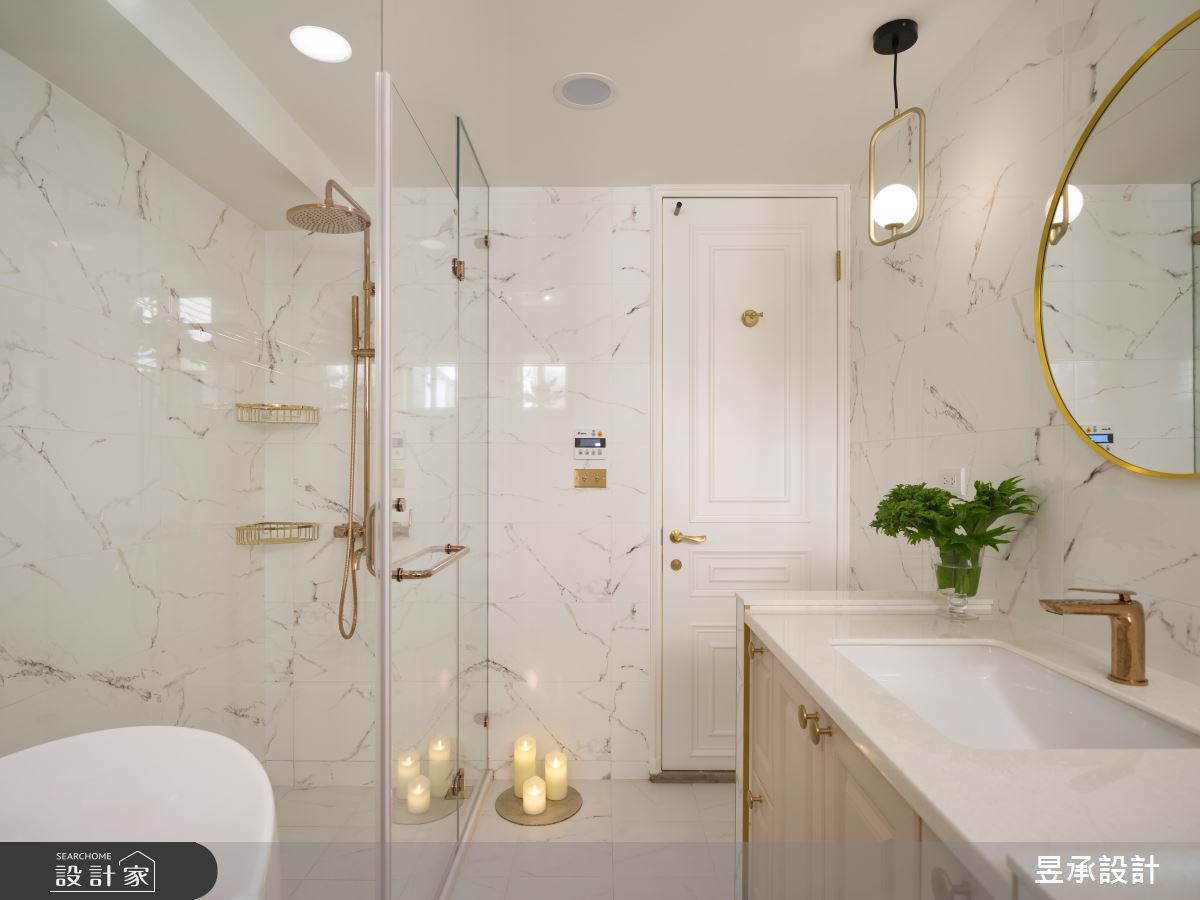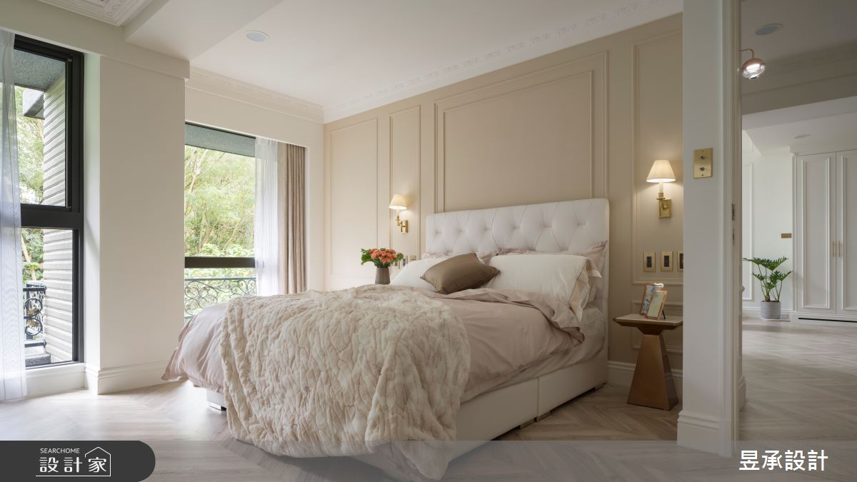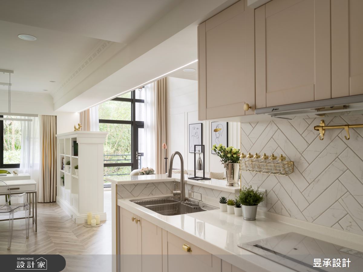 昱承室內裝修設計以鐵道磚、六角磚/蜂巢磚、壁紙、超耐磨木地板、木紋磚、鐵件、鍍鈦金屬、木作貼皮、烤漆、系統板材、大理石、磁磚、人造石、線板、噴漆、魚骨超耐磨木地板的搭配應用,呈現法式風居家氛圍,將此間48坪、五房、複層、新成屋(5年以下)打造成舒適愜意的家庭空間,完成2位大人全家人的夢想之居。
