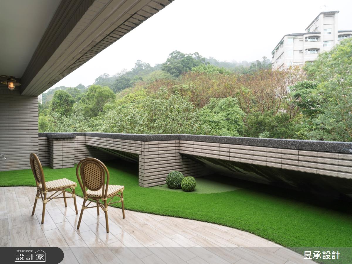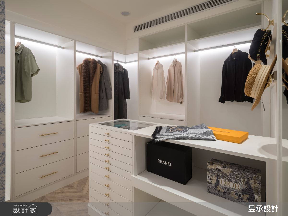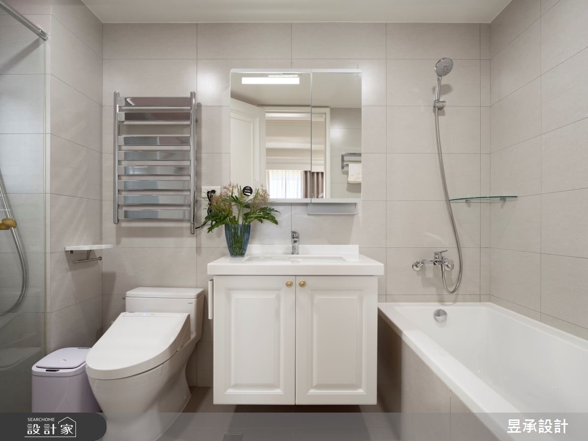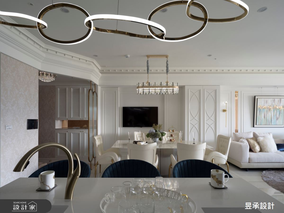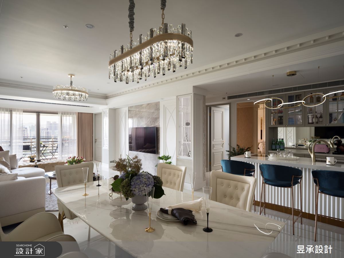 昱承室內裝修設計以乳膠漆、花磚、壁紙、超耐磨木地板、鍍鈦金屬、木作貼皮、系統板材、大理石、賽麗石、繃布、線板、噴漆的搭配應用,呈現美式風居家氛圍,將此間50坪、三房、單層、新成屋(5年以下)打造成舒適愜意的家庭空間,完成4位大人全家人的夢想之居。
