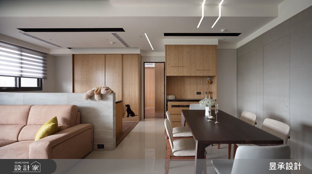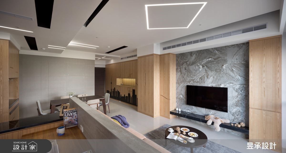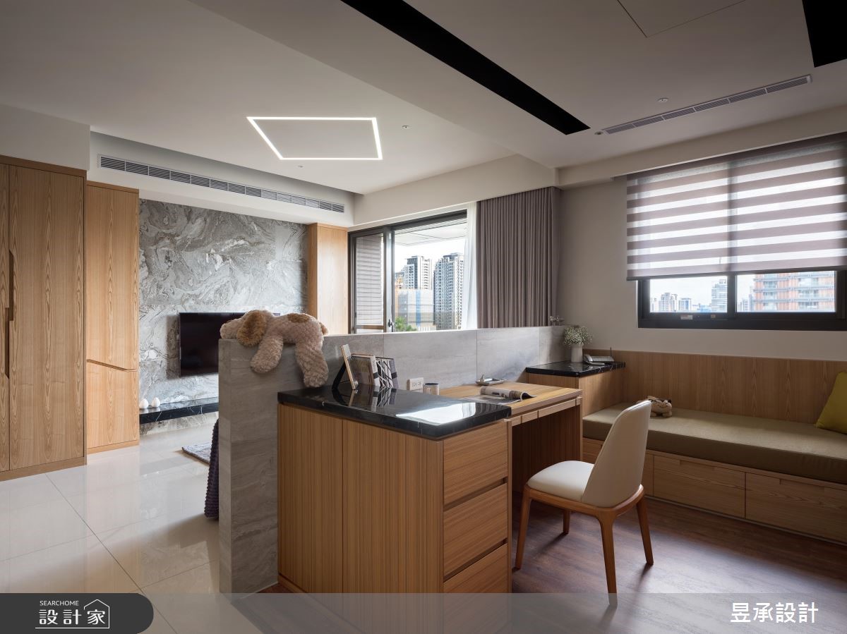 屋主是個擁有創意思維的人,希望也能將對生活的靈感延續到自家空間裡。設計師利用簡潔明快的線條勾勒出家的輪廓,擷取自然味道的材質,像是石材磁磚、清水模或是木皮,揉合多種異材質的技法,調和出細膩且新穎的現代風私宅。 捨棄傳統的嵌燈照明,轉以LED燈局部點綴,呼應現代新意;將原本靠近客廳的臥房調整為開放式書房,利用半高牆與架高木地板界定出領域範圍,充沛的自然光引入室內以及流暢的動線安排,形塑出開放、舒心的室內氣息。玄關處右側牆面鋪陳清水模,轉彎後進入餐廳區並成為主牆,且將機能隱於無形,把廚房及公浴的出入口規劃成隱藏門;入口左側則以木皮打造鞋櫃,櫃體下方透過特殊噴漆手法描繪出城市剪影,將都會的摩登風情納入;自然無華的石材磁磚打造電視牆,兩側搭佐木紋肌理的收納櫃,並以不規則的溝縫設計取代門把,不規則的設計在簡約的視覺美感中,流露出獨有的韻律節奏。 小編的最愛 矮牆與架高木地板劃分書房領域,臨窗處創造臥榻區,後方打造整面書牆設計,木紋的書櫃門片上描繪出小貓、小狗的意象,彷彿每天熱情的迎接屋主回家。