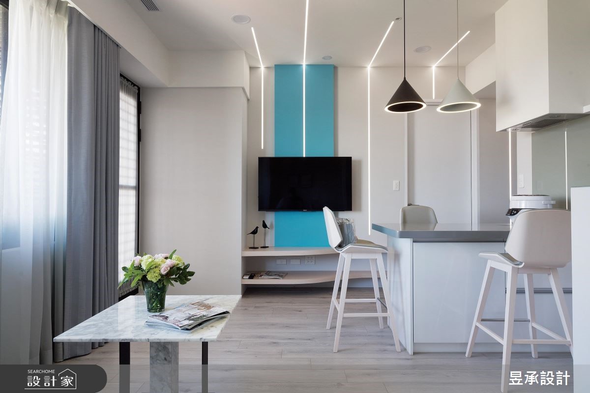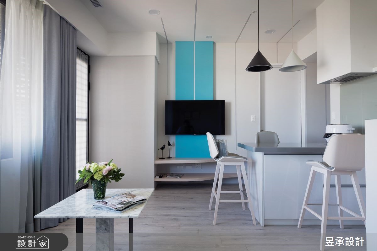 愜意坐在窗邊、眺望著大海,想起小時候的童年趣事……,由於屋主喜愛無拘束的生活,13坪的小宅裡,設計師以北歐風做為空間基調,透過大量的白色調襯底,讓室內更顯放大、舒心,透過木紋以及局部的藍色點綴,營造出清爽無壓的生活氣息。 入室後經過微型落塵區,木作設計圍塑出穿鞋椅與展示層板,兼具收納與機能,且導引至客廳空間裡。淺色木紋鋪陳出溫潤的北歐風氣息,以白色為基調的室內裡,電視牆特別以淺藍色點綴,展現跳色風采,且呼應住家臨近海的悠遊自在,並利用溝縫置入照明的手法,讓線條感的柔光導引出視覺層次與動線,展現俐落、簡約又不失活潑的生命力;利用柱體結構延伸出中島吧檯,取代原有的廚房設計,讓空間機能發揮到極致,也是日常享用餐點與下午茶的好去處,而順著結構樑柱,於壁面透過層板,營造出陳列的美學色彩。 小編的最愛 透過玻璃拉門界定出公領域與睡眠區,可依屋主需求開闔門扇,展現室內的彈性與開闊度,也能兼具個人隱私;臥室牆面也以藍色線調描繪,呼應整體空間的療癒北歐風質感。