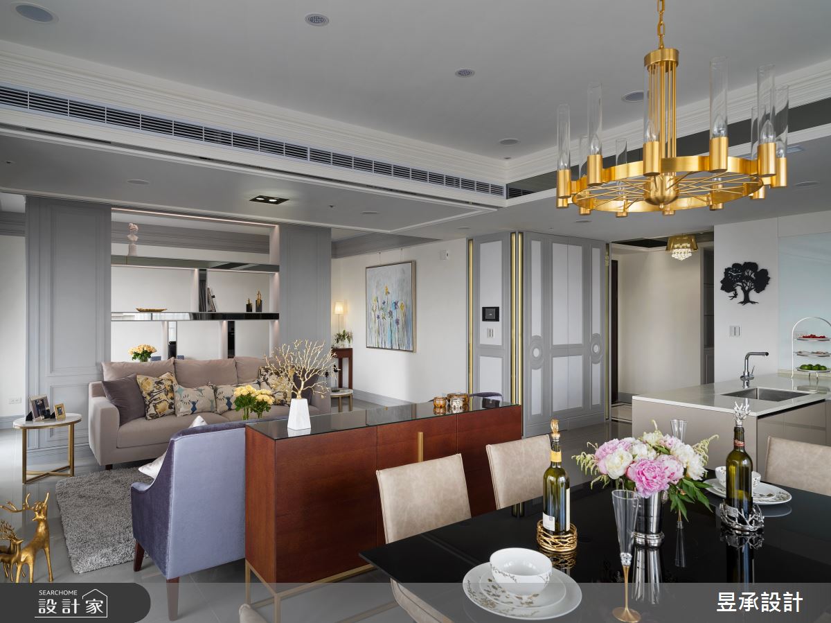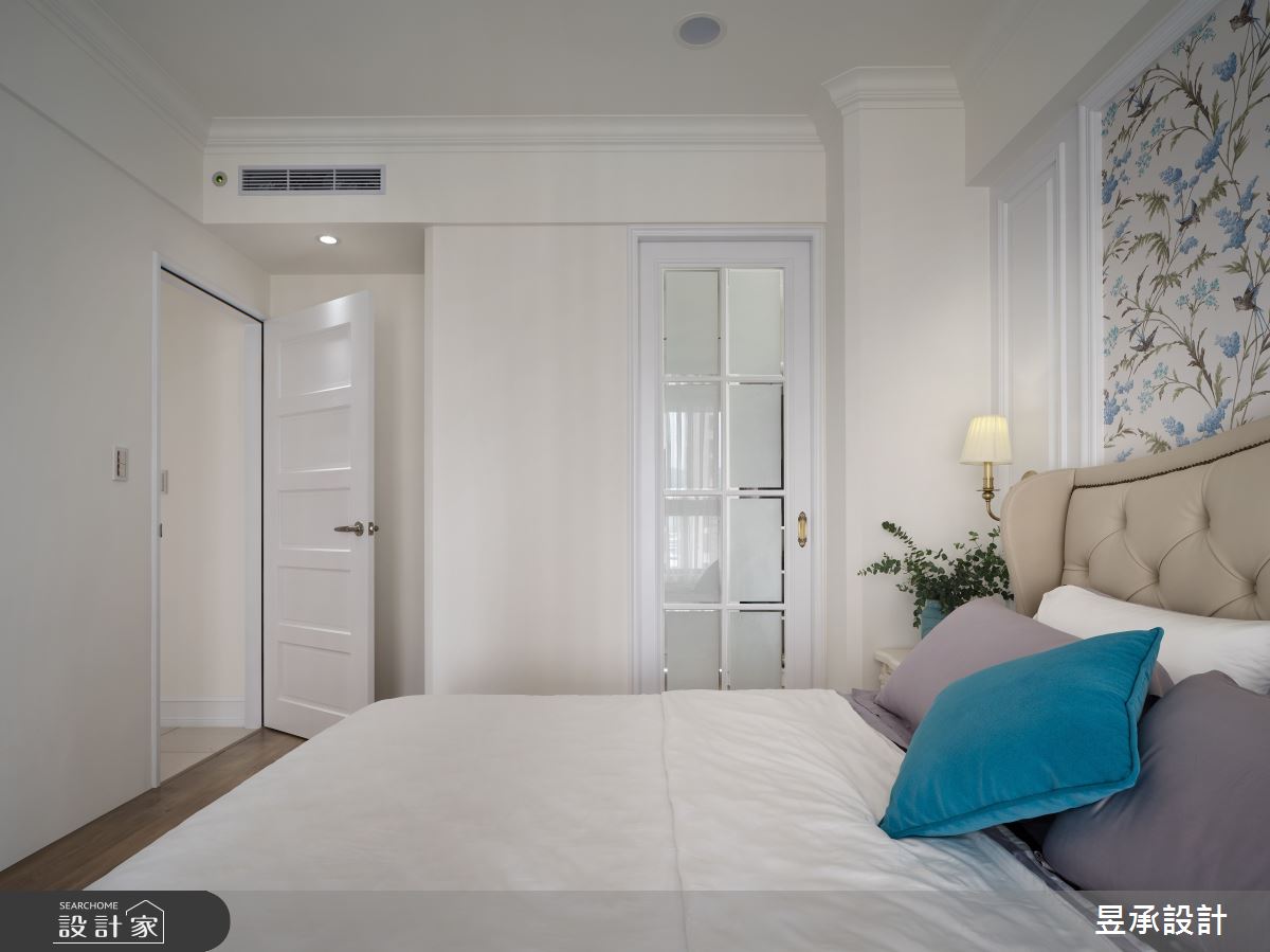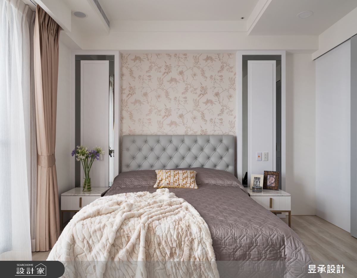 玻璃落地窗的通透無礙特性,引入敞朗日光走進室內,照亮滿室明亮及其動人的美學細節。設計師透過優雅的美式風格,以描繪出一家四口夢想中的家屋,讓我們走進來瞧瞧! 入室後的玄關右側,以線板描繪的櫃體規劃出鞋櫃及公浴收納櫃,不僅巧妙隱藏公浴出入口,還創造收納機能,同時也藉由燈柱的設計點綴,創造出完整的玄關領域,同時也營造出浪漫的入室氣息。客廳裡為了營造出寬敞、充沛採光的優勢,沙發後方搭配鏤空的書櫃設計,界定出男屋主期待的獨立書房,開放的櫃體讓光線走進書房領域,同時成為領域的隔間技法;電視牆的兩側則以灰鏡妝點且延伸至天花板,反射的特性讓空間更顯延伸、放大,與室內的古典元素相互輝映,形塑時尚且奢華的氣息。客廳另一側以木作矮櫃界定,延著L型落地窗,打造出開放餐廳,結合庭園木作的規劃,讓室內與戶外景致融合,一邊用餐的同時也能欣賞露台的風景,好不愜意! 小編的最愛 延續公領域的細膩質感,主臥床頭以粉色印花圖騰襯底,兩側以對稱的灰鏡安排,放大空間視感;床尾藉由木框玻璃拉門搭配古典壁板、壁燈設計,創造出時尚品味的更衣室空間。
