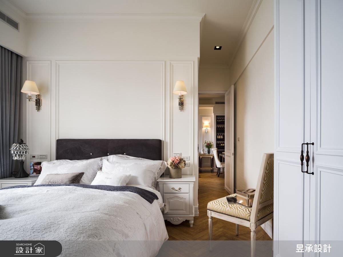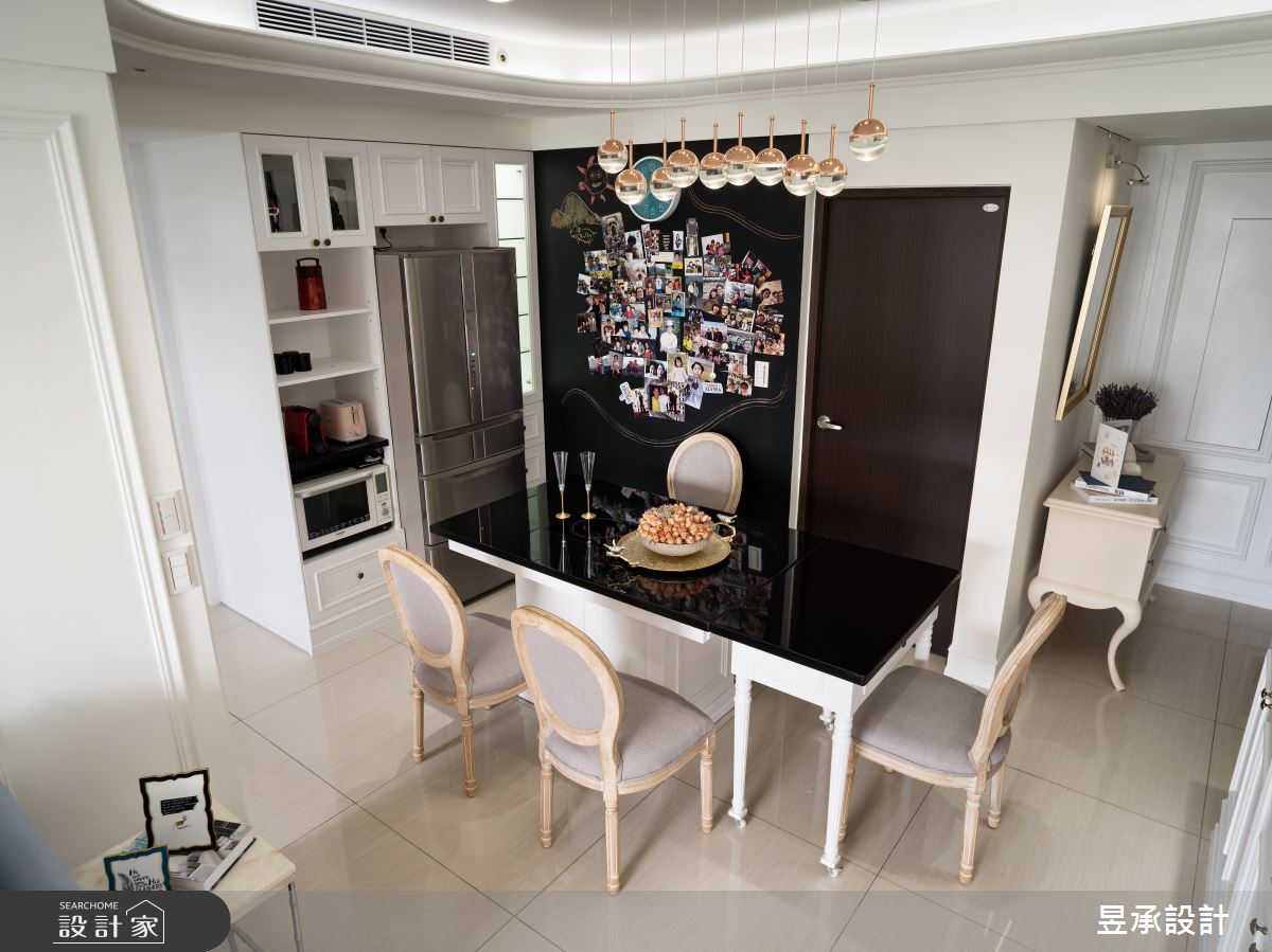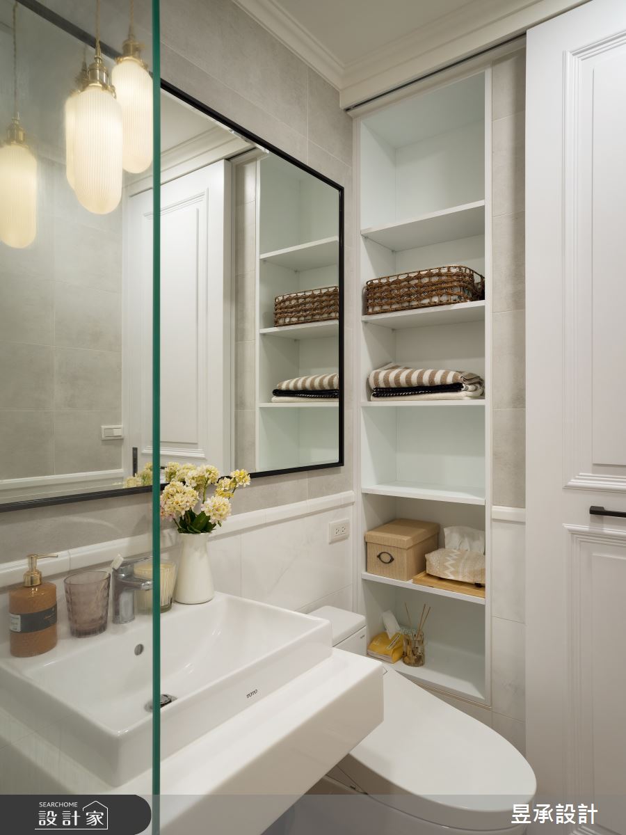 玻璃落地窗的通透無礙特性,引入敞朗日光走進室內,照亮滿室明亮及其動人的美學細節。設計師透過優雅的美式風格,以描繪出一家四口夢想中的家屋,讓我們走進來瞧瞧! 入室後的玄關右側,以線板描繪的櫃體規劃出鞋櫃及公浴收納櫃,不僅巧妙隱藏公浴出入口,還創造收納機能,同時也藉由燈柱的設計點綴,創造出完整的玄關領域,同時也營造出浪漫的入室氣息。客廳裡為了營造出寬敞、充沛採光的優勢,沙發後方搭配鏤空的書櫃設計,界定出男屋主期待的獨立書房,開放的櫃體讓光線走進書房領域,同時成為領域的隔間技法;電視牆的兩側則以灰鏡妝點且延伸至天花板,反射的特性讓空間更顯延伸、放大,與室內的古典元素相互輝映,形塑時尚且奢華的氣息。客廳另一側以木作矮櫃界定,延著L型落地窗,打造出開放餐廳,結合庭園木作的規劃,讓室內與戶外景致融合,一邊用餐的同時也能欣賞露台的風景,好不愜意! 小編的最愛 延續公領域的細膩質感,主臥床頭以粉色印花圖騰襯底,兩側以對稱的灰鏡安排,放大空間視感;床尾藉由木框玻璃拉門搭配古典壁板、壁燈設計,創造出時尚品味的更衣室空間。
