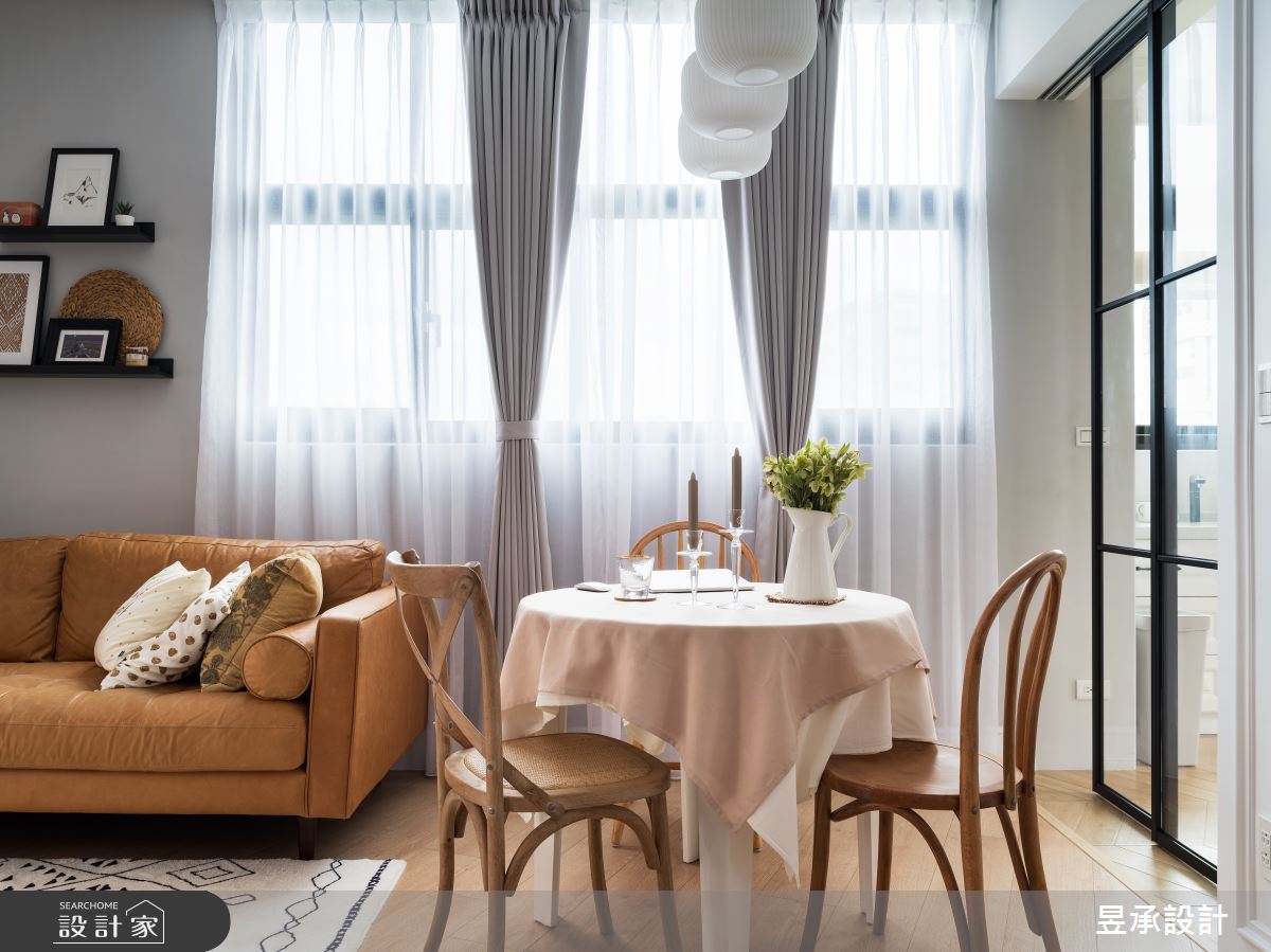 昱承室內裝修設計以乳膠漆、超耐磨木地板、木紋磚、石英磚/拋光石英磚、鐵件、木作貼皮、系統板材、大理石、人造石、線板、噴漆的搭配應用,呈現美式風居家氛圍,將此間32坪、兩房、單層、中古屋(5~15年)打造成舒適愜意的家庭空間,完成2位大人全家人的夢想之居。