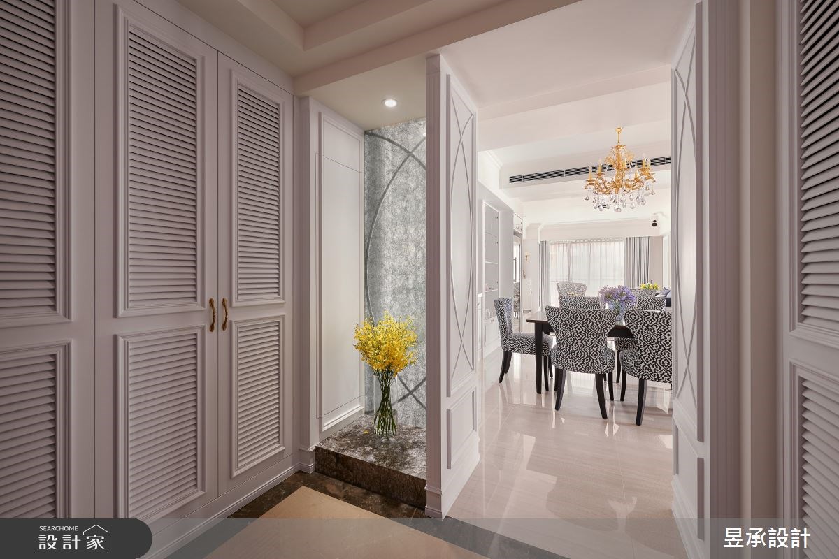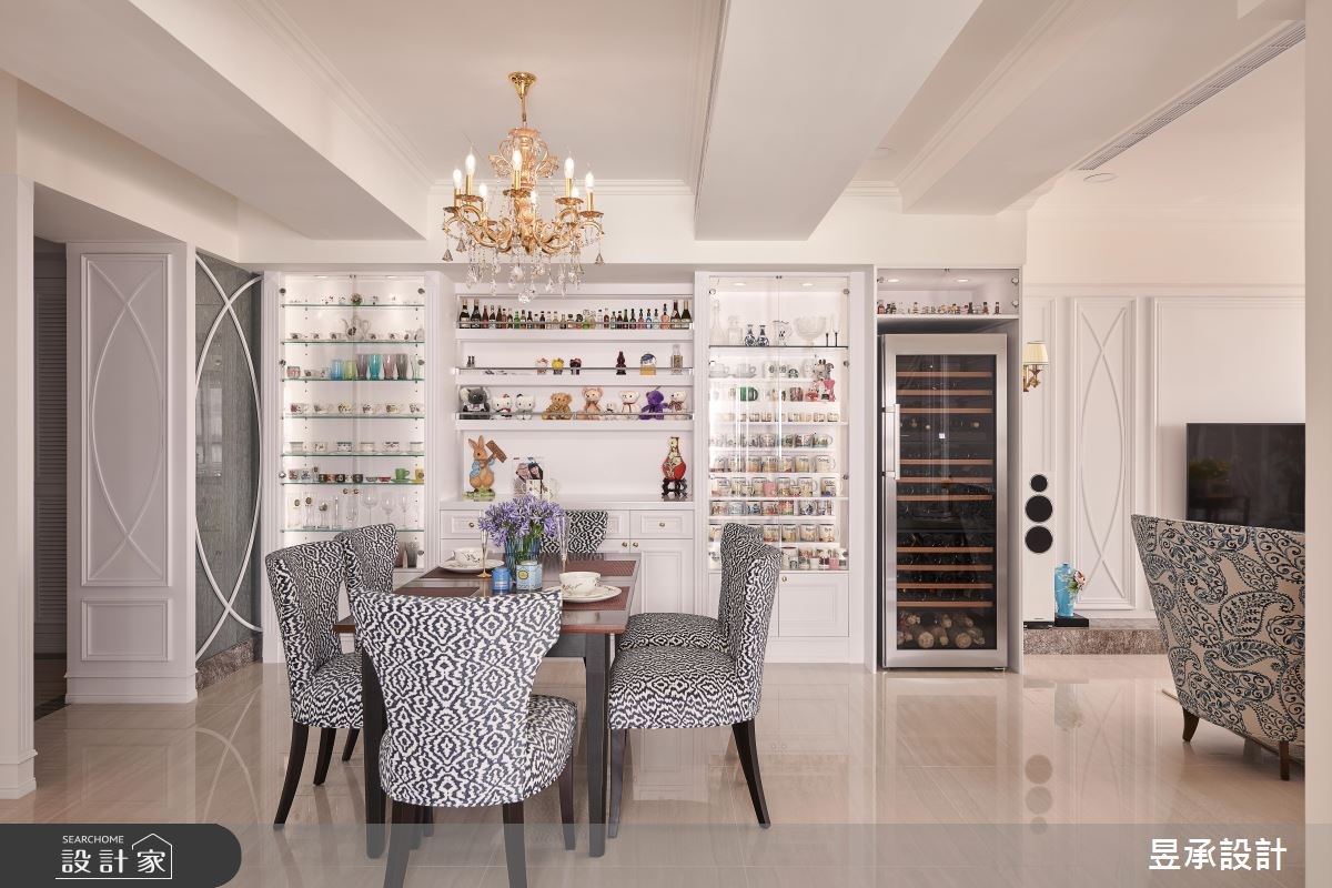 60 坪的新古典大宅,以屋主最喜愛的新古典風格為基調,搭配著做工精緻的家具、材質、工藝細節,呈現出大器而華麗的居家樣貌,並透過適度的留白,在生活和裝飾表現之間取得和諧的平衡。 從玄關處開始便開啟了華麗序幕,玄關牆面以菱形鏡面切割,再搭配線板外框佐飾、黑絨繃布坐墊等,營造大器奢華的質感。公共空間包涵客廳、書房、餐廳等功能性,採開放式設計的空間更在天花板加入黑鏡及層疊的線板裝飾,使空間更顯挑高;電視牆則運用黑鏡、天然石材的異材質混搭,外部加入雙層畫框線板和古典雕花明鏡,在沉穩大器中,也融入了細膩精緻的新古典內涵。 餐廳與餐廚之前,藉由玻璃雙開拉門,達到開放、隱私的彈性轉換,也達到了延伸空間感的視覺效果,餐廳加設水晶吊燈營造奢華餐飲氛圍,一旁的古典雕花壁板及鏡面設計,則巧妙地隱藏了盥洗區的入口。主臥室運用線板、銀藍色壁紙打造出低調優雅的氛圍,床頭處並隱藏收納空間,創造實用效益;小孩房則以精緻亮麗的壁紙塑造視覺焦點,搭配書桌、收納等配置,豐富私領域空間的機能性。 小編的最愛 書房色彩以簡約的黑白灰色彩為主軸,提升空間的時尚感,後方並安排有開放式的展示櫃體,使屋主的精心收藏成為生活中的華麗風景。