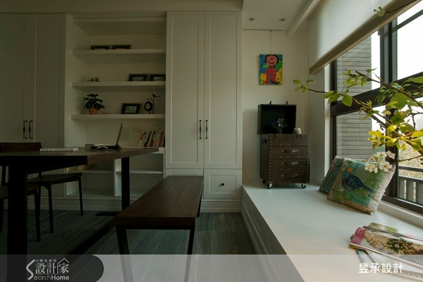這個家緊臨河濱公園,環境十分幽靜,放眼望去屋外盡是一片綠意盎然,如何將戶外令人愉悅放鬆延攬入內,即是這個空間的設計重點之一。預售客變時已稍微縮減餐廳空間,將女兒房變大,同時將客廳與書房之間的隔間牆取消,塑造公共空間在視覺上的寬敞感。家是輕鬆沒有壓力的。為了使居家生活能充份的卸下工作上的壓力,讓回家成為一天幸福生活的開始,女主人希望我們在美式風格的基調上,幫她打造一個能將戶外自然景致引納入室,讓全家人都能充份享受自然、休閒以及富有童趣的居家空間。整個空間的設計發想,是從玄關的樹型黑鐵件屏風開始,樹上是象徵家人快樂相處的四隻鳥,地上踩著具石材粗糙質樸質感的地磚,牆面則妝點著趨於大自然的色彩及壁紙,配搭著具有自然印象的燈飾、豐富多元的燈具迴路,以及富含自然、休閒與童趣的繪畫壁飾、抱枕和家飾品,在達成屋主的美式自然休閒趣味的居家夢想外,更希望從空間設計到室內軟件,昱承都能傳遞出一份享受自然、輕鬆生活的幸福語彙。主要建材:實木線板、強化烤漆玻璃、低甲酫木料建材、無毒環保漆、進口石材地磚、系統家具、超耐磨木地板、南方松木地板、進口壁紙、進口窗簾布及風琴簾。