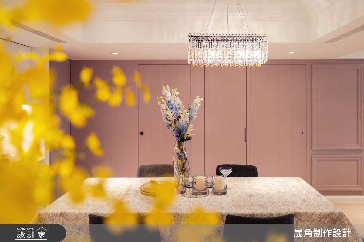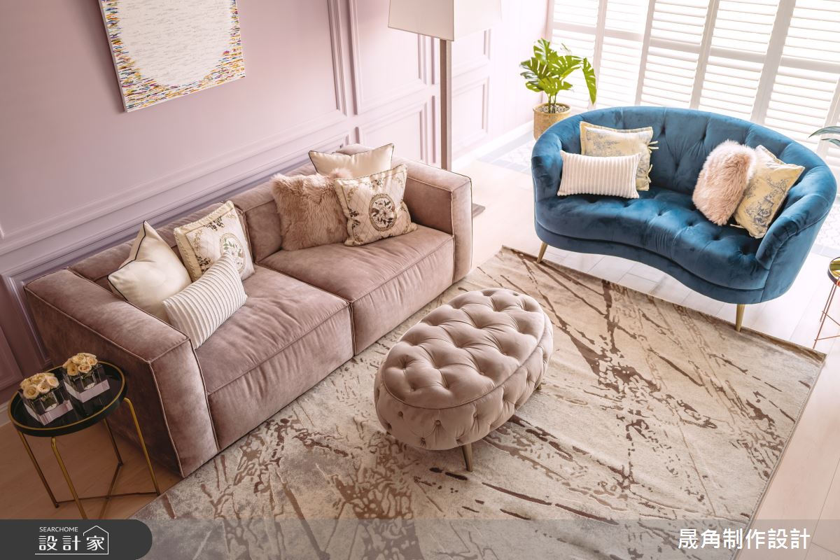 晟角制作設計以海島型木地板、大理石、黃金鏡的搭配應用,呈現飯店風居家氛圍,將此間30坪、兩房、單層、新成屋(5年以下)打造成舒適愜意的家庭空間,完成2位大人全家人的夢想之居。