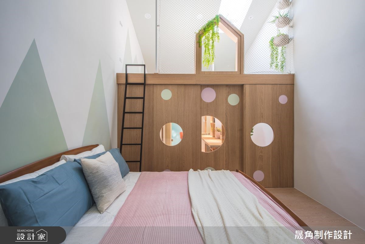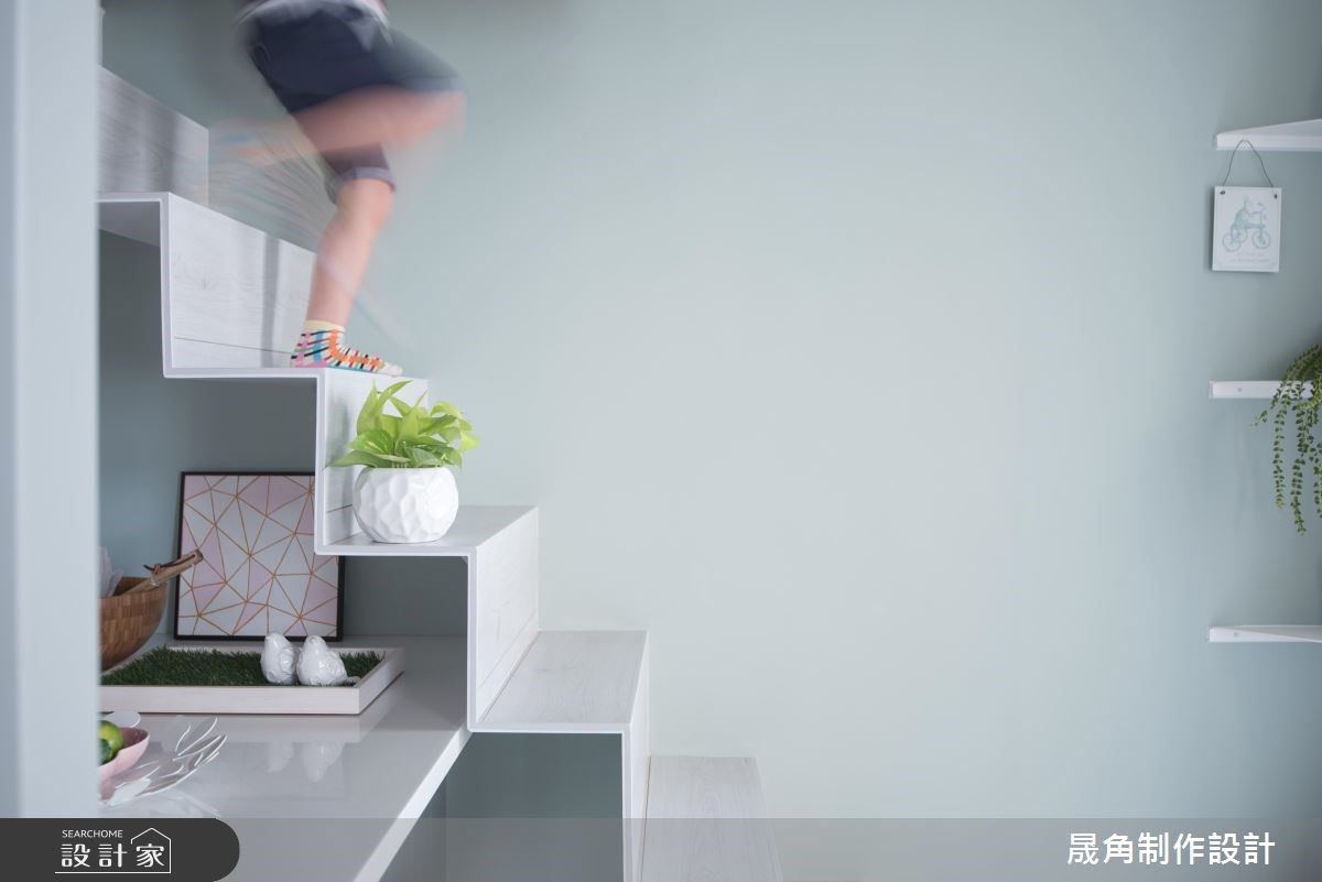 坪數雖然不大,但不代表生活就得處處受限!這處為小家庭打造的 26 坪北歐風樓中樓,經由晟角制作的規劃改造,設計師減去了複雜厚重的設計,並以柔和甜美的色調,以及輕薄的鐵件造型,營造出輕盈又舒適的空間感,讓小空間也能很好住! 取代客廳,設計師以中島餐桌做為家的互動中心,父母親可以隨時環顧四周,照看到孩子的活動。以輕薄造型製作的樓梯,善用下方開放區域,增加冰箱家電的收納,搭配系統櫃,讓女主人的鍋具收藏也有了充足的儲物區。整面的收納櫃不僅具收納功能,更特別加入淺木色的幾何圖形鏤空,成為孩子最愛的遊戲區。窗戶和門框則以圓拱造型相互呼應,成為充滿活潑童趣的獨特亮點,加上百葉窗設計,更富有北歐風情。考量到孩子的健康,特別選擇無甲醛乳膠漆,通往小閣樓的梯階旁則加入了黑板漆,讓孩子的創意可以盡情揮灑,主臥室則以沉穩的灰藍色為主調,搭配簡約床具、桌椅,營造舒眠沉靜的空間氛圍。 小編的最愛 櫃體特別加入了幾何鏤空設計,不僅挹注了活潑趣味性,也有實用性,櫃體上較大的圓孔具備通風、透氣功能,較小的圓孔則可當作把手使用。