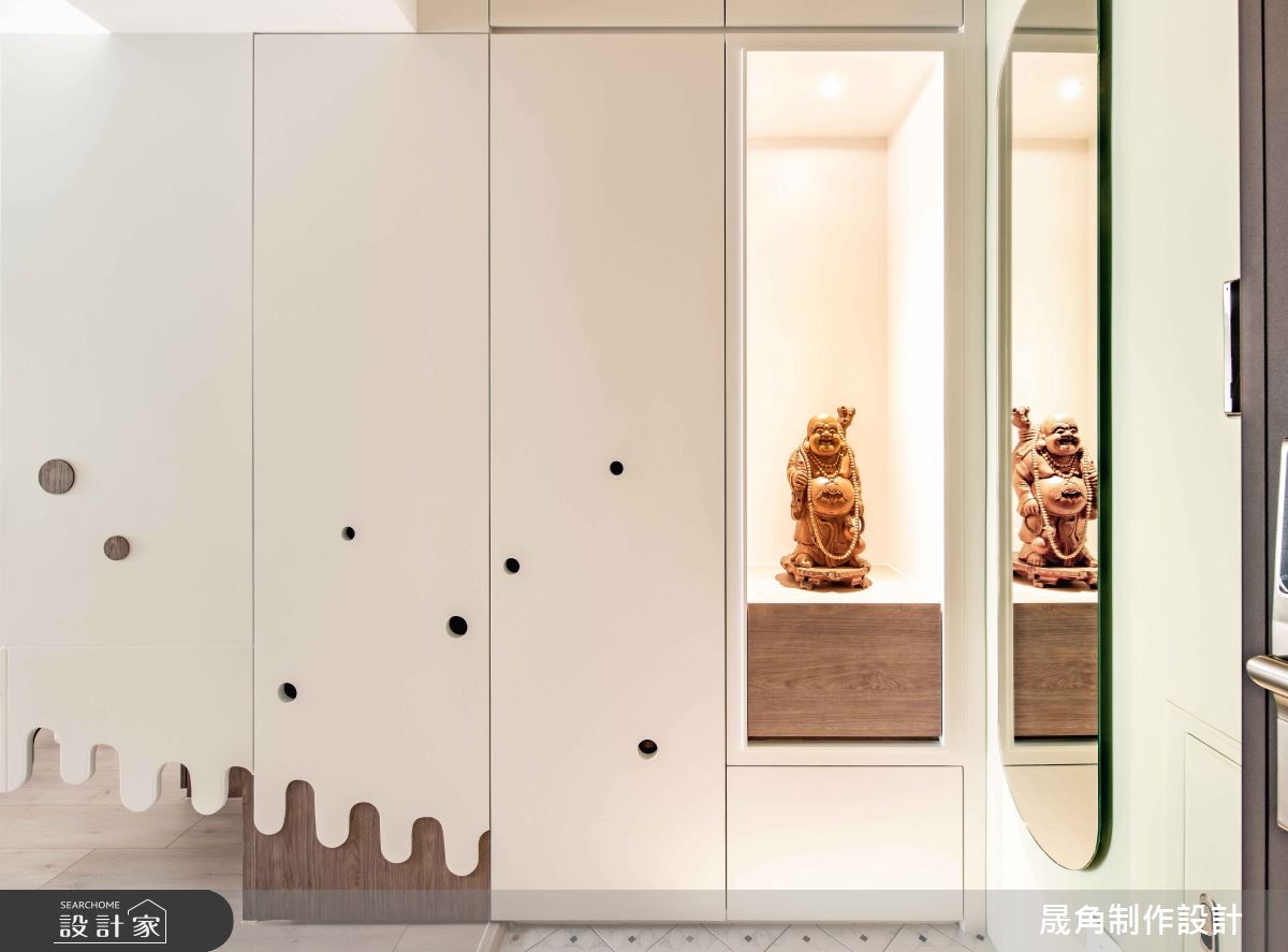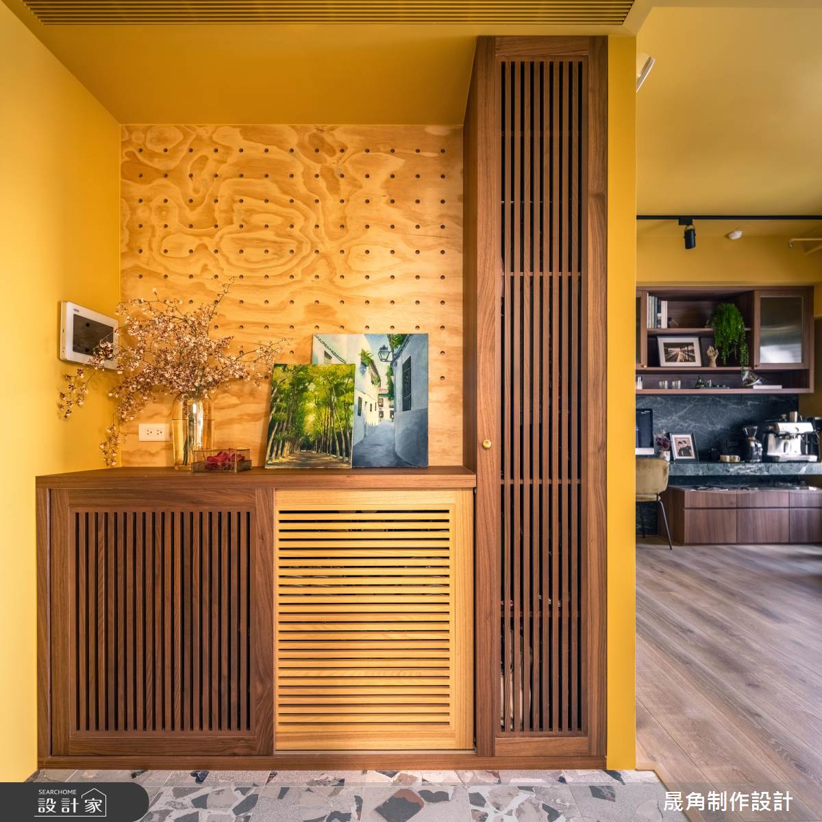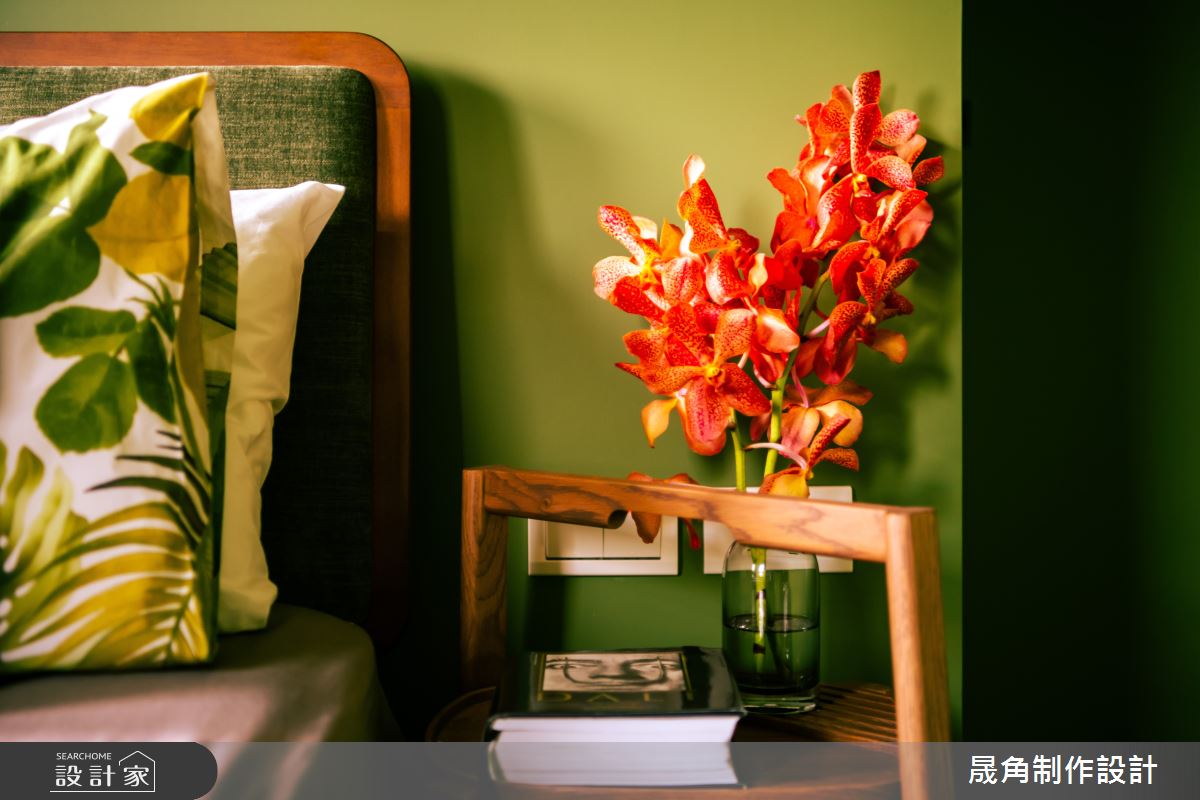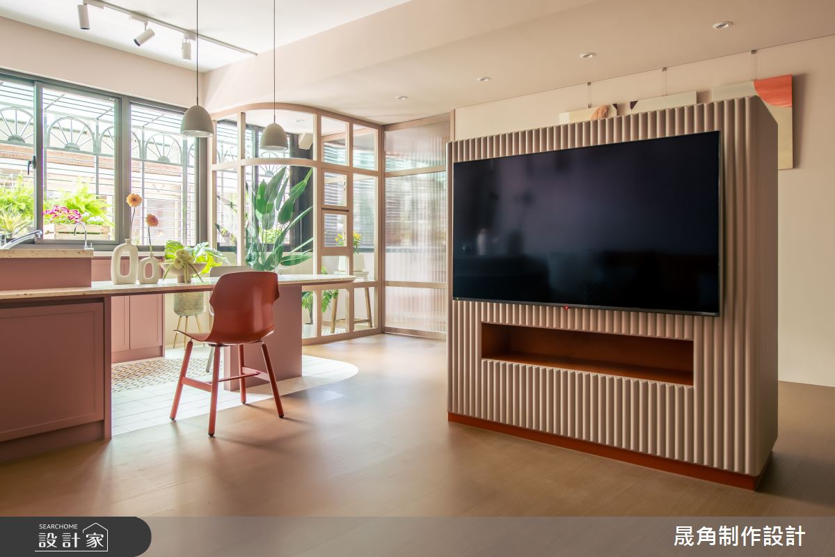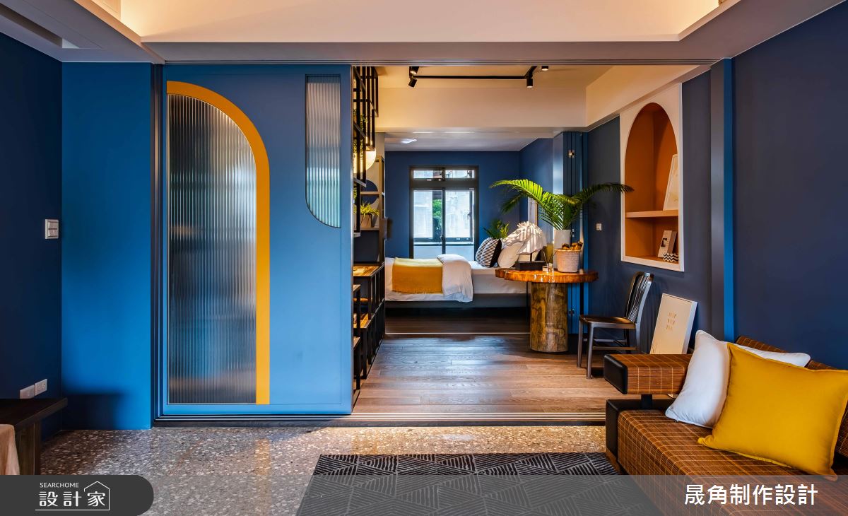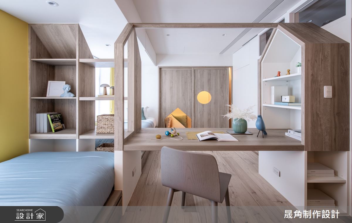 北歐風格有多百變?從這間36坪大的居家色彩搭配就能瞬間了解!跳脫住宅對立面以及場域劃分的常態設計,牆面不再只有規矩的垂直水平交集,圓弧拱門讓空間過場變得充滿趣味,而繽紛的色彩把室內空間變成了主題樂園,大人小孩穿梭其內,體驗一起居家生活的趣味。 推開住宅大門,一道莓果色牆面開啟了破格設計的第一步,斜切牆面將視線引導到室內,大膽的橘藍撞色沙發與白牆上的現代掛畫承接活潑的意象,從正面看去又是一個獨立的特色端景。客廳與餐廳間的過場不是藉由地坪轉換或是單純的開放式設計,而是利用圓弧造型與清爽的薄荷綠來界定空間機能;視線穿越弧形拱門像是從萬花筒看去,每轉一面都帶來驚喜。兩個孩子共用寢居空間藉由特色木作設計把空間分成兩邊,結合收納與書桌橫越寢室打造出各自專屬的天地卻又能隨時打成一片。夫妻休息的寢居空間則是以墨綠為主色,加入壁花與亮黃撞色概念,詮釋屬於大人的藝術品味,將從事創意產業的夫妻生活融入家庭,與家人共享生活中獨特的「藝意」。 小編的最愛 雖然僅兩房的格局讓孩子們必須共享一個空間,但用家的剪影打造出書桌以及收納系統讓一間房擁有超越兩倍的樂趣;向日葵黃讓空間變得亮眼,門片上挖空的幾何圖形反應滿滿的童趣,破除空間帶來的限制,和手足一同成長享受一起生活的點滴。
