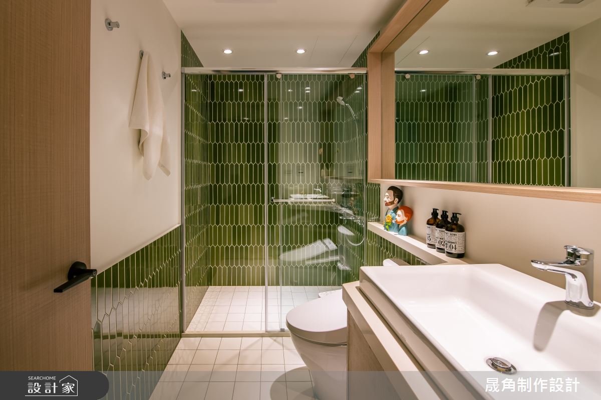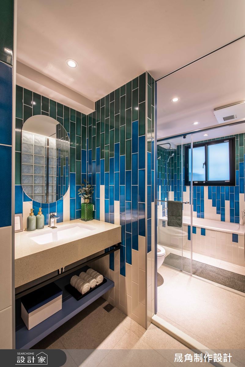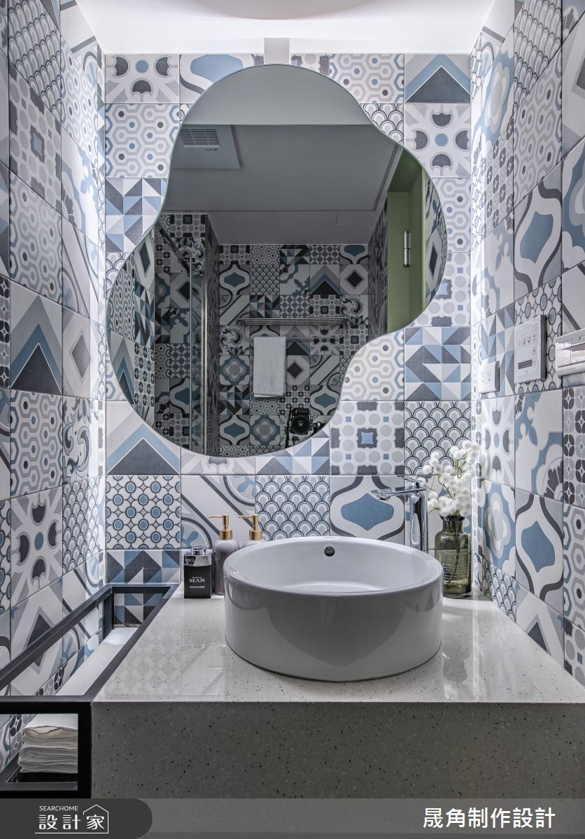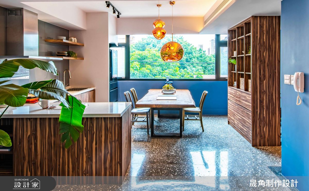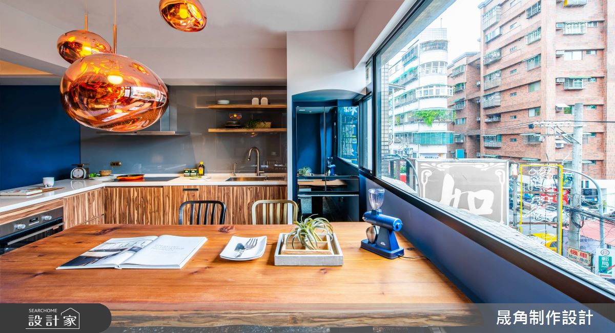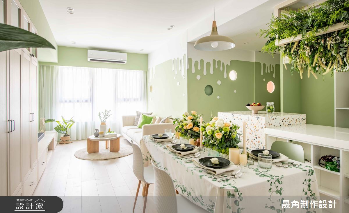 晟角制作設計以乳膠漆、磁磚、蛇紋石、進口磁磚的搭配應用,呈現混搭風居家氛圍,將此間20坪、兩房、單層、新成屋(5年以下)打造成舒適愜意的家庭空間,完成2位大人的夢想之居。