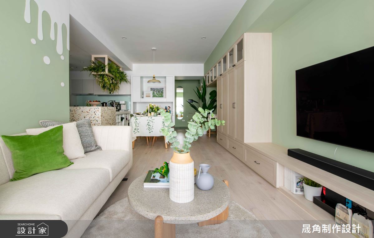 本案為晟角制作設計的32坪北歐風新成屋(5年以下)設計作品,格局為單層兩房的居住空間。全室建材的搭配,應用超耐磨木地板、義大利水磨石、木紋,展現溫馨的居家氛圍。