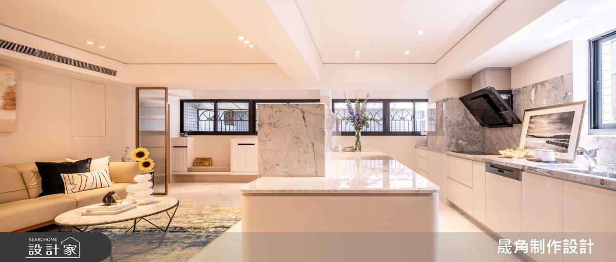來自晟角制作設計的40坪飯店風住宅案,屋主一家人共有2位大人、3位小孩,是一間單層老屋(16~30年)的四房格局,設計師藉由建材以美國乳膠漆、諾斯亞灰大理石、卡拉拉大理石的搭配應用,實現一家人的理想生活。