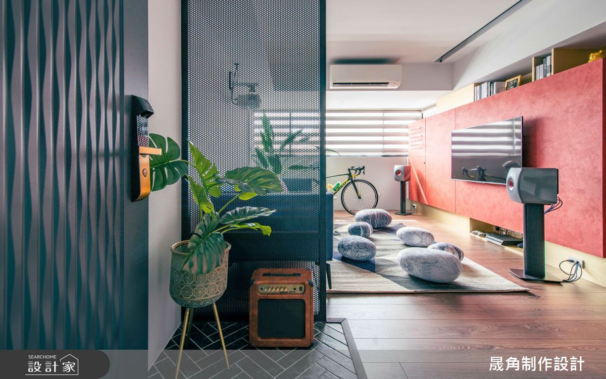 本案為晟角制作設計的55坪混搭風新成屋(5年以下)設計作品,格局為單層三房的居住空間。居住成員包含2位大人。全室建材的搭配,應用鐵件、烤玻、MDF板,展現溫馨的居家氛圍。