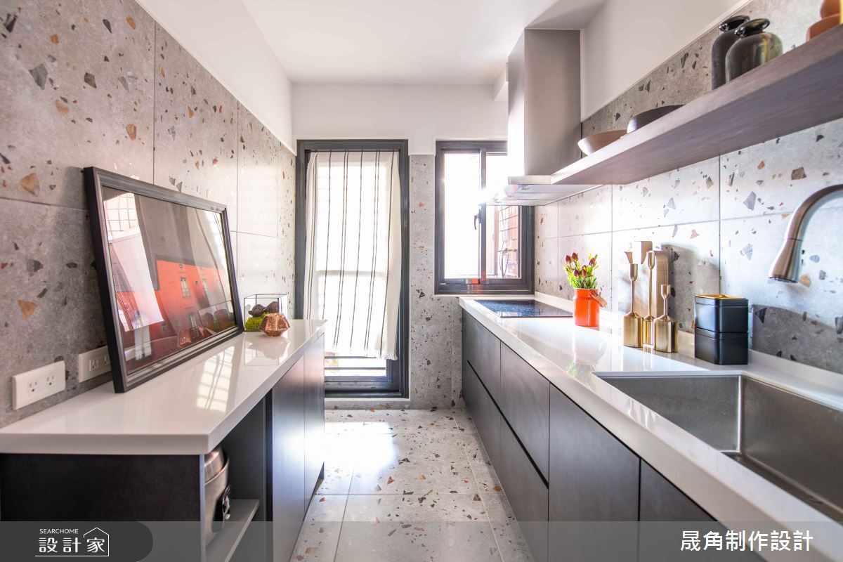 晟角制作設計以乳膠漆、磁磚、蛇紋石、進口磁磚的搭配應用,呈現混搭風居家氛圍,將此間20坪、兩房、單層、新成屋(5年以下)打造成舒適愜意的家庭空間,完成2位大人的夢想之居。