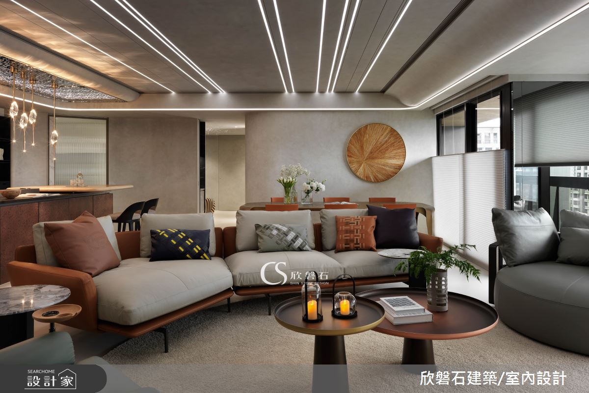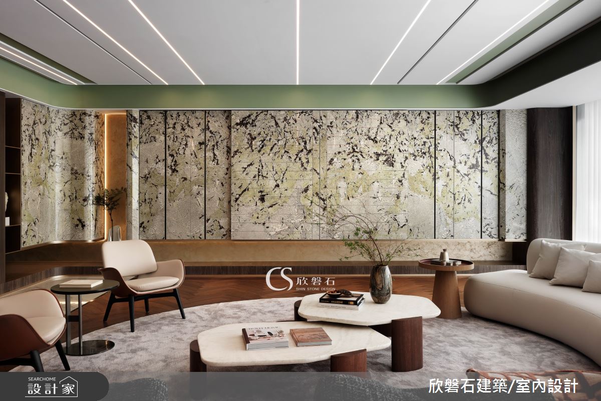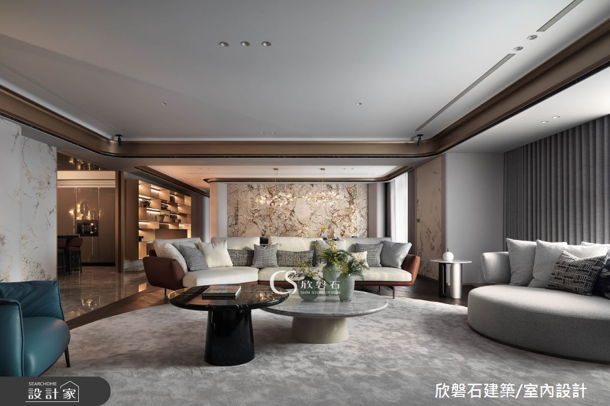 欣磐石建築.空間規劃以鐵件、鍍鈦金屬、大理石、實木皮、茶鏡、薄片的搭配應用,呈現現代風居家氛圍,將此間92坪、兩房、單層、新成屋(5年以下)打造成舒適愜意的家庭空間,完成2位大人全家人的夢想之居。