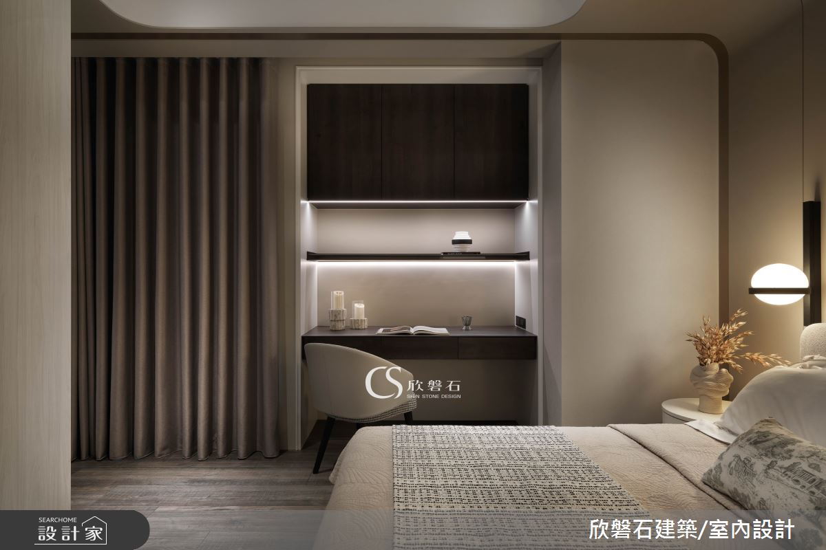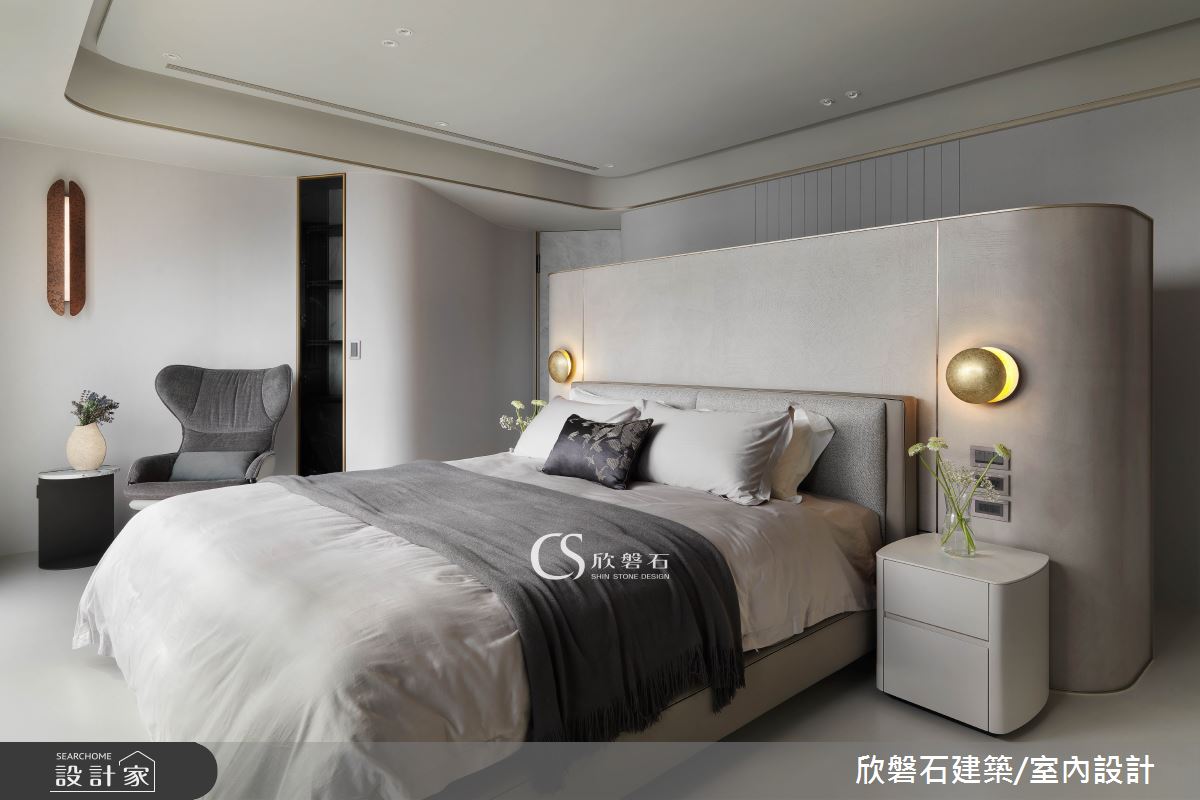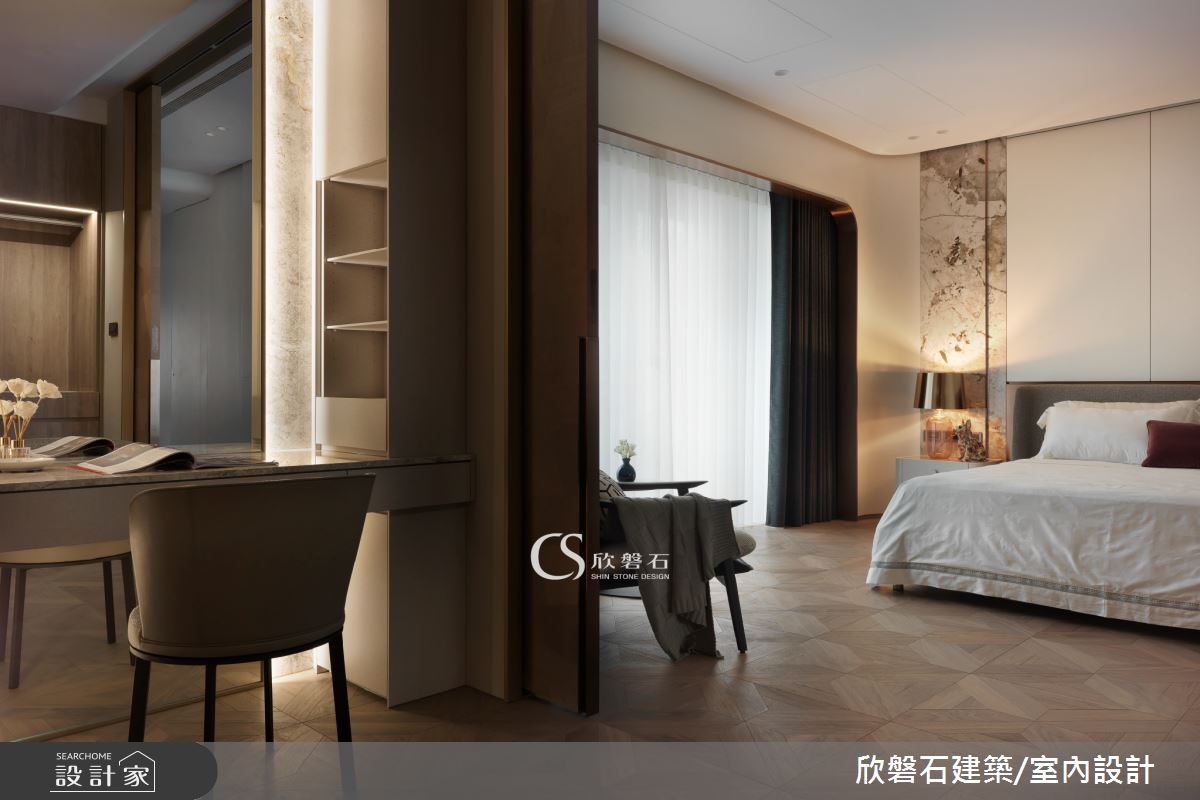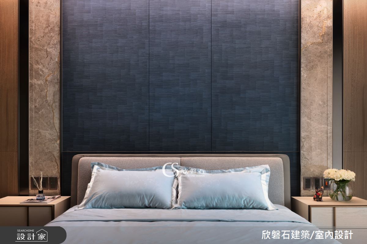 欣磐石建築.空間規劃以壁紙、藝術塗料、海島型木地板、大理石、藝術大板磚、不鏽鋼、鐵件、灰鏡、鍍鈦金屬、木作貼皮、烤漆、壓克力、鋼刷木皮、系統板材、石英磚/拋光石英磚、磁磚、賽麗石、石材、繃布、噴漆、水泥漆的搭配應用,呈現現代風居家氛圍,將此間97坪、兩房、單層、毛胚屋打造成舒適愜意的家庭空間,完成2位大人全家人的夢想之居。