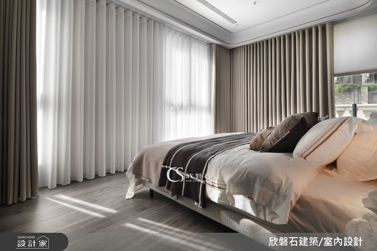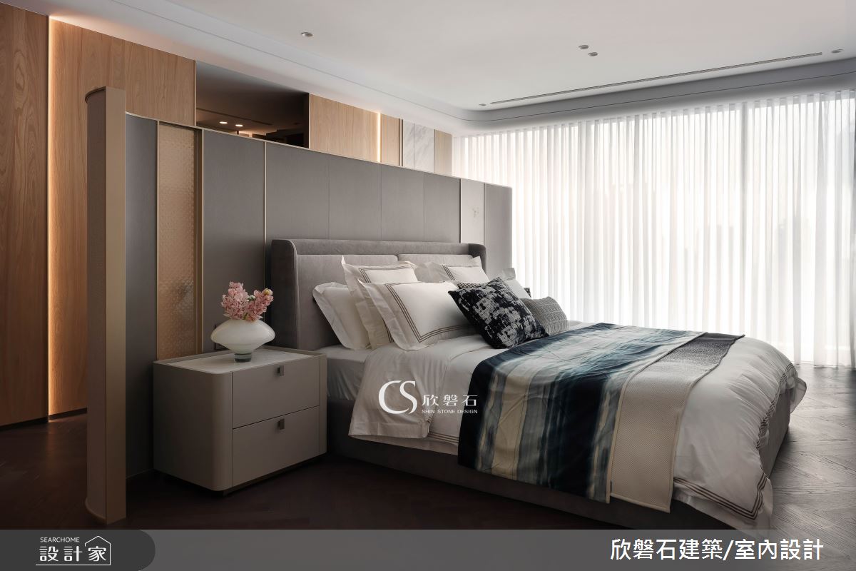 由欣磐石建築.空間規劃精心規劃的95坪三房住宅空間,家庭成員一共有2位大人、2位長輩。因應屋主需求,設計師運用混搭風作為主軸,搭配油漆、乳膠漆、壁紙、海島型木地板、超耐磨木地板、石英磚/拋光石英磚、鐵件、灰鏡、茶玻、烤玻、鍍鈦金屬、木作貼皮、烤漆、壓克力、鋼刷木皮、系統板材、大理石、磁磚、賽麗石、石材、噴漆,打造全家人的夢想家居。