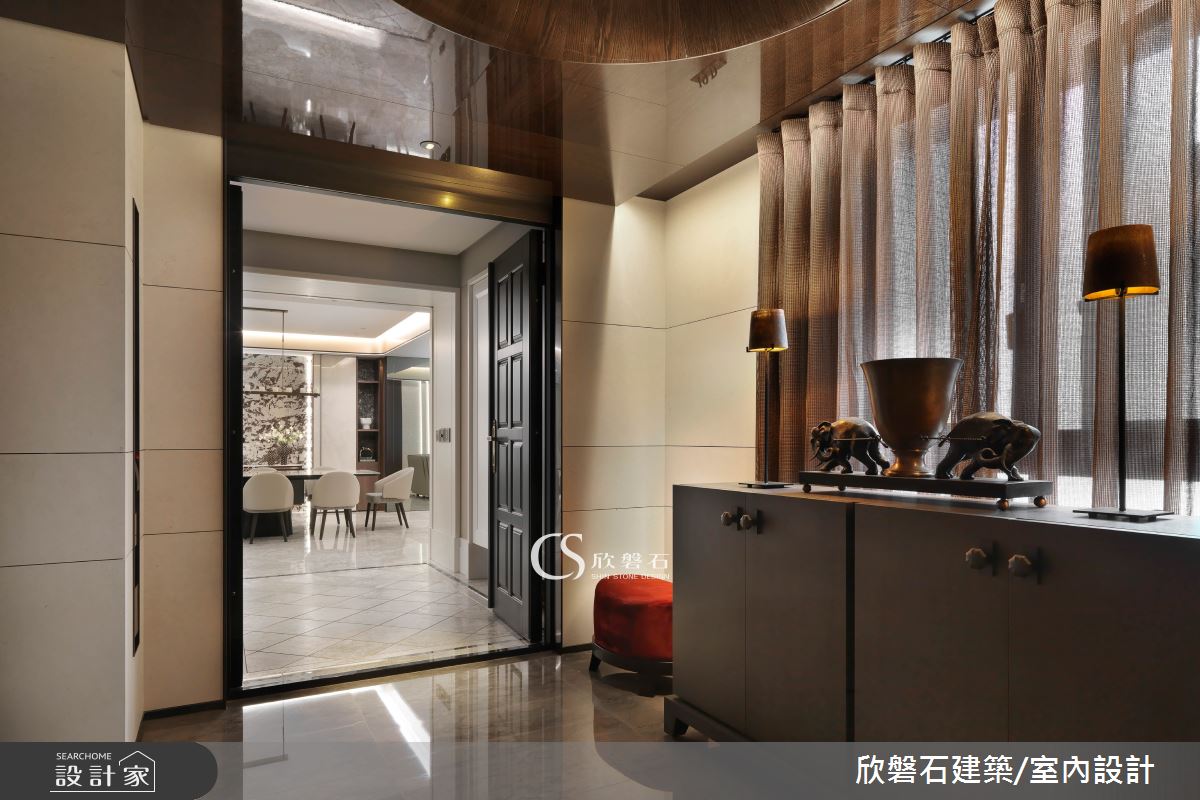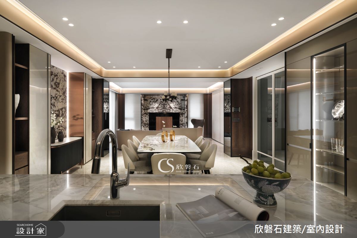來自欣磐石建築.空間規劃的64.5坪新古典住宅案,屋主一家人共有2位大人、2位小孩,是一間單層中古屋(5~15年)的三房格局,設計師藉由建材以大理石、鋼刷木皮、繃布、線板、皮革、系統板材、石材、壁紙、鐵件、鍍鈦金屬、超耐磨木地板、磁磚、灰鏡、噴砂玻璃、特殊塗料、木作貼皮的搭配應用,實現一家人的理想生活。