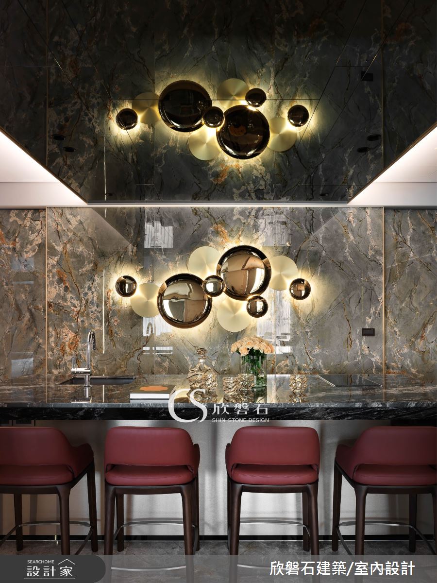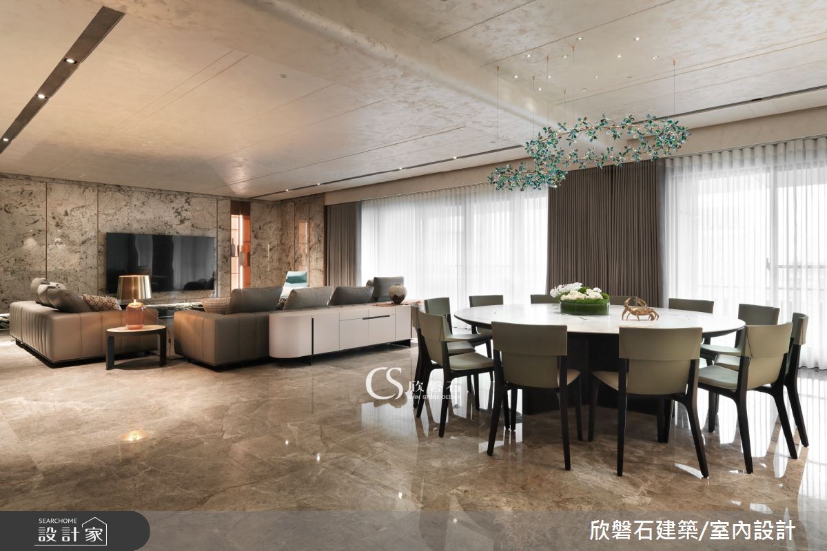 由欣磐石建築.空間規劃精心規劃的70坪四房住宅空間,家庭成員一共有2位大人、2位小孩。因應屋主需求,設計師運用現代風作為主軸,搭配大理石、盤多磨、鐵件、灰鏡、鍍鈦金屬、烤漆、系統板材、磁磚、特殊漆,打造全家人的夢想家居。