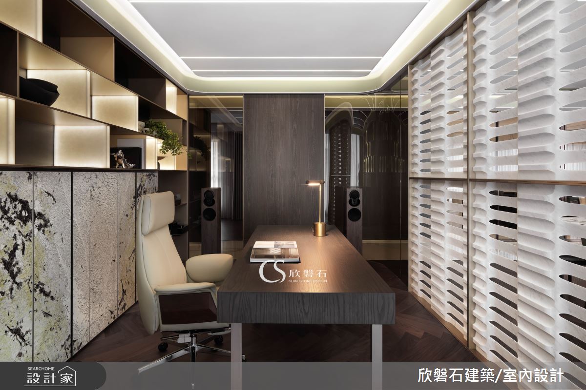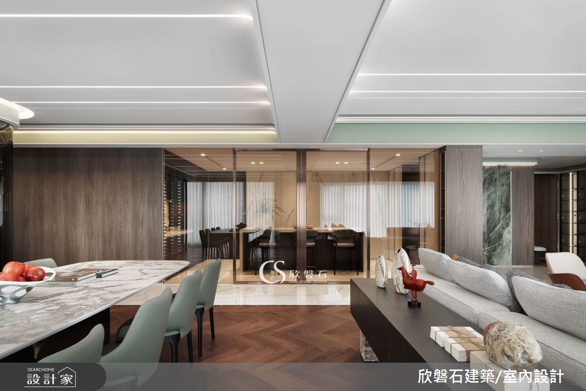 由欣磐石建築.空間規劃精心規劃的94坪四房住宅空間,家庭成員一共有4位大人。因應屋主需求,設計師運用現代風作為主軸,搭配海島型木地板、鍍鈦金屬、烤漆、系統板材、石材,打造全家人的夢想家居。