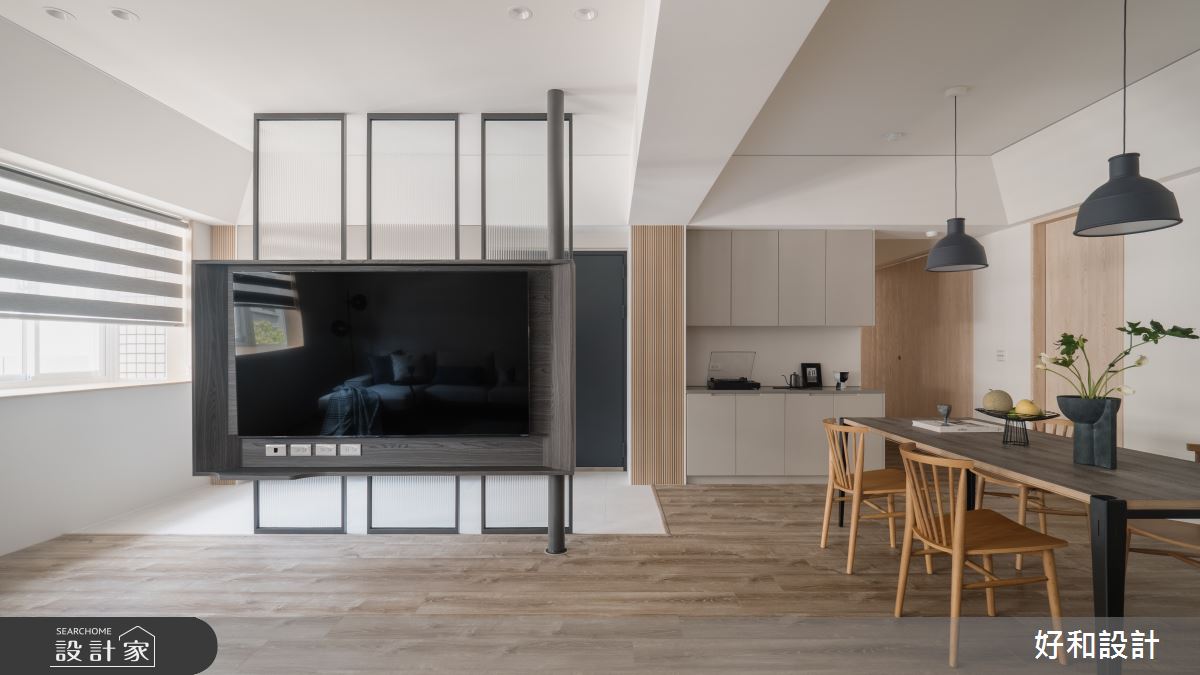 好和設計以乳膠漆、鐵道磚、超耐磨木地板、鐵件、灰鏡、木作貼皮、系統板材、木百葉、人造石、藝術塗料、藝術水泥、木作格柵、琺瑯板的搭配應用,呈現混搭風居家氛圍,將此間33坪、三房、單層、預售屋打造成舒適愜意的家庭空間,完成2位大人、1位小孩全家人的夢想之居。