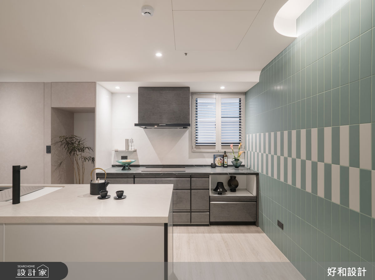 來自好和設計的24坪現代風住宅案,屋主一家人共有2位大人、2位小孩,是一間單層老屋(31~40年)的三房格局,設計師藉由建材以乳膠漆、鐵道磚、鐵件、木作貼皮、系統板材、磁磚、木百葉、人造石、軌道燈、烤玻的搭配應用,實現一家人的理想生活。