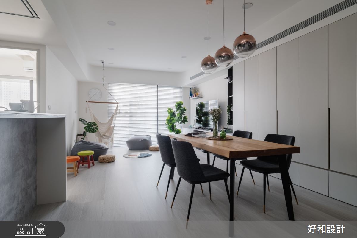 好和設計以乳膠漆、六角磚/蜂巢磚、超耐磨木地板、烤玻、木作貼皮、人造石、軌道燈、噴漆的搭配應用,呈現現代風居家氛圍,將此間40坪、四房、單層、新成屋(5年以下)打造成舒適愜意的家庭空間,完成2位大人、2位小孩全家人的夢想之居。