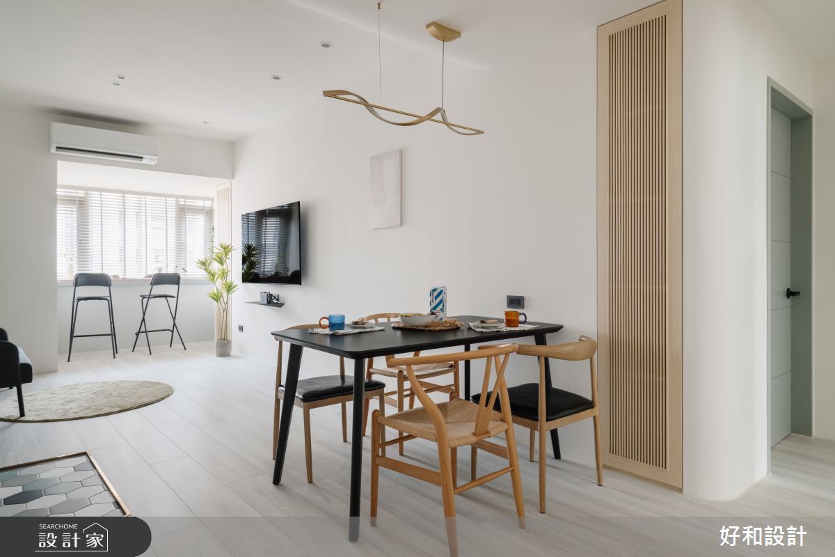 由好和設計精心規劃的17坪兩房住宅空間,家庭成員一共有2位大人、1位小孩。因應屋主需求,設計師運用北歐風作為主軸,搭配乳膠漆、鐵道磚、花磚、超耐磨木地板、鐵件、烤玻、木作貼皮、木百葉、人造石、軌道燈,打造全家人的夢想家居。