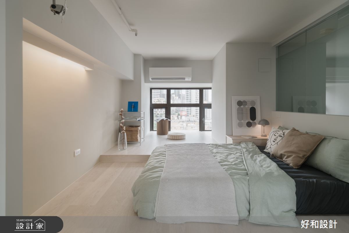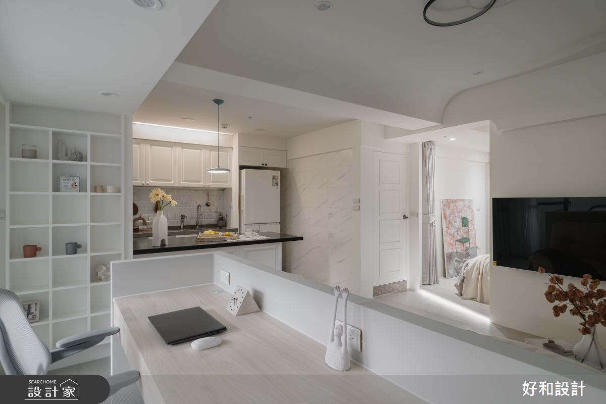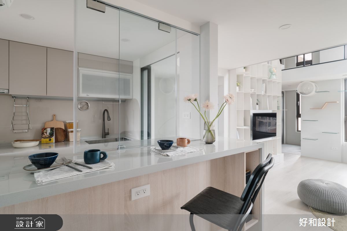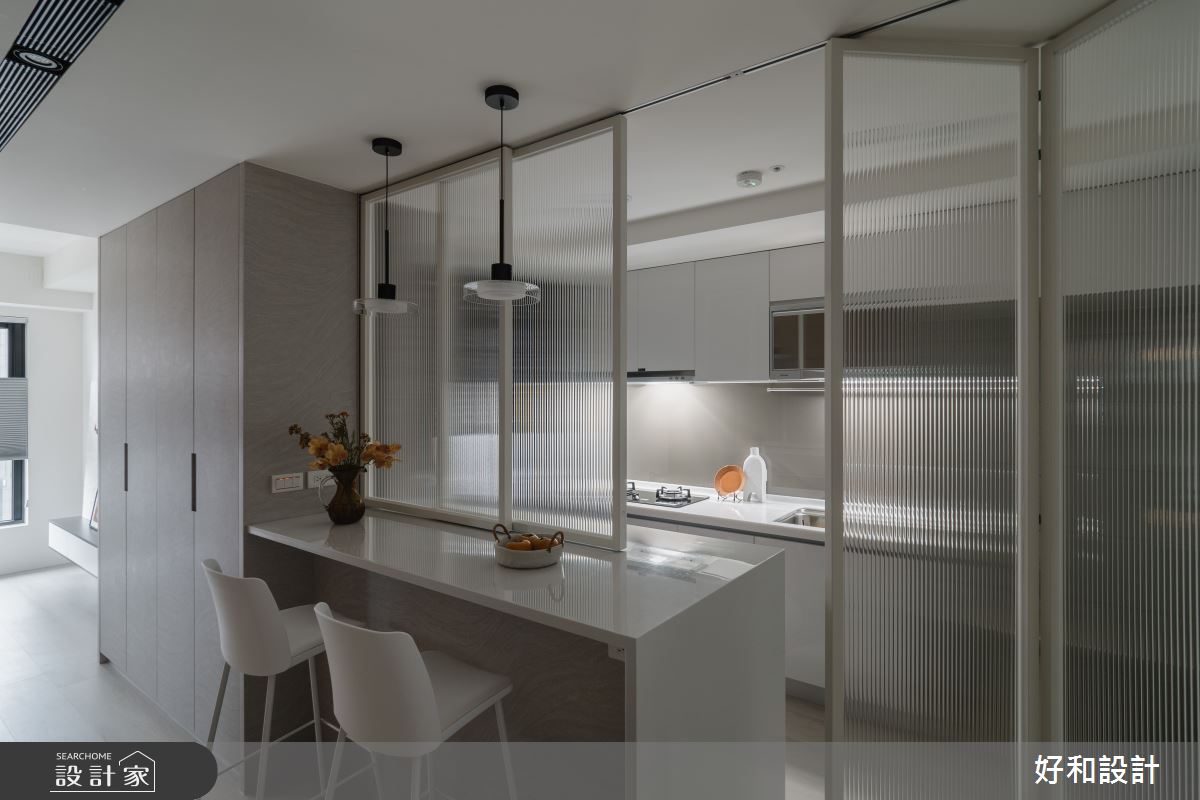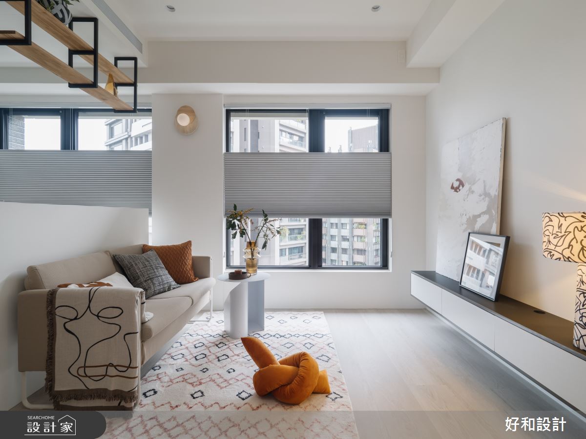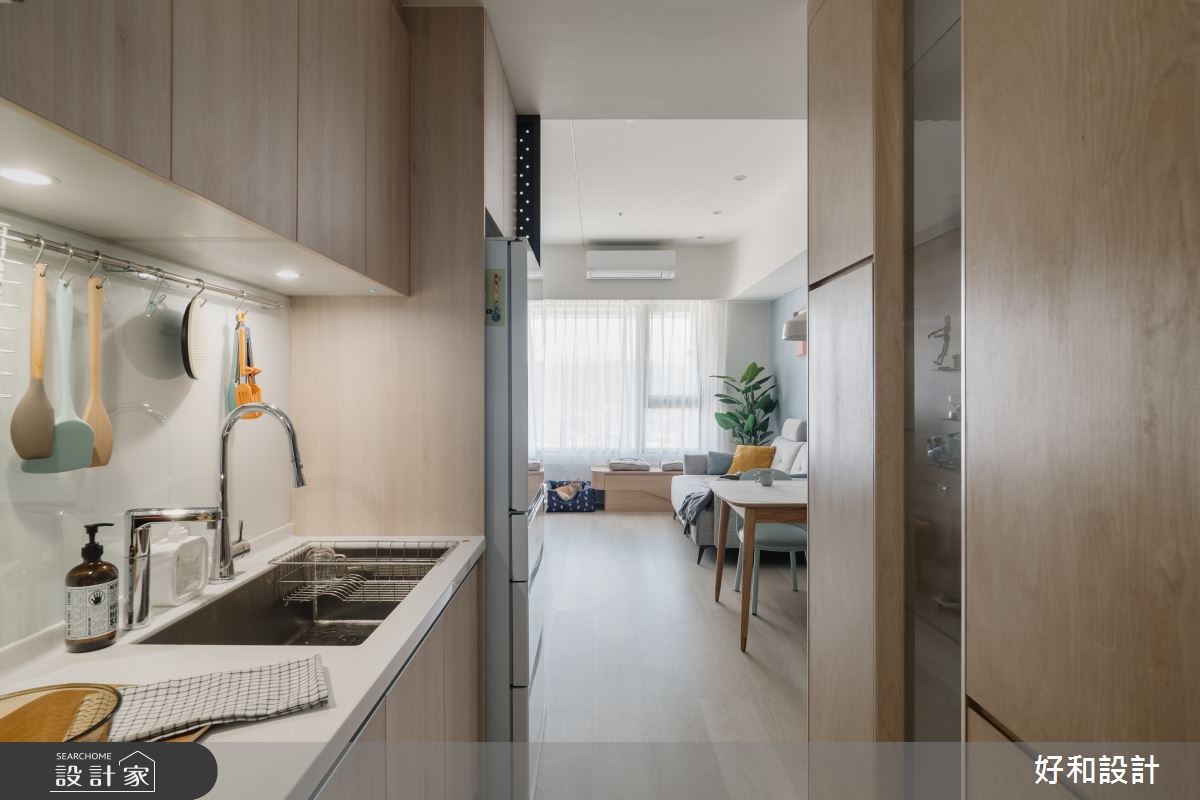 由好和設計精心規劃的16坪一房住宅空間,家庭成員一共有2位大人。因應屋主需求,設計師運用混搭風作為主軸,搭配乳膠漆、噴漆、超耐磨地板、小冰柱玻璃、類木皮科技板、磁磚、托來多石紋六角磚、平光鐵道磚、紗簾、遮光簾、系統板,打造全家人的夢想家居。