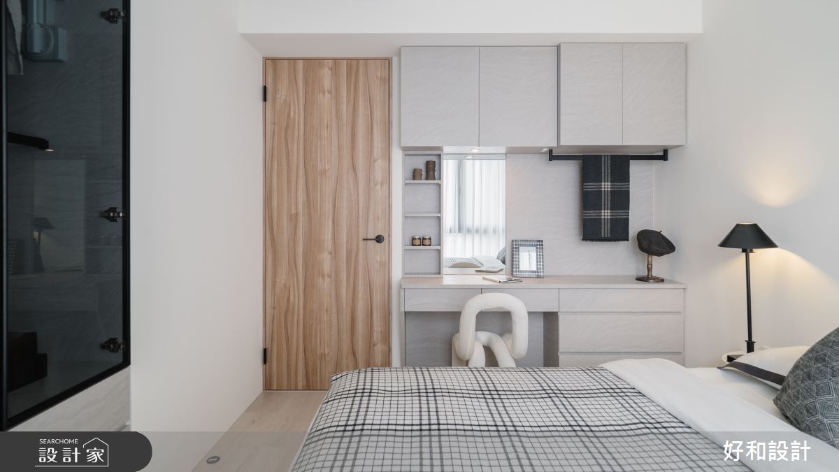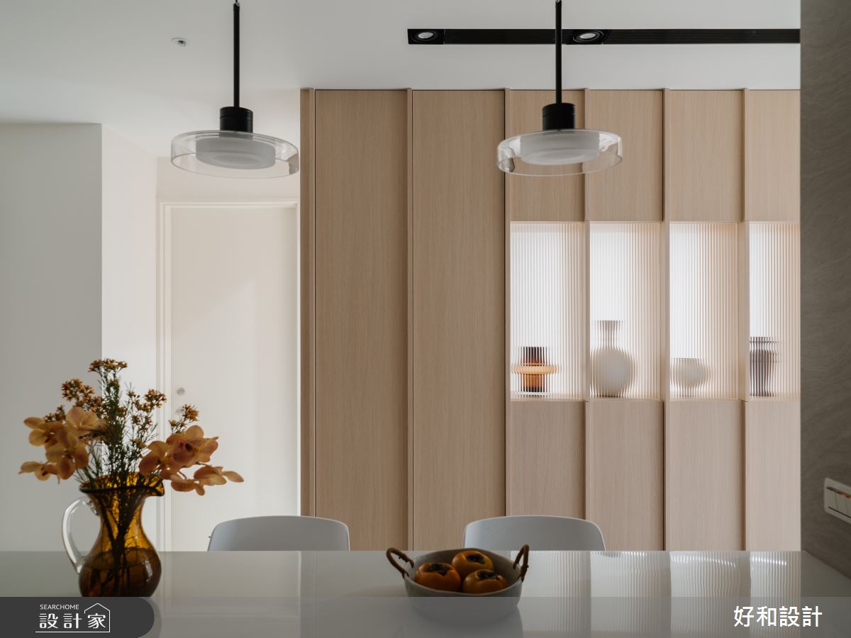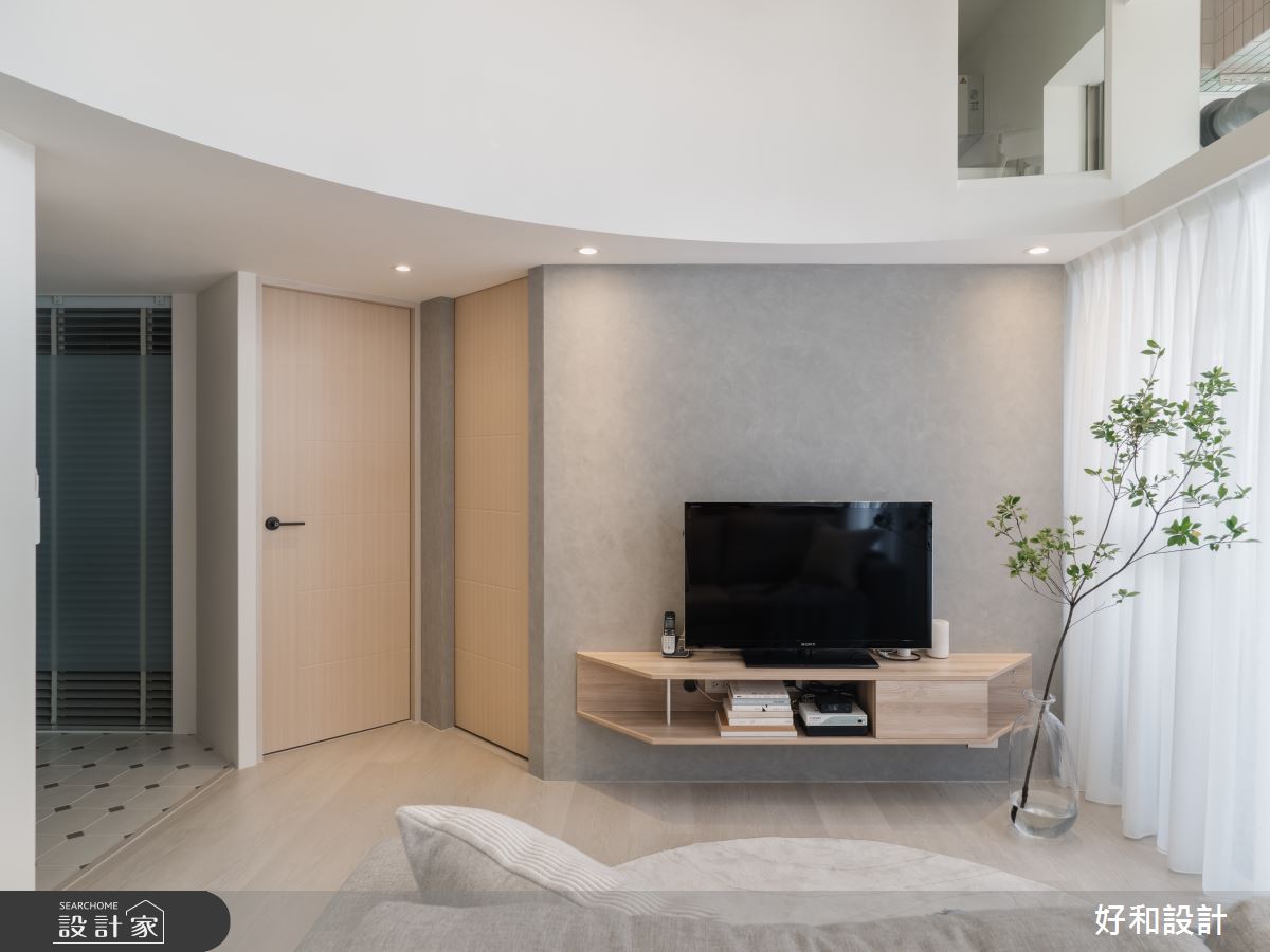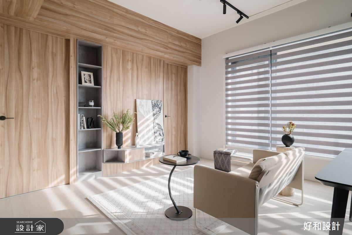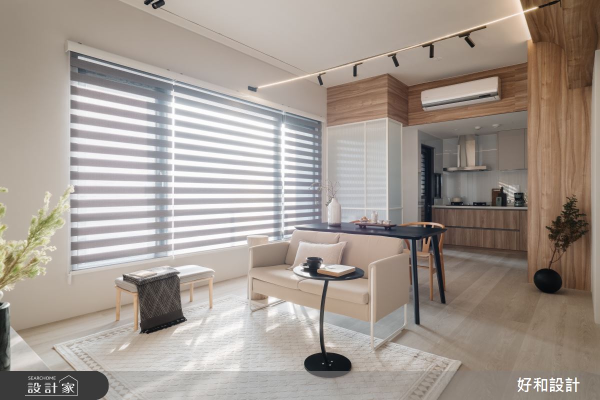 好和設計以乳膠漆、班傑明摩爾、BAUSEN超耐磨地板、人造石、長虹玻璃、類木皮科技板、格柵、浮雕科技古典橡木、風巢簾、系統板、波特蘭砂岩的搭配應用,呈現簡約風居家氛圍,將此間14坪、一房、單層、新成屋(5年以下)打造成舒適愜意的家庭空間,完成1位大人全家人的夢想之居。